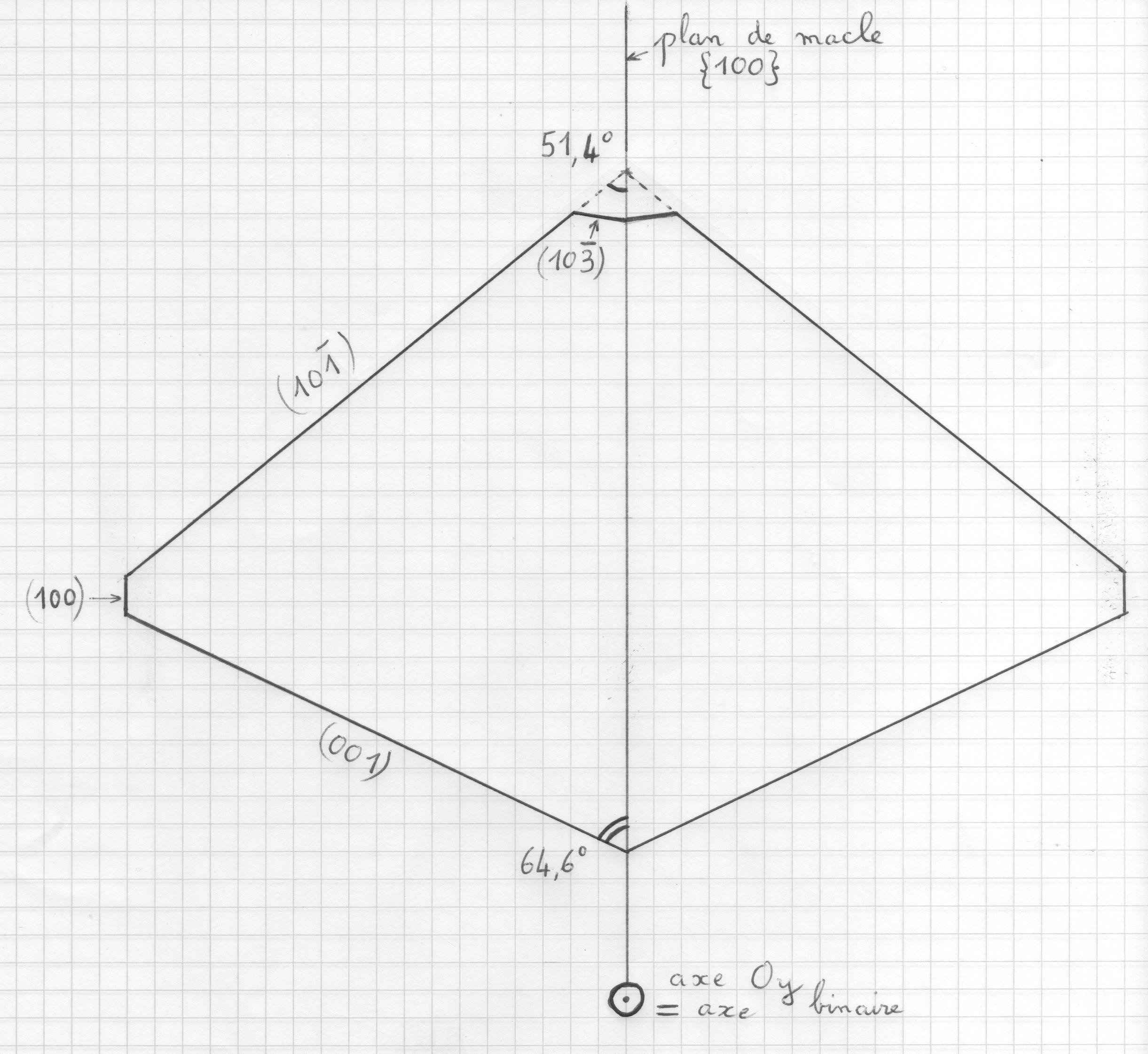 NB: à la précision de mes mesures, l'identification des deux faces latérales notées (502) reste incertaine: il pourrait s'agir d'une face intermédiaire entre (502) et (301), par exemple (803). En fait, la photo montre que ces faces sont quelque peu irrégulières, du fait de la présence de cannelures: leur orientation globale est la résultante macro d'une alternance de petites faces (301) dominantes et de microdécrochements "parasites". Je considère aujourd'hui qu'il s'agit de faces (301) gauchies par des cannelures.