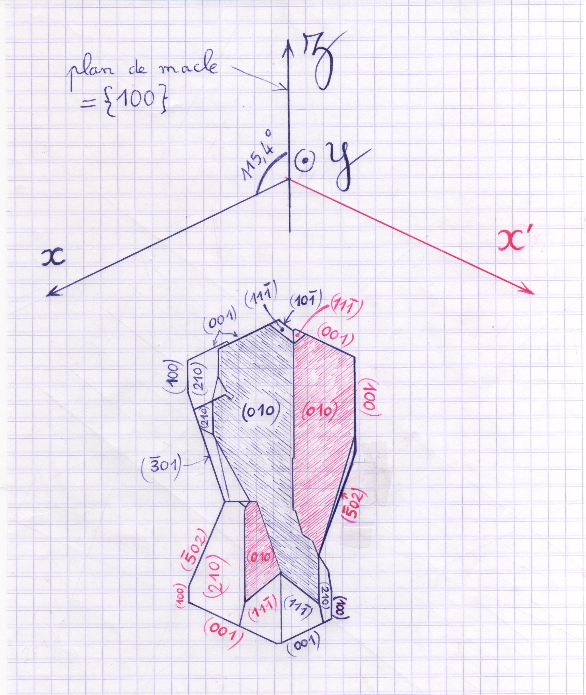 Noter la pseudosymétrie vaguement orthorhombique du cristal pris dans son ensemble.