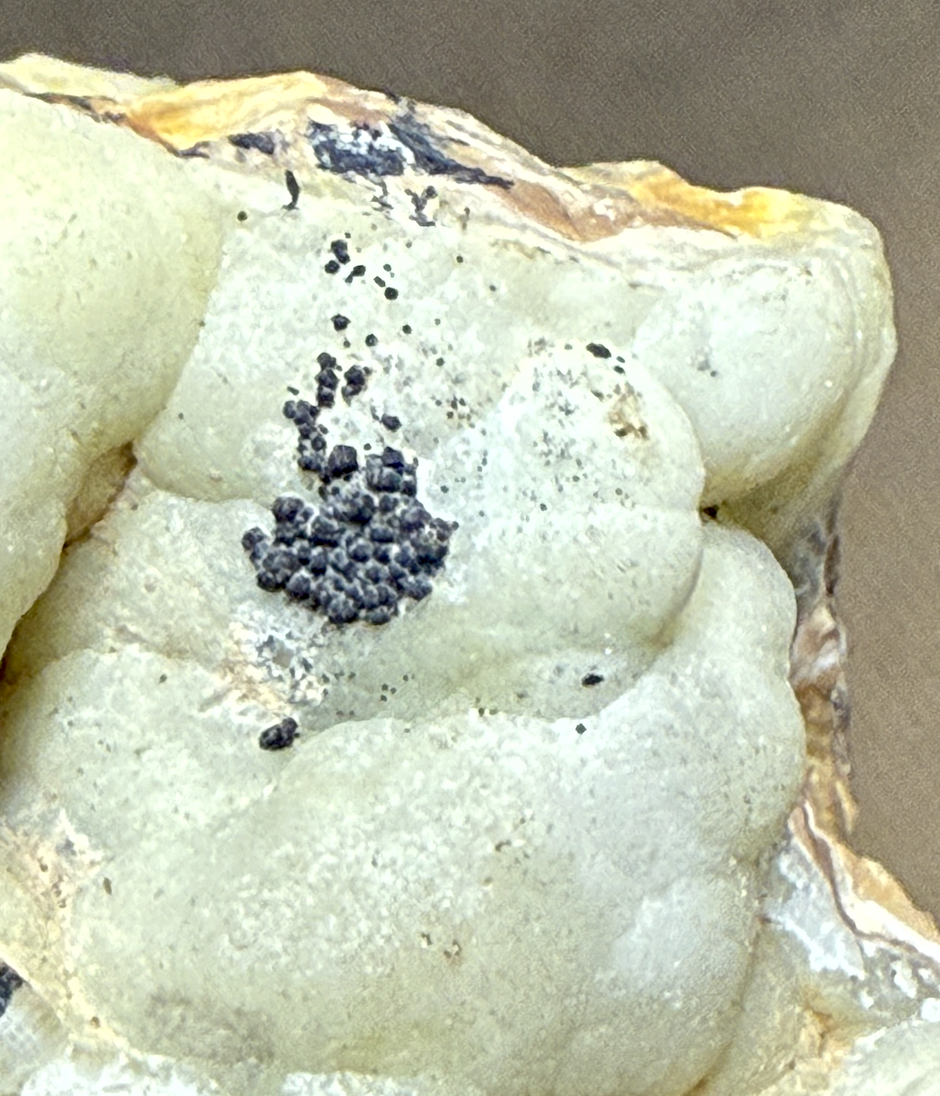 Opale "chocolat" avec de l'opale blanche mamelonnée en association avec des petites Torbernite et peut-être de la Parsonsite (à revérifier).