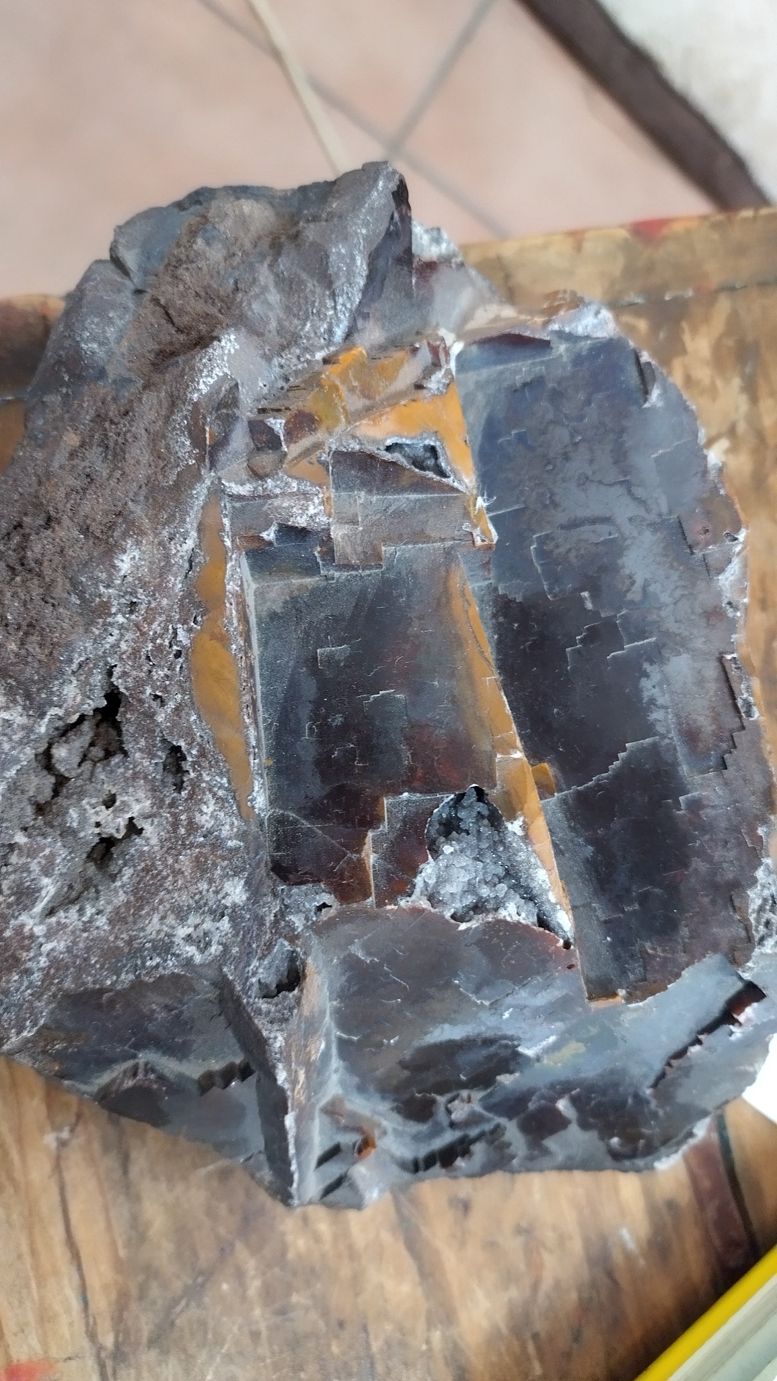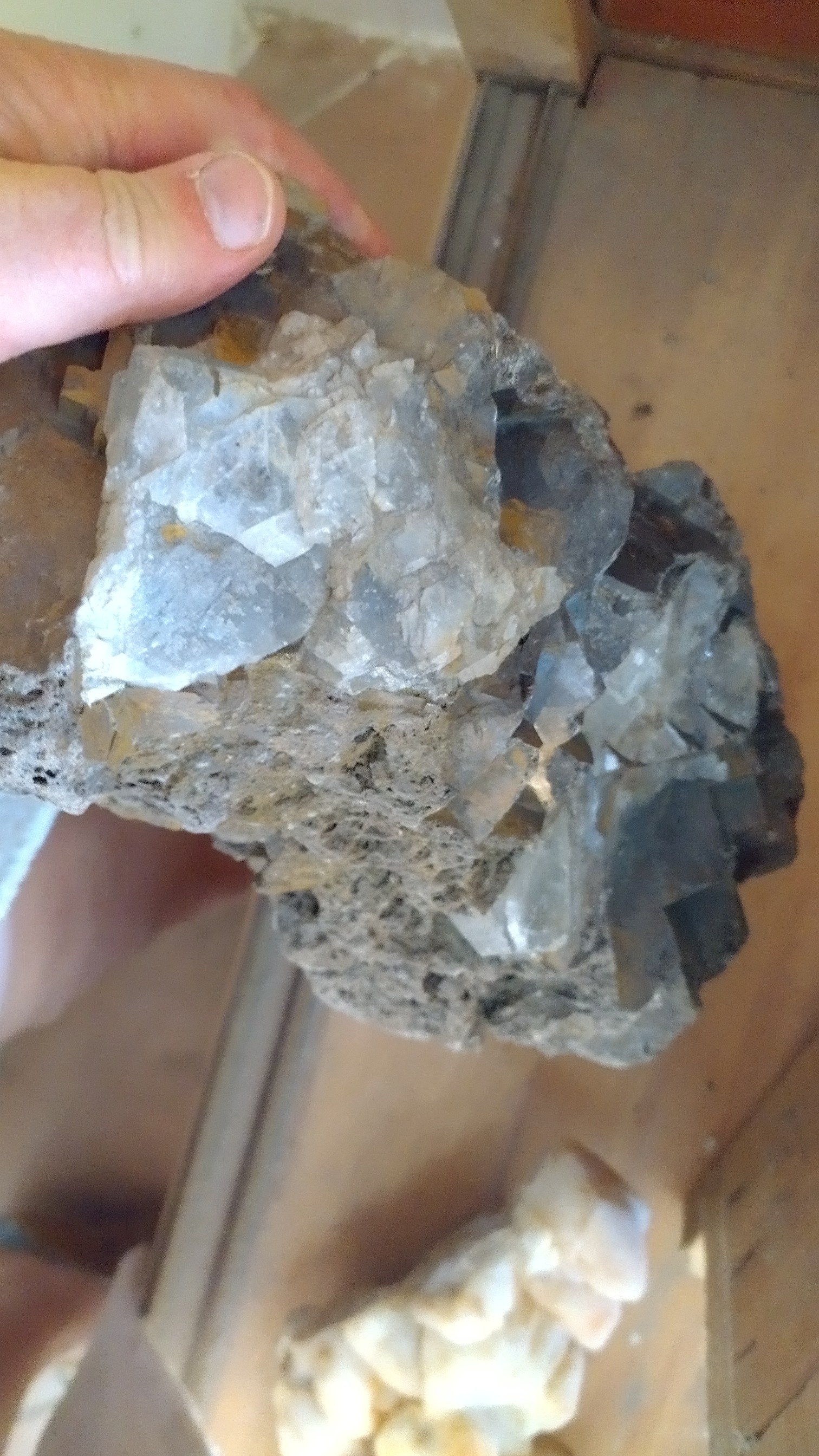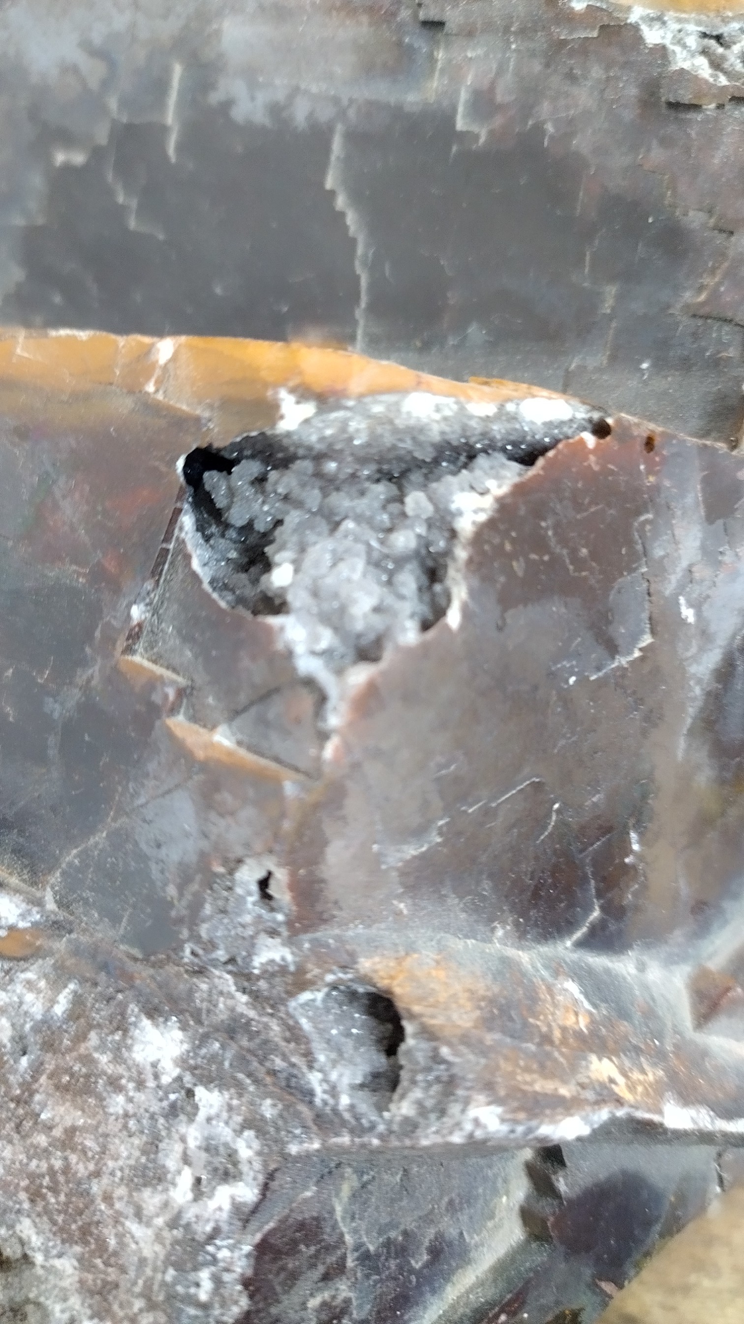 En photo un remplissage de une grosse de fluorine du panneau N4 du niveau R de la mine du beix. Ce remplissage semble d' origine volcanique probablement lors du volcanisme Auvergnat avec une calcédoine marron et des géodes cristallisées en quantité mais de quoi????