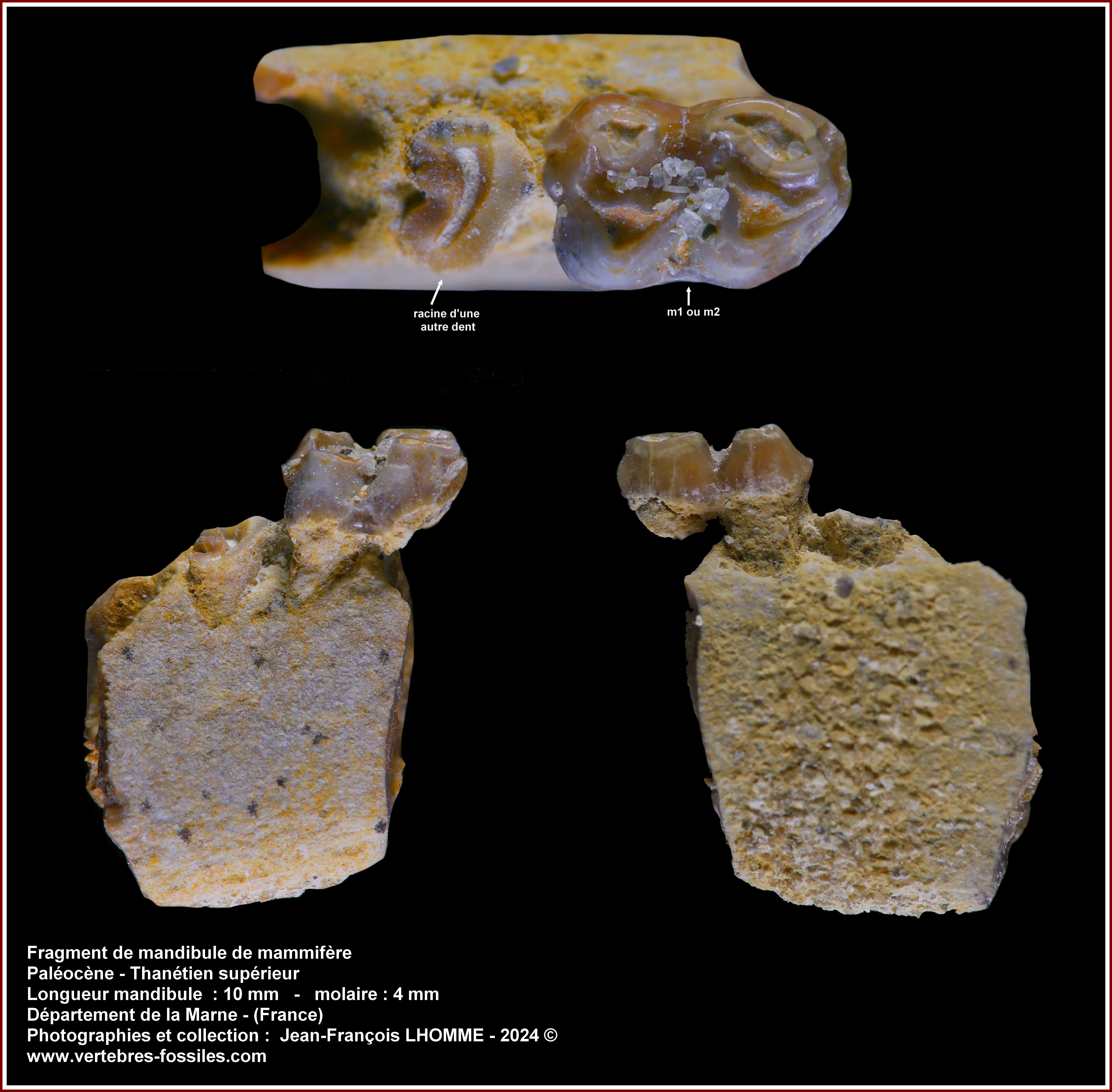 Pour finir une dent sur mandibule confiée au MNHN de Paris pour étude, il s'agirait d'un nouveau taxon pour le Thanétien