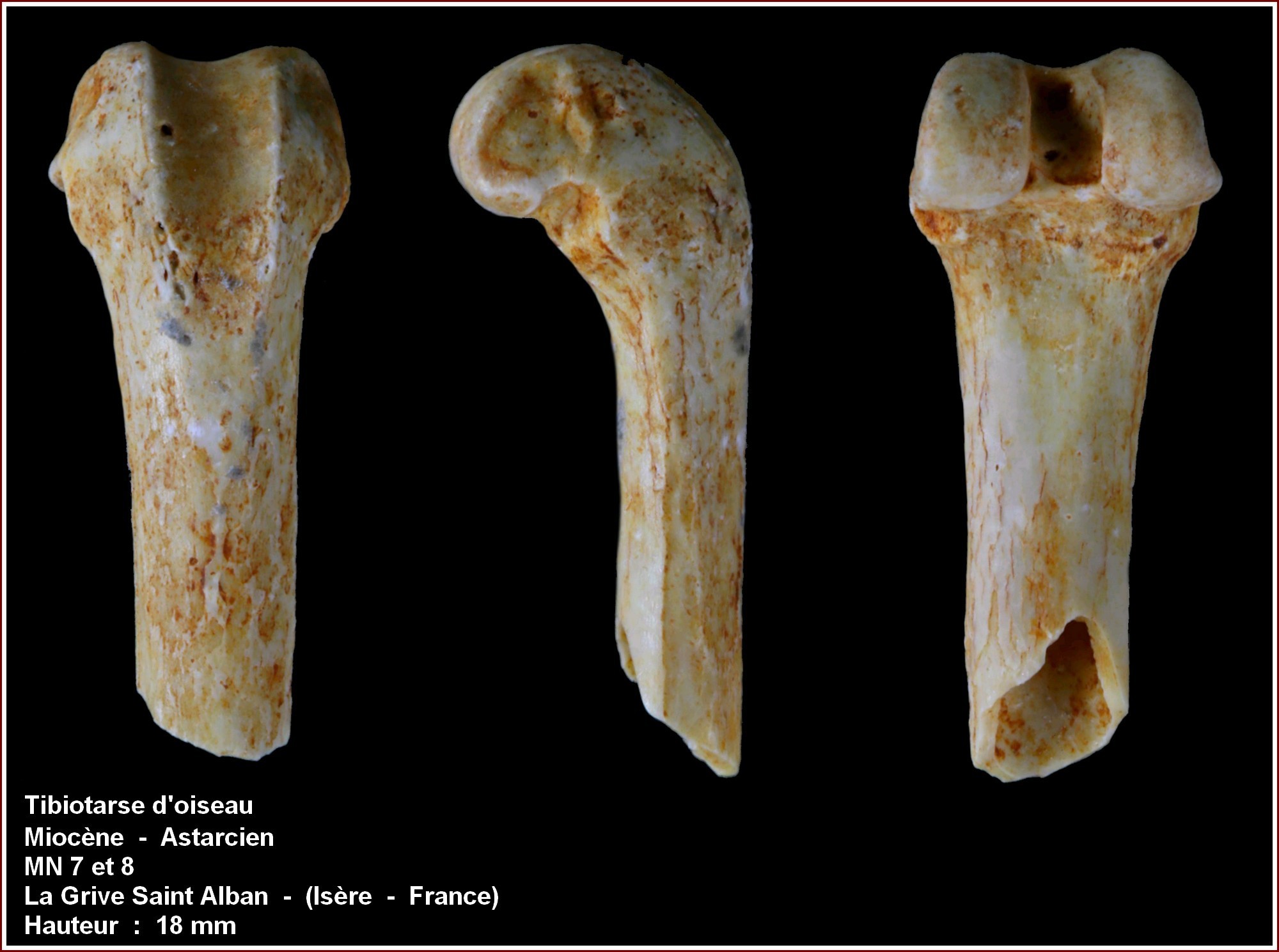 Par contre pour moi ce n'est pas un tibiotarse d'oiseau. Il n'y a pas la gouttière du muscle extenseur des doigts, et c'est quelque chose qu'on rencontre chez une bonne partie des especes de ce groupe taxonomique. J'y verrais plus la partie distale d'un femur de lagomorphe (leurs os sont souvent creux comme ceux d'oiseaux).