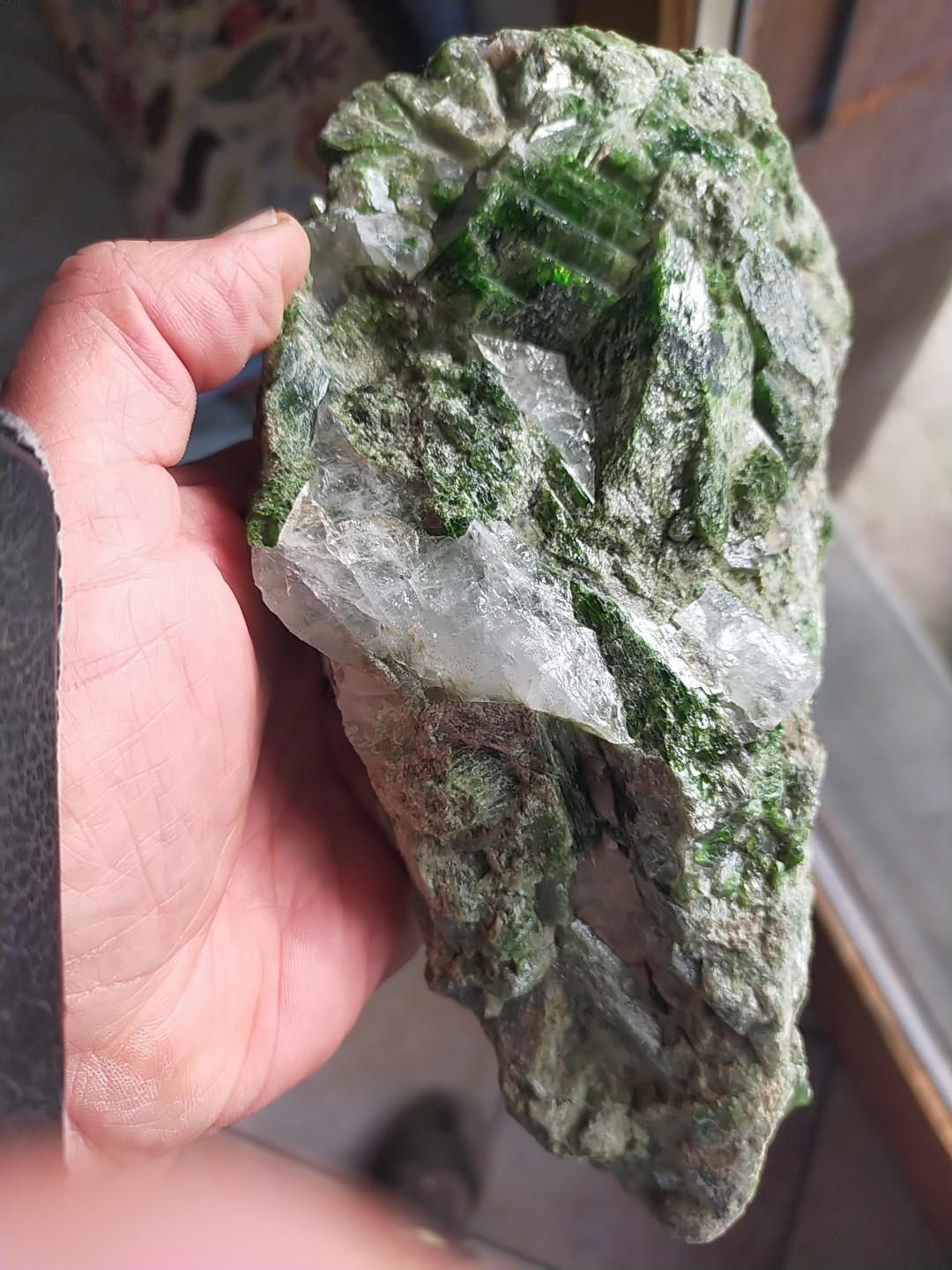 Gros spécimen ( des années  80 , dixit ancien proprio )  de Diopside Chrome (plus vert que le rendu des photos)avec aussi un peu de Quartz , malgré mes recherches (Mindat et autres ) j'ai  un doute sur la provenance , normalement Russe ( d'après tj l'ancien proprio , sans certitude )! mais ça ressemble presque plus à du Brésilien ?? Dans l'attente de lire vos avis . merci