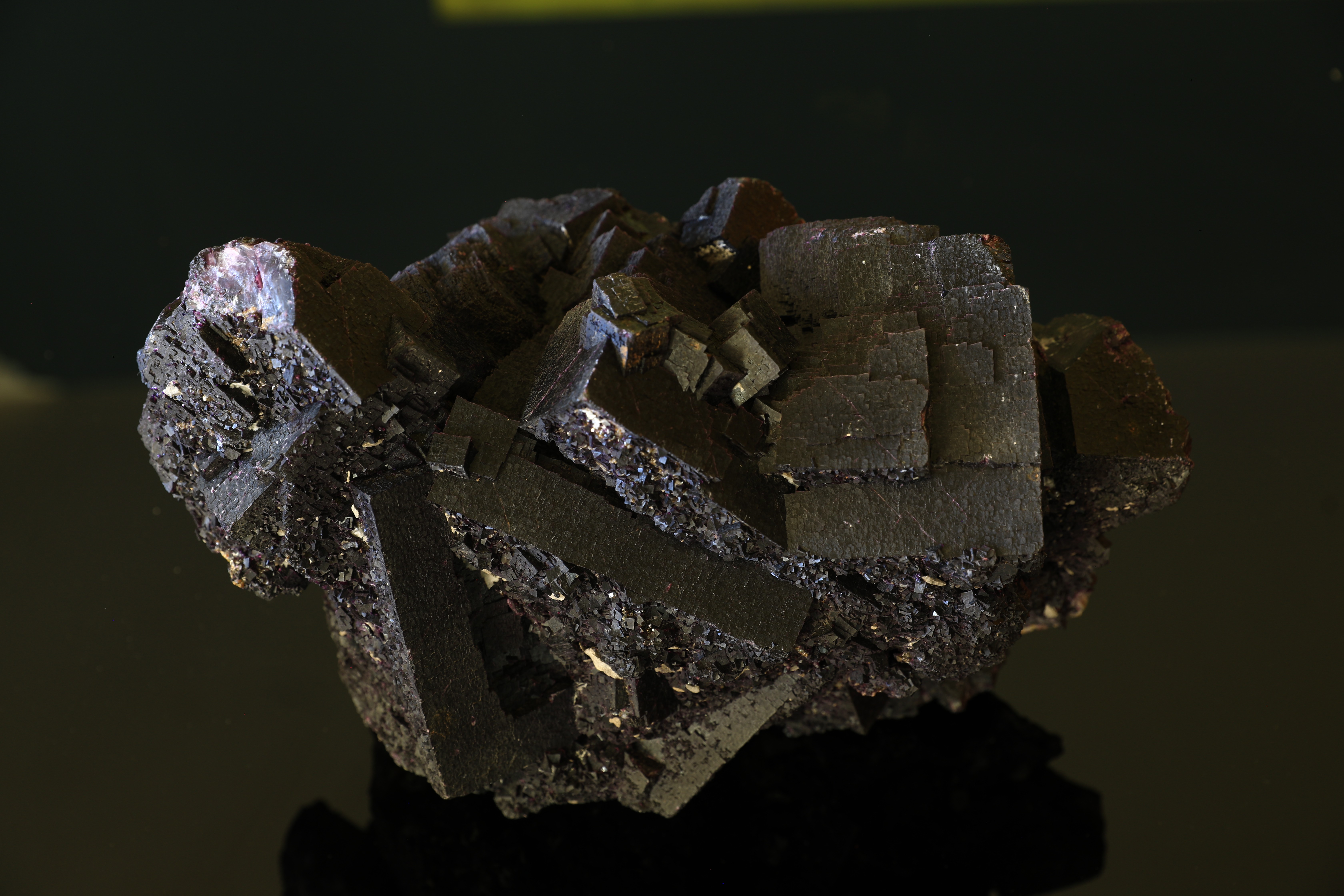 Le coté "poussiéreux" vient d'un léger dépôt ressemblant à de la "pyrite"(Solidement accroché). Dépôt secondaire de Calcites ?(Fragile, juste déposé). Aux uv long, apparait un seul et trés fin dépôt jaune fluo, prêt de la limite entre Jaune et Bleu.