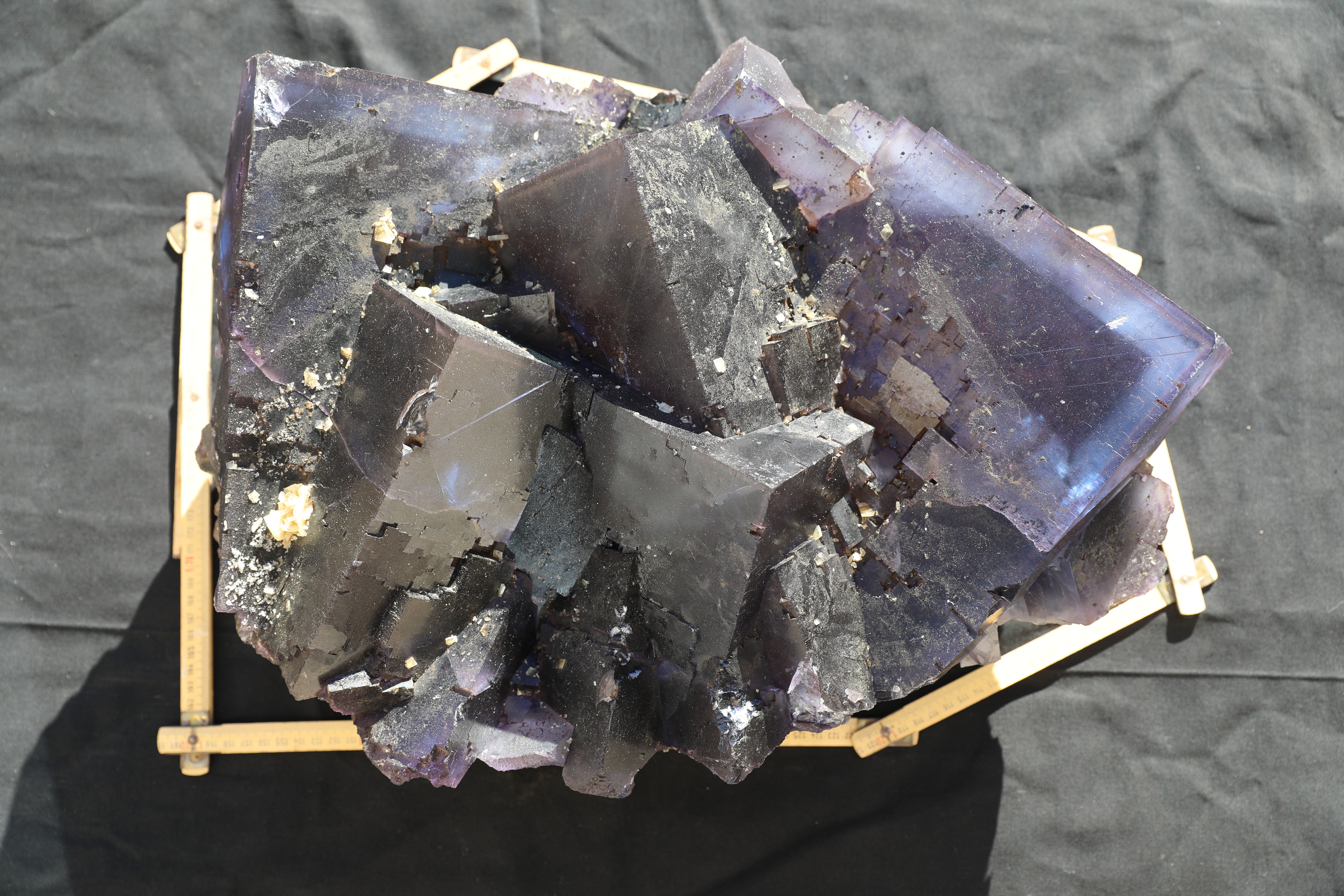 Et la violette/noire : 15 kilos 43cm par 30 de circonférence. Aspect et texture écailleuse, à l'air plus dense que ses camarades, quelques inclusion de pyrites ? à part une veine sur le dos elle est complétement opaque.