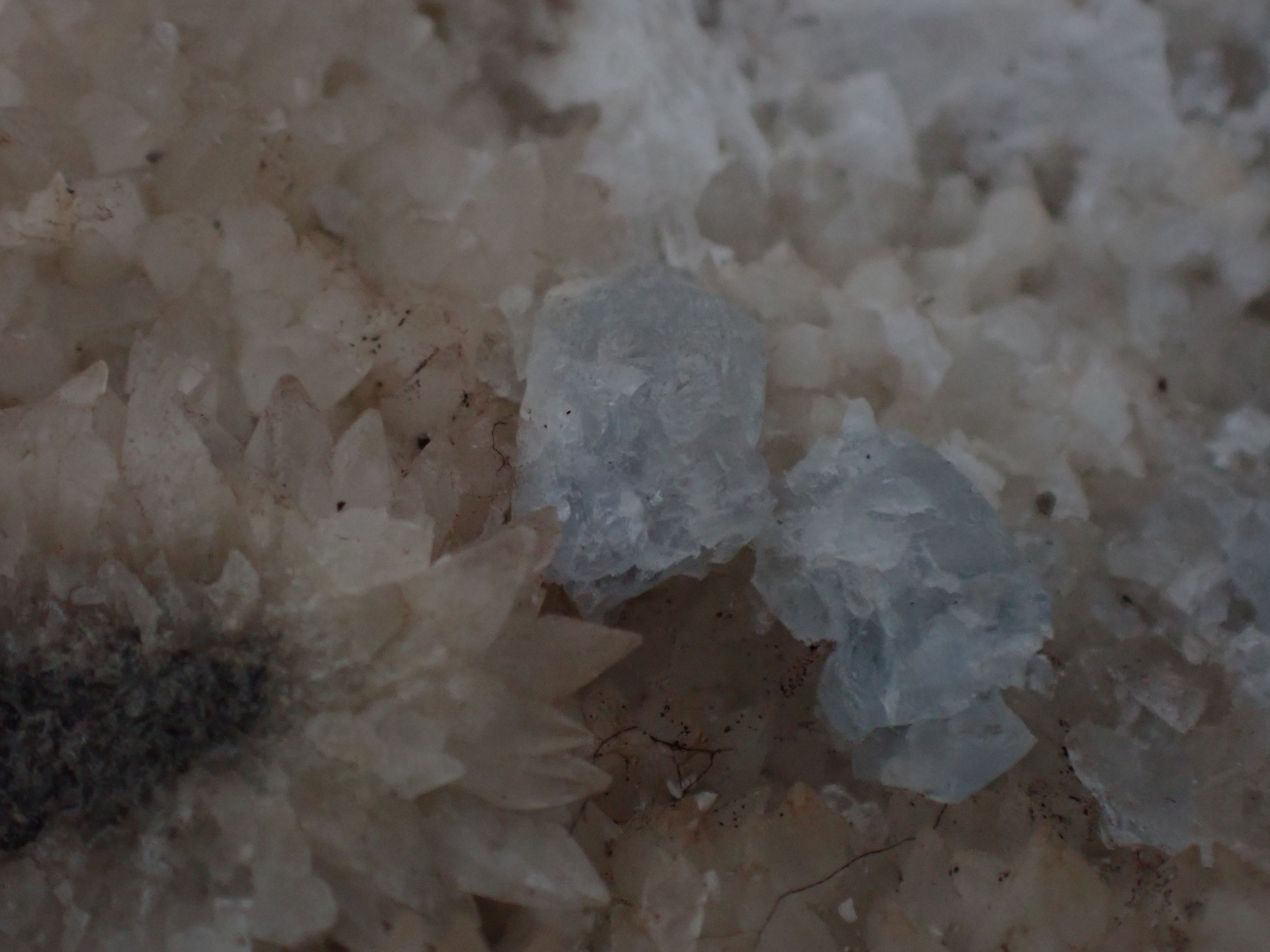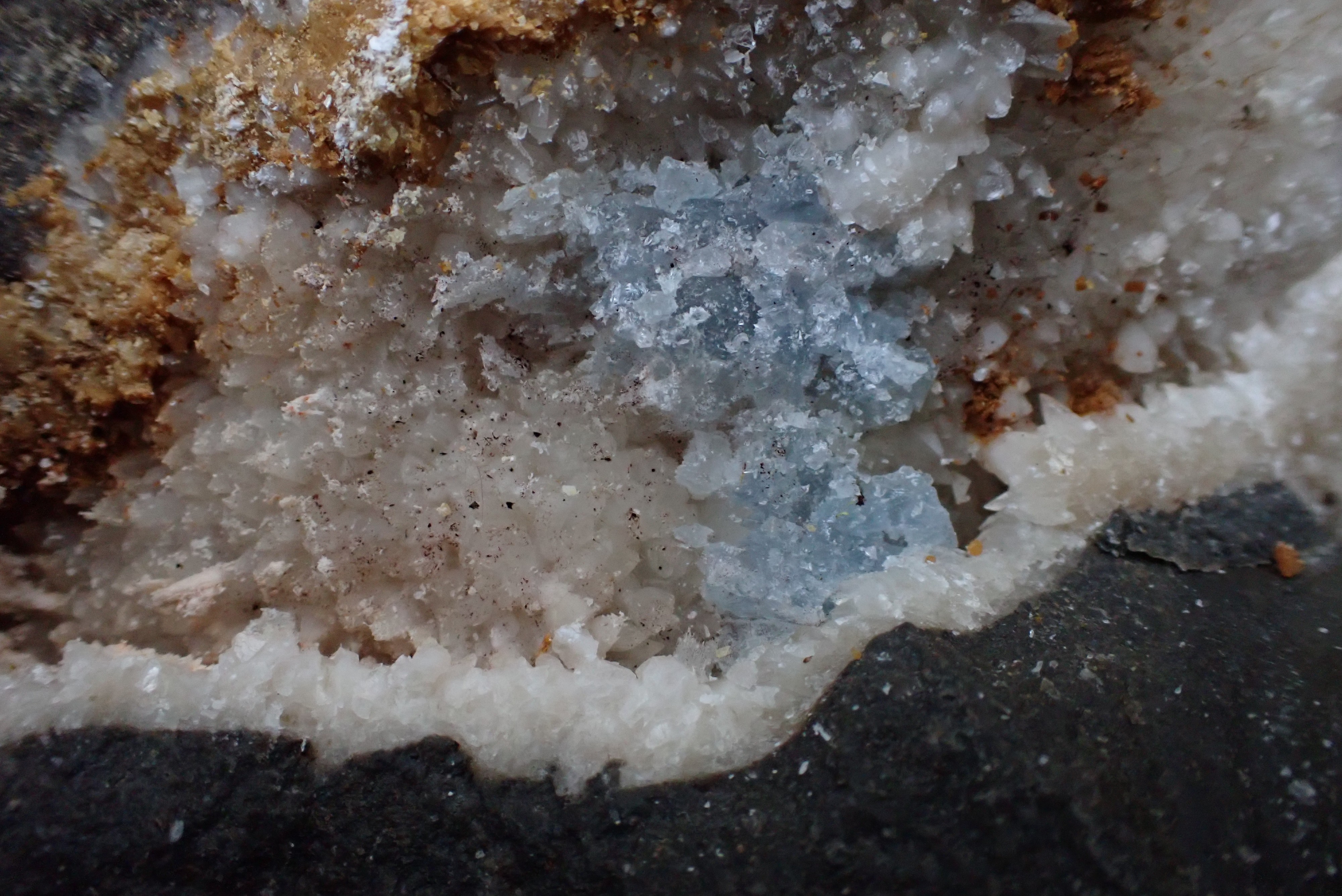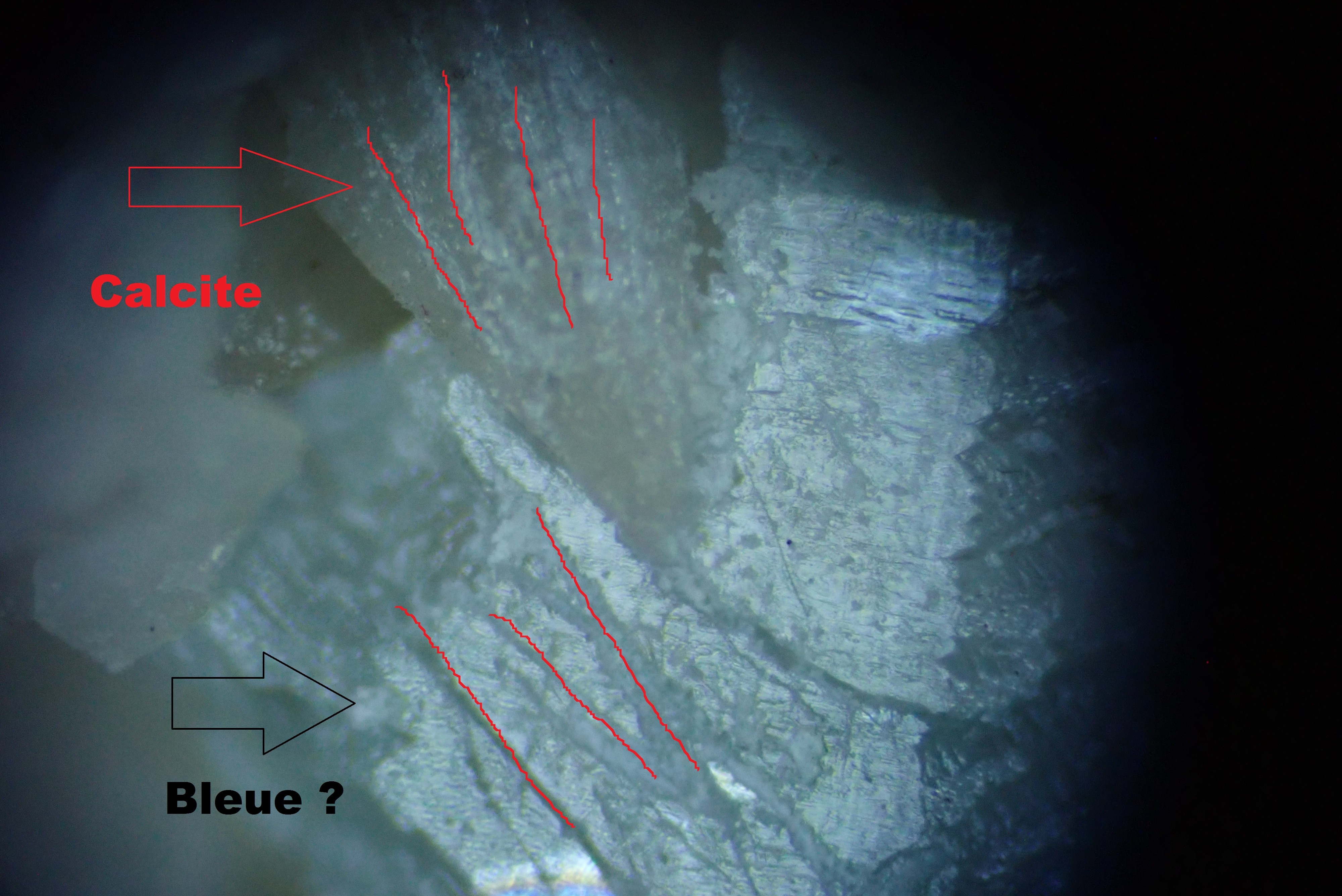 Découvert dans 2 poches  de calcite ,minéral de couleur bleue ciel ? Jura
