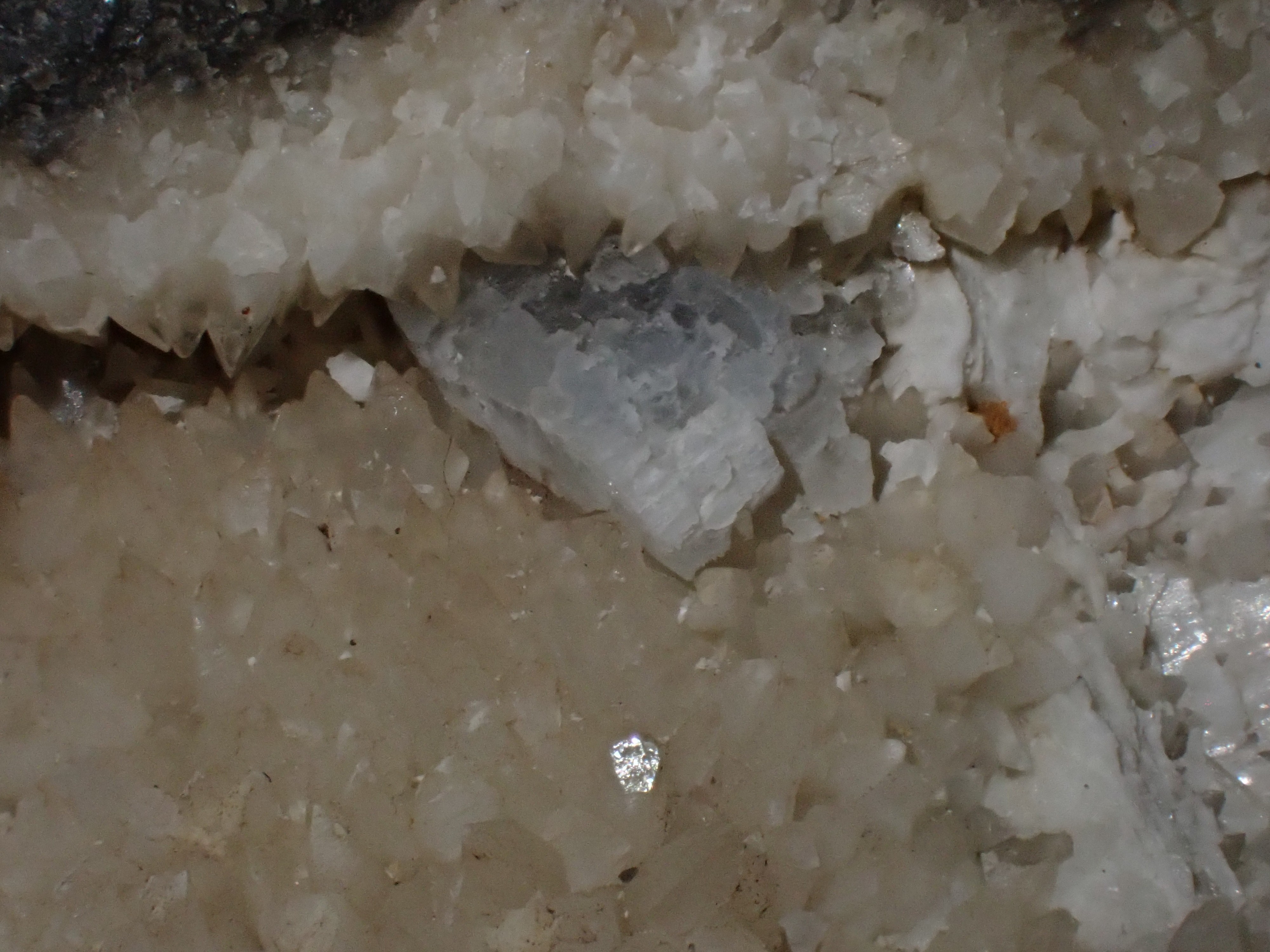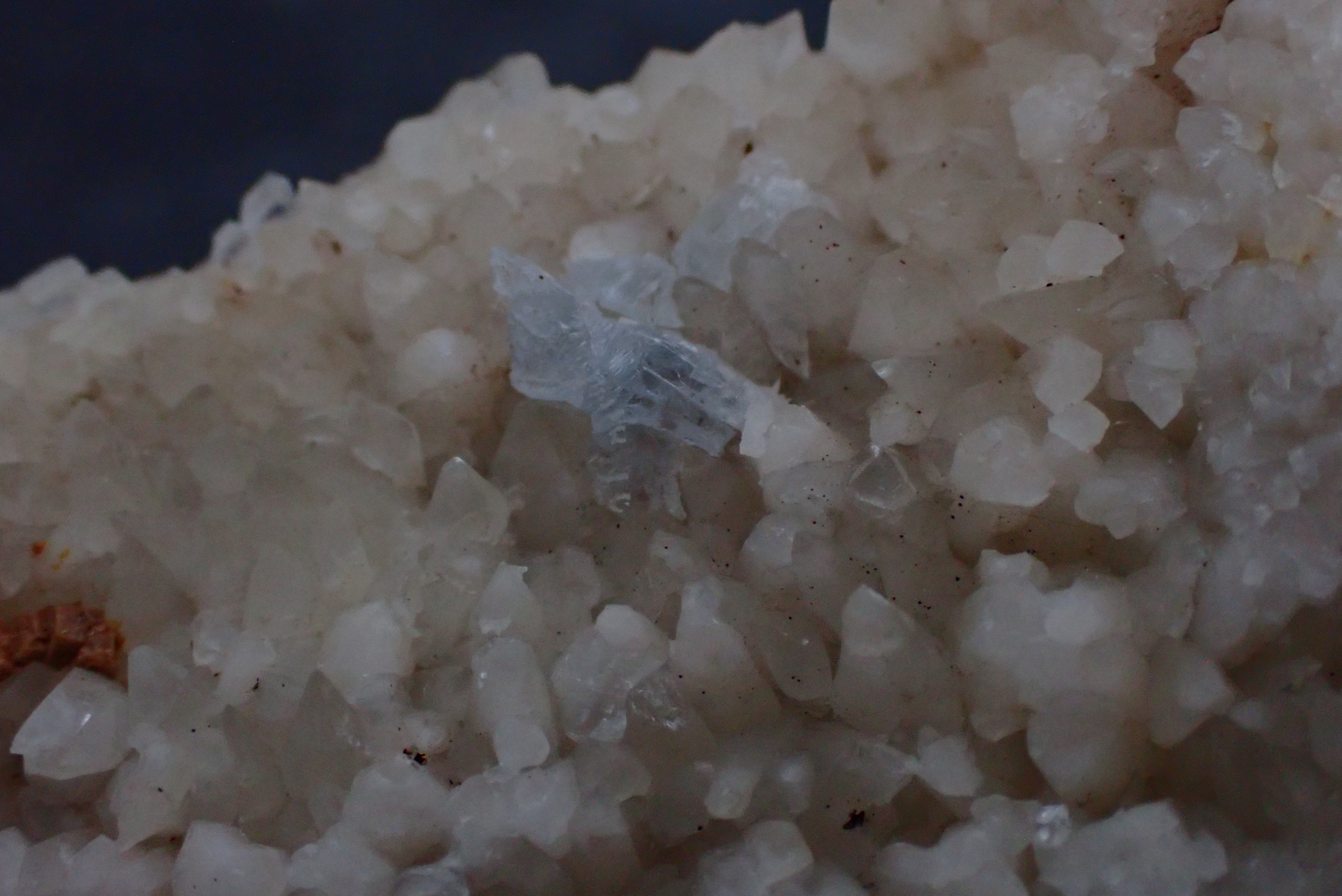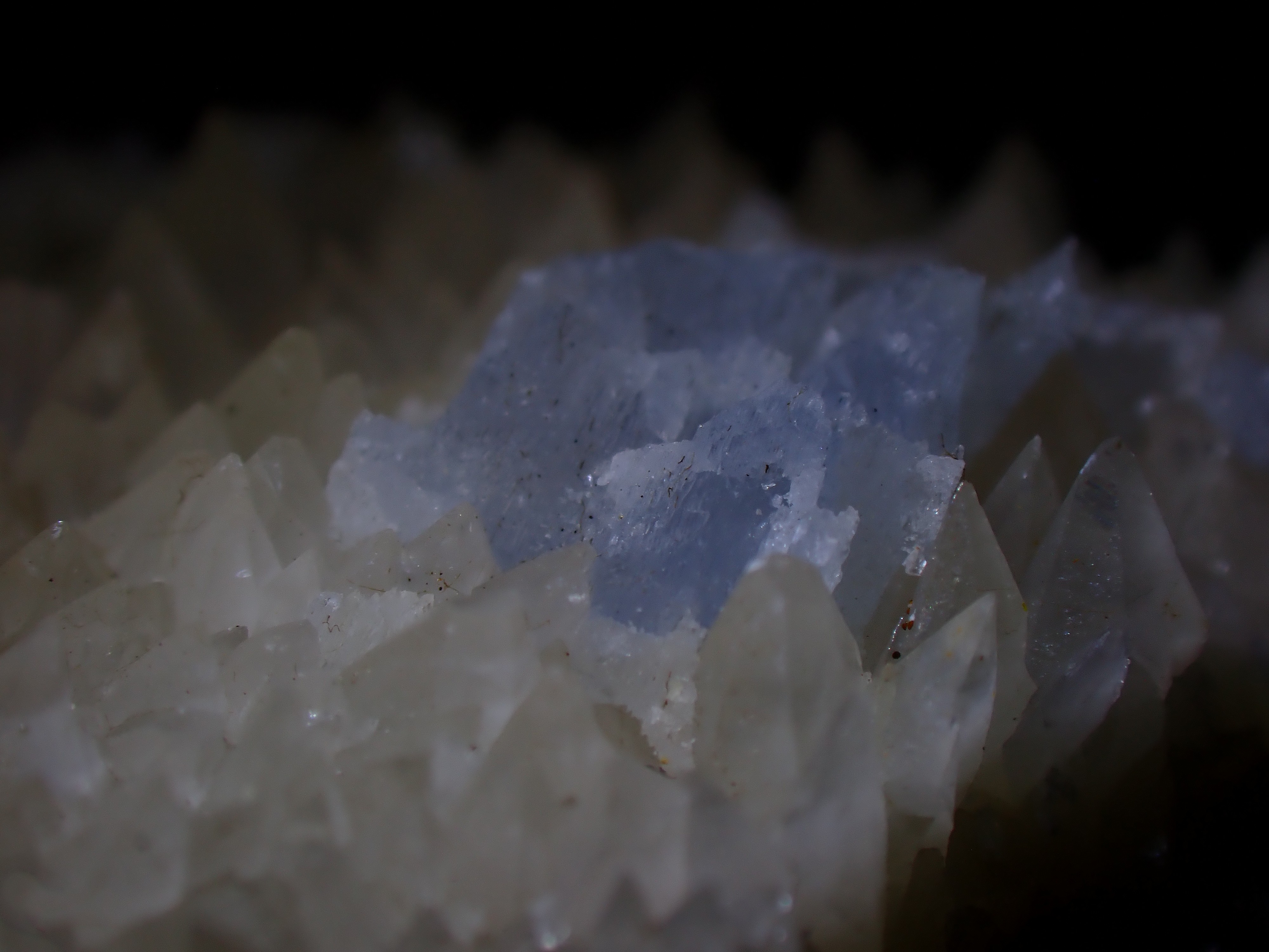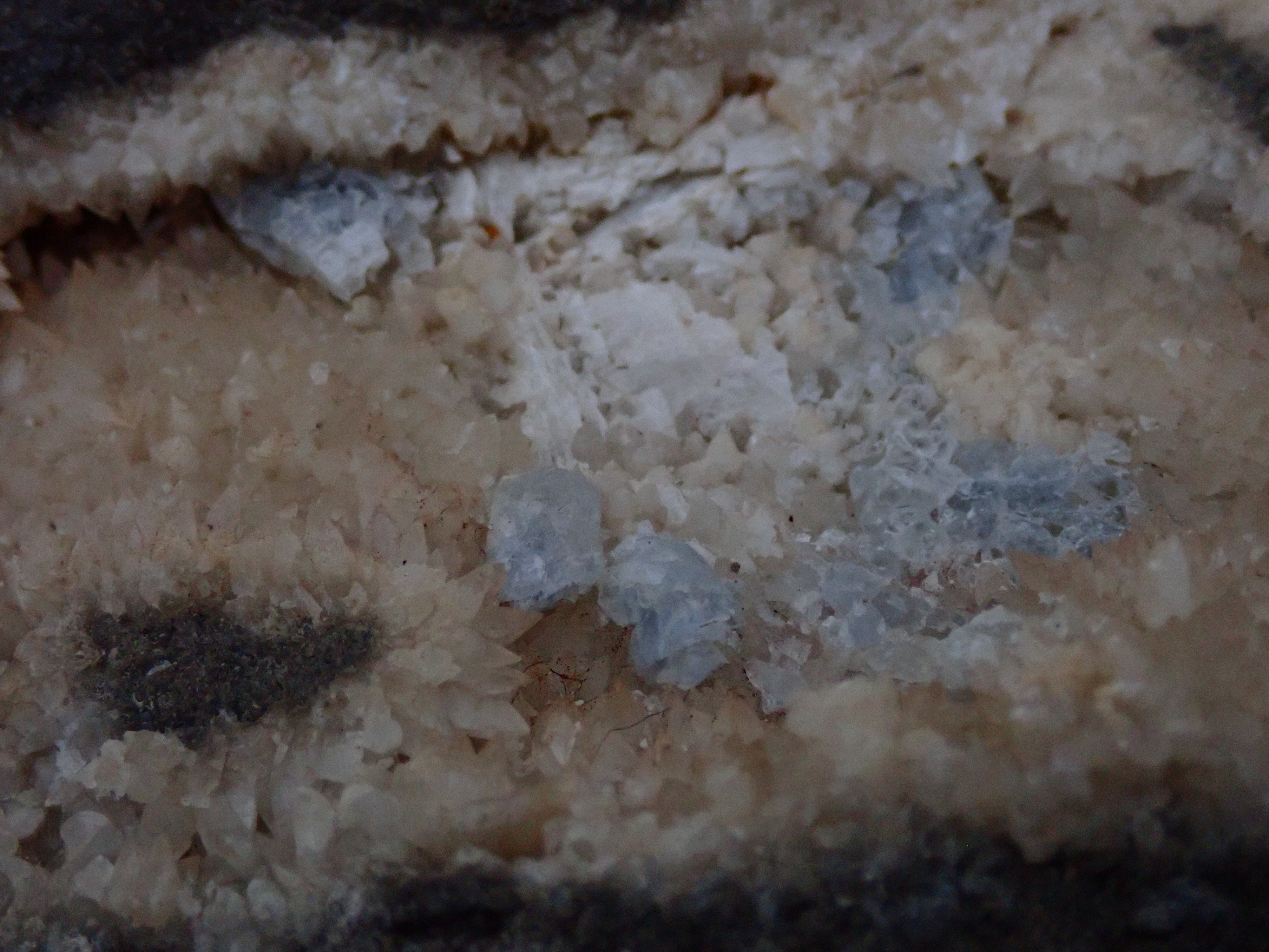Découvert dans 2 poches  de calcite ,minéral de couleur bleue ciel ? Jura
