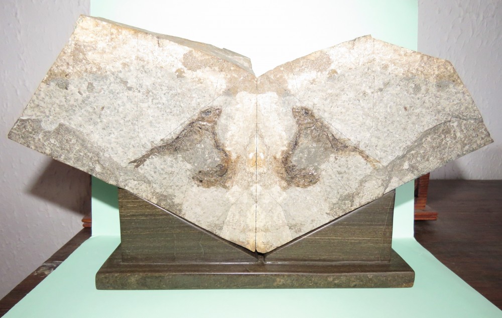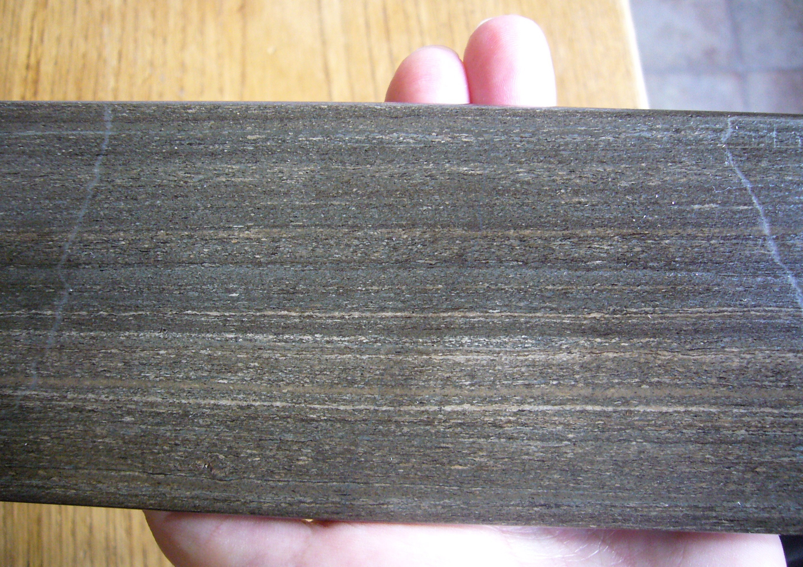 Travailler ses propres trouvailles est toujours plaisant. Le caillou devient gemme ! En Lozère, à part la fluorine, il y a du quartz rose (de pegmatite), du quartz améthysté, de la calcédoine qui, parfois, pourrait mériter le titre d'agate. Et puis les roches: là, vastes perspectives... Après mon travail sur des roches corses posté plus haut (que j'avais découpées en plaques minces pour optimiser le matériau, d'où l'idée de damier), je me suis intéressée aux roches sédimentaires d'ici, disponibles à profusion, en particulier un calcaire bitumineux très finement laminé du Toarcien dans lequel je trouve des poissons et qui évoque, une fois poli, l'ébène de Macassar ! C'est en sciant des blocs à poissons pour les dégrossir que je m'en suis rendu compte. Du coup, j'ai utilisé les chutes pour construire un socle pour la pièce, disposée en miroir. Ce matériau, associé à d'autres -dont pourquoi pas la fluorine- ouvre des perspectives d'utilisation décoratives remarquables.