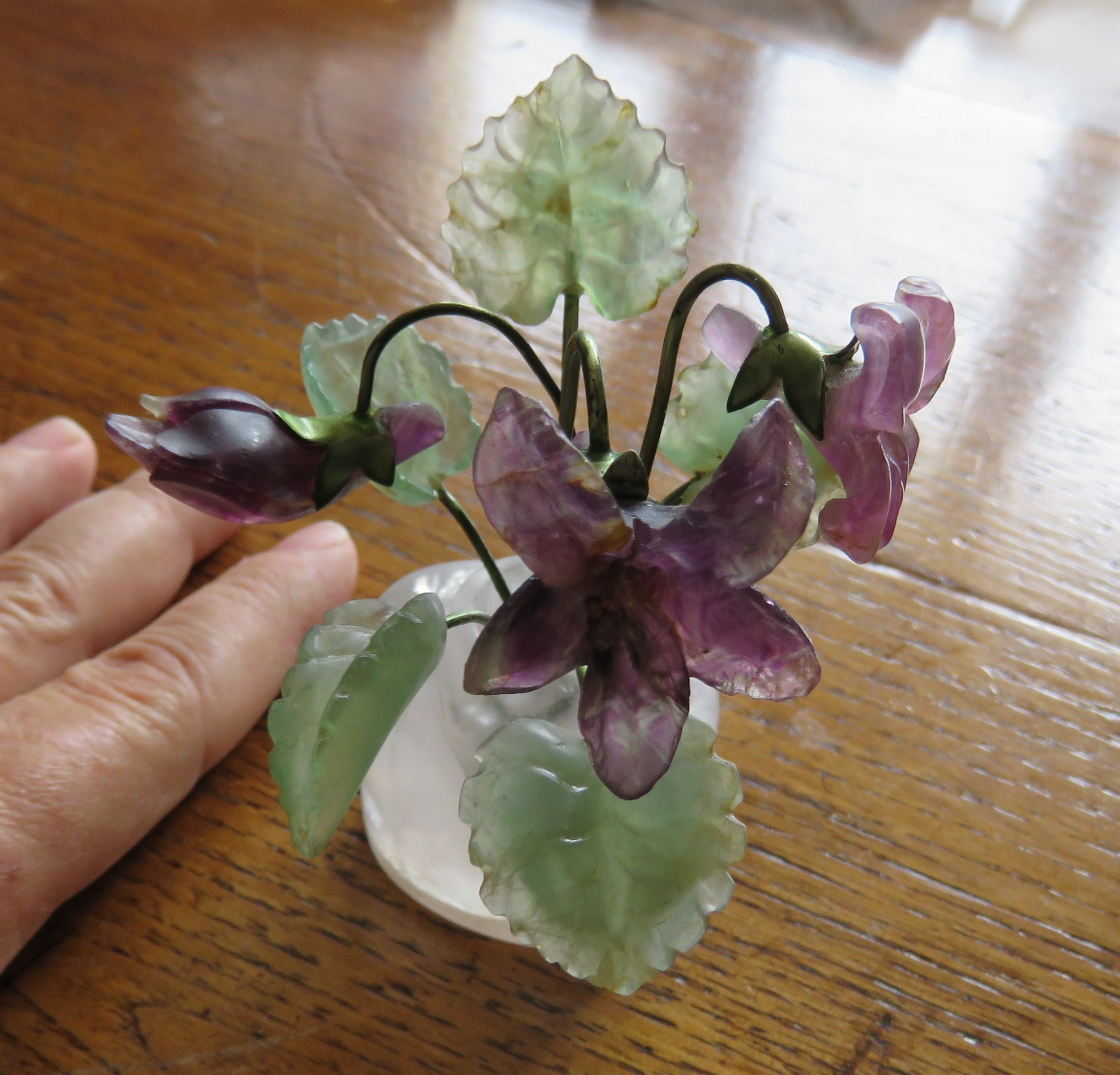 -le bouquet de violettes: fluorine violette du Piboul, verte et incolore de Saint Laurent les Bains, tiges en argent émaillé à froid.