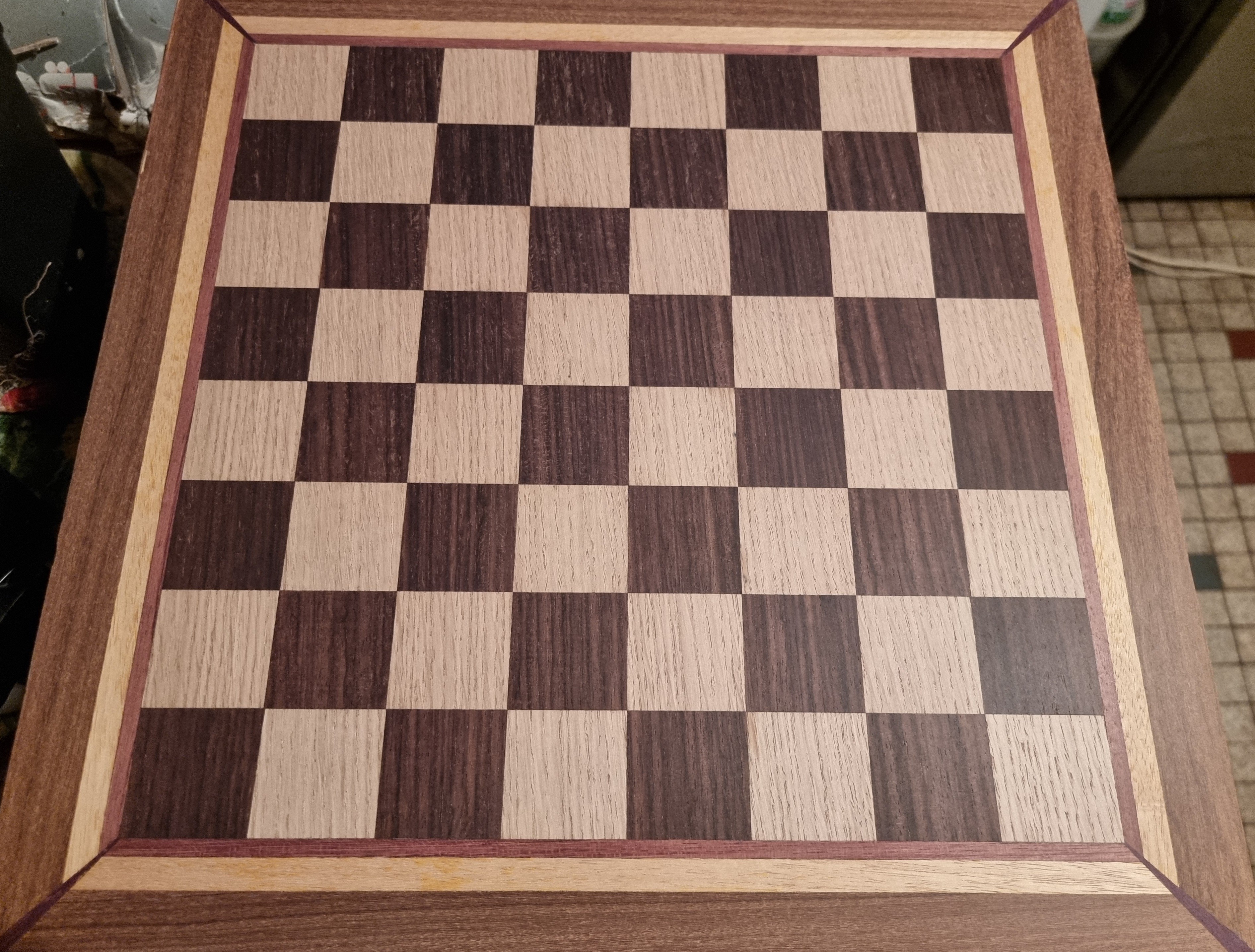 Palissandre et Chêne pour les cases, puis Bubinga, Movingui, Ipé et Amarante pour le cadre composé.