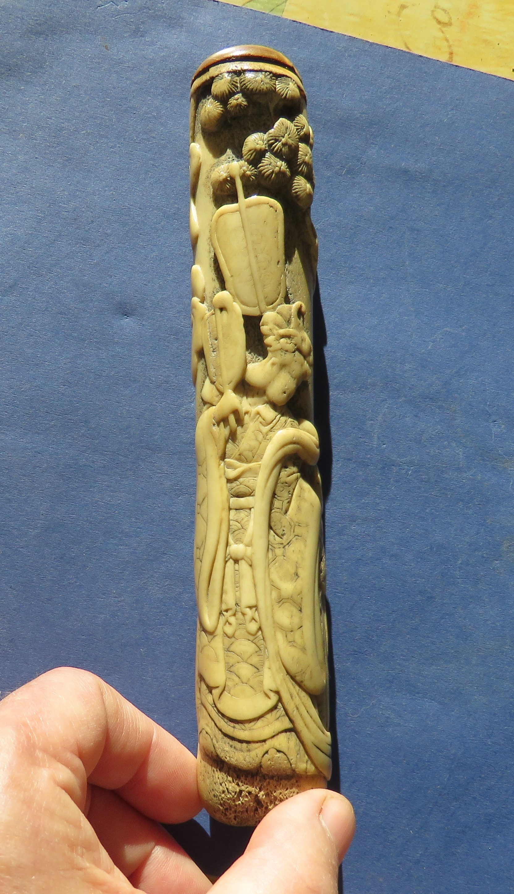 Environ 120 à  150 ans pour cette cigale...au minimum.  J'ai également un autre objet en bois de cerf, un étui à pipe sculpté japonais, qui a fini réutilisé en manche d'ombrelle en Europe à la fin du XIXe siècle. Ce n'est pas un cas isolé de recyclage par les occidentaux, concernant ce genre d'objet. Le degré d'usure de la sculpture à la surface du bois de cerf, et son haut degré de qualité indique probablement un plus grand âge. Je n'en sais pas plus sur cet objet-là malheureusement.