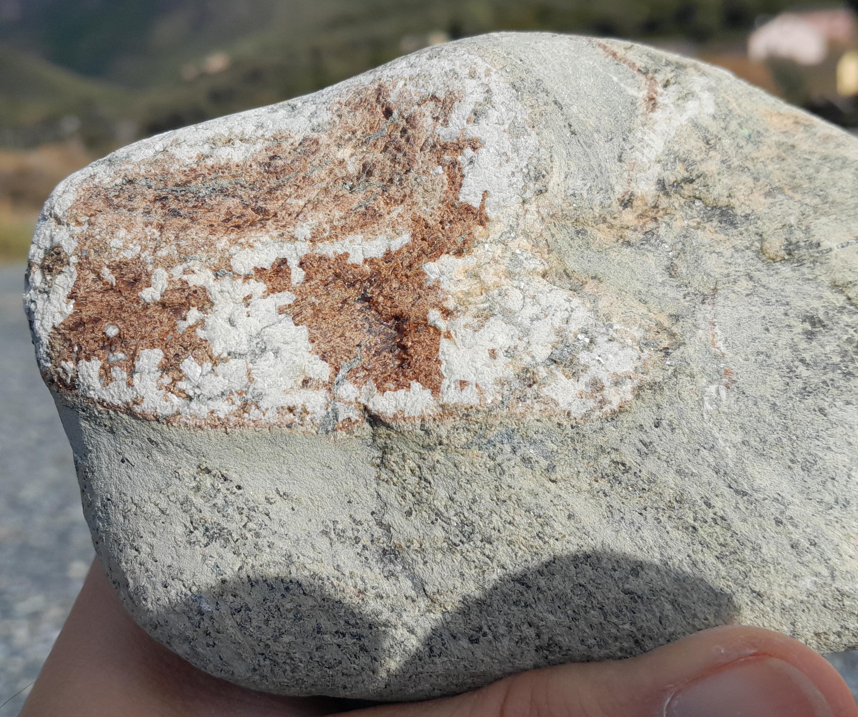 Parmi les nombreuses serpentinites diverses et variées, je suis tombé sur des choses plus singulières. Des galets d'une roche assez claire, crème/rosée/vert pâle, finement grenue, très dure !!. Que j'ai identifiées comme des probables rodingites.