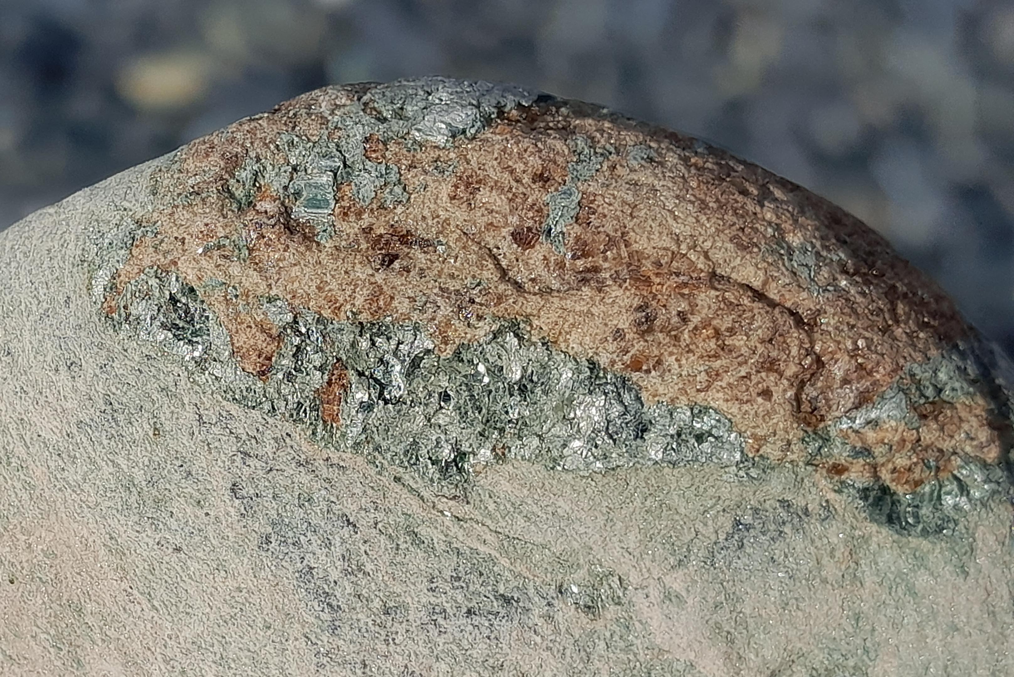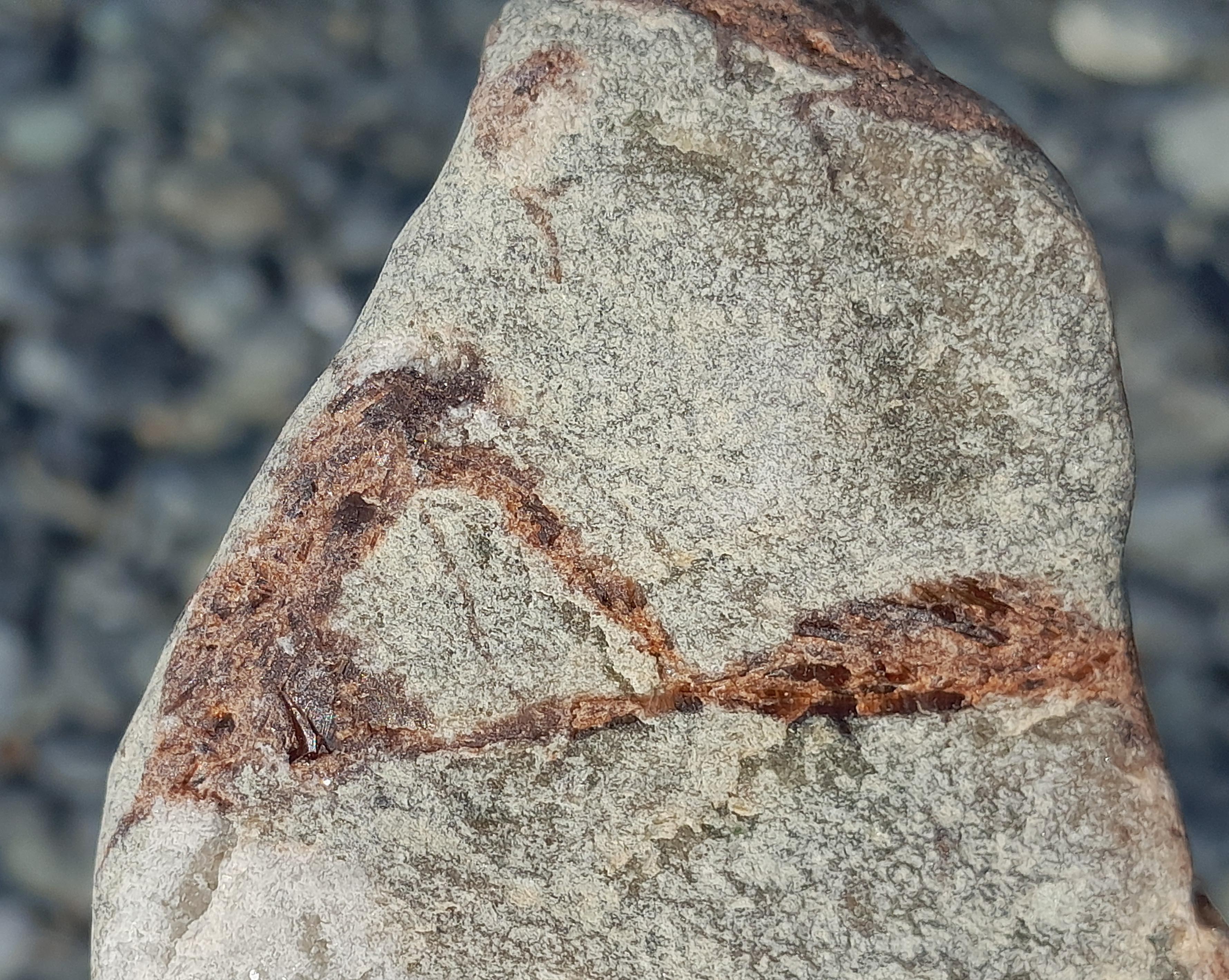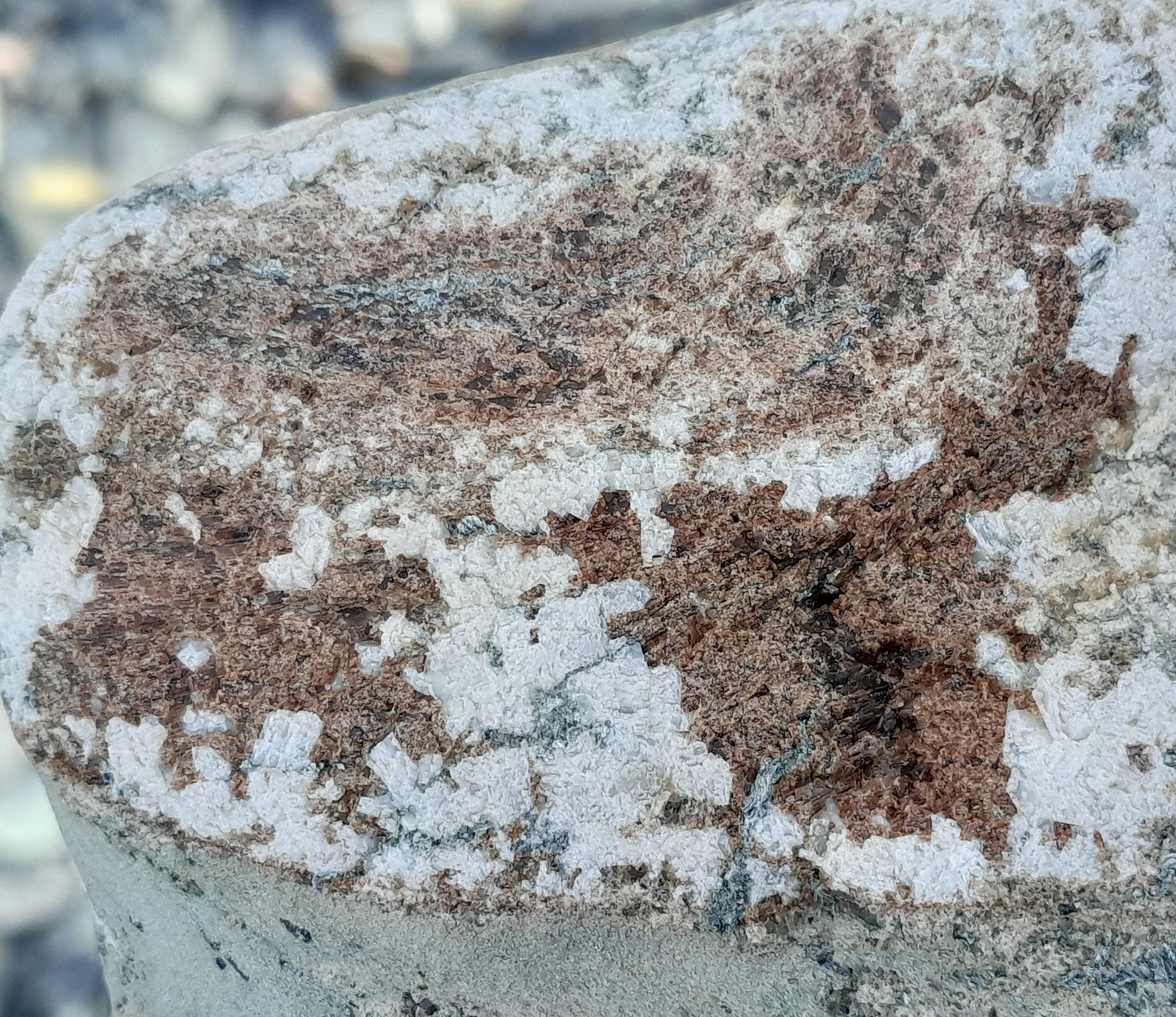 Certains de ces galets sont parcourues par des veines minéralisée, avec des cristallisations brun rouge à rouge-orangé. La forme des cristaux est difficile à évaluer, même si par endroit on tend à voir un certain allongement, pourquoi pas une tendance à la baguette ? Et une association avec ce qui ressemble à des Chlorites de taille respectables.