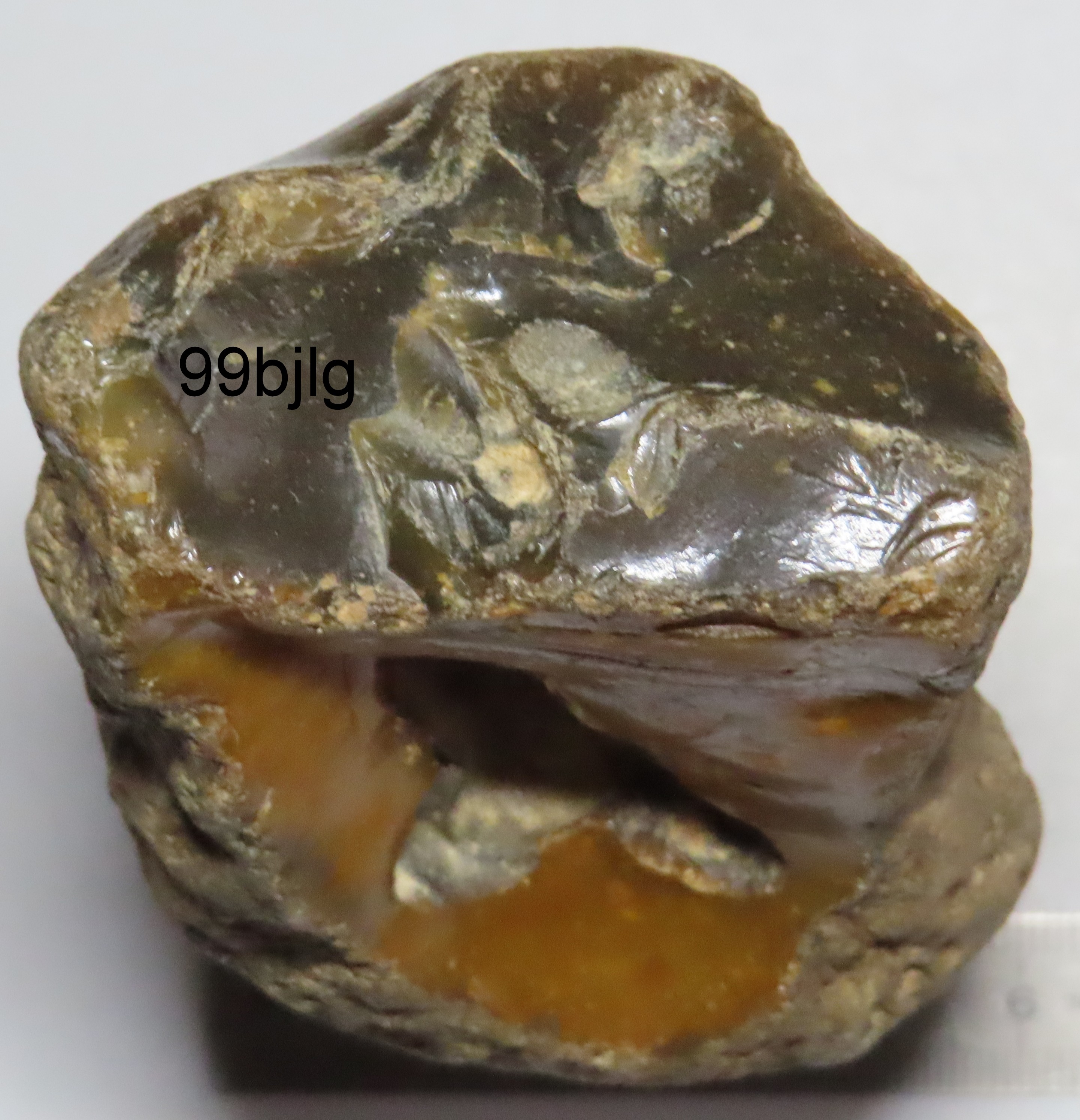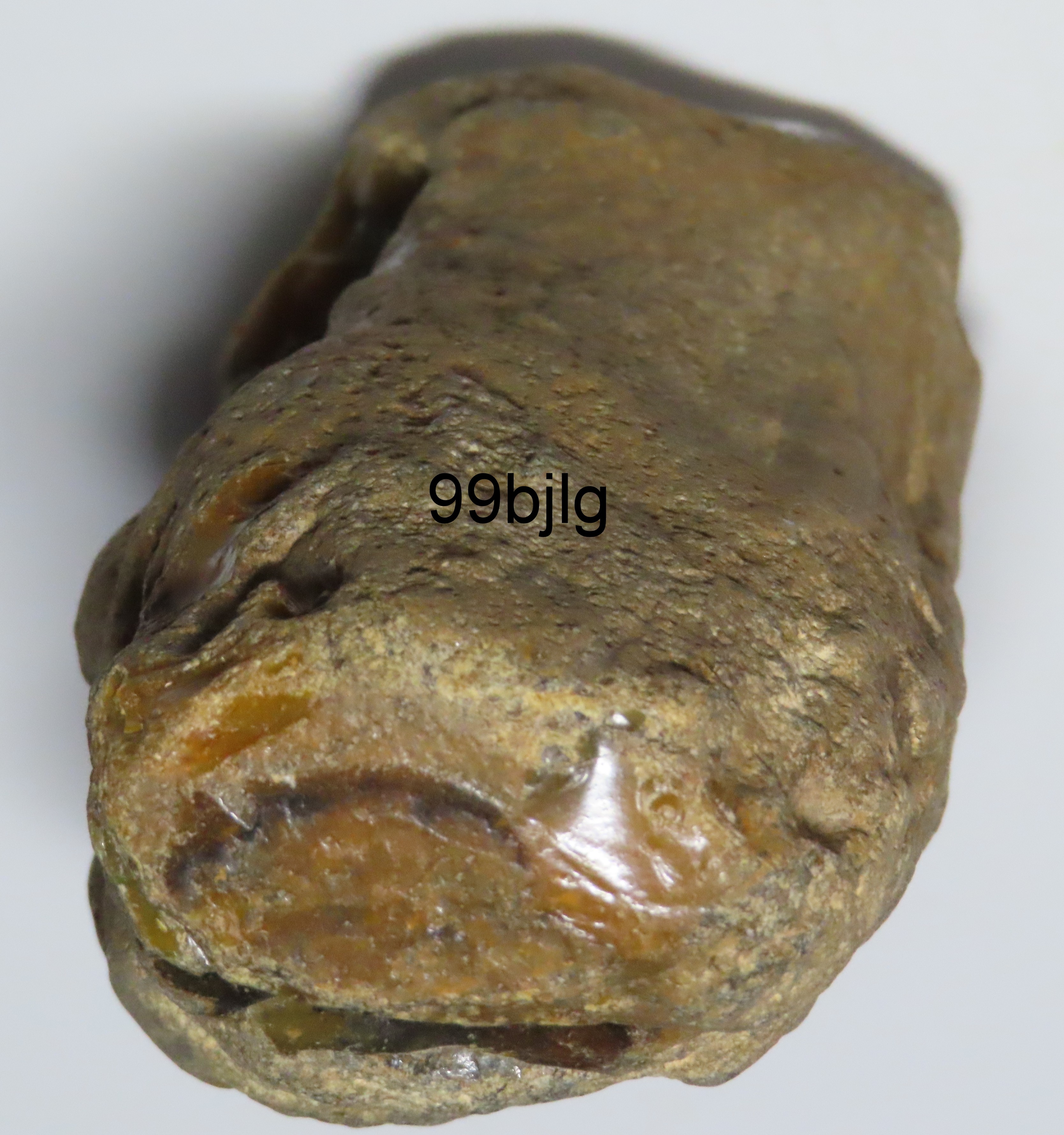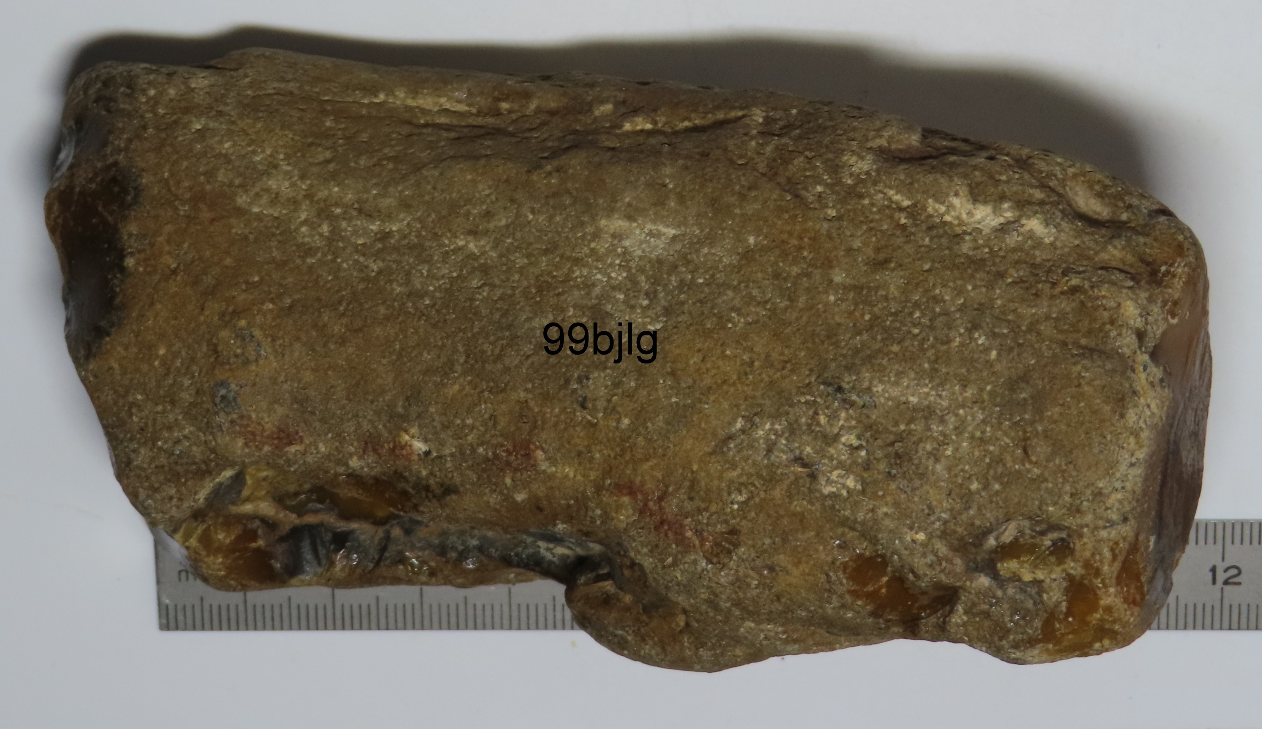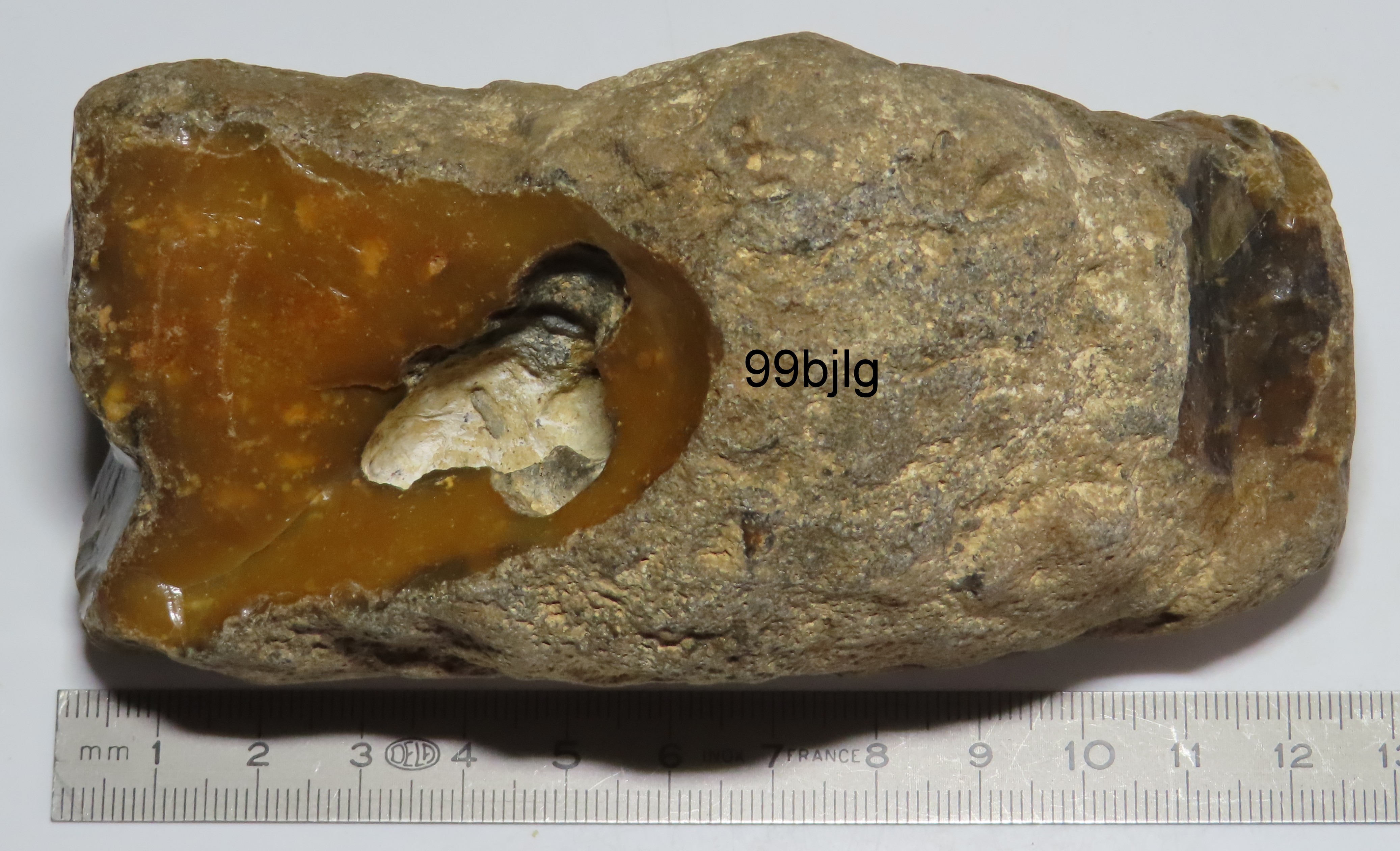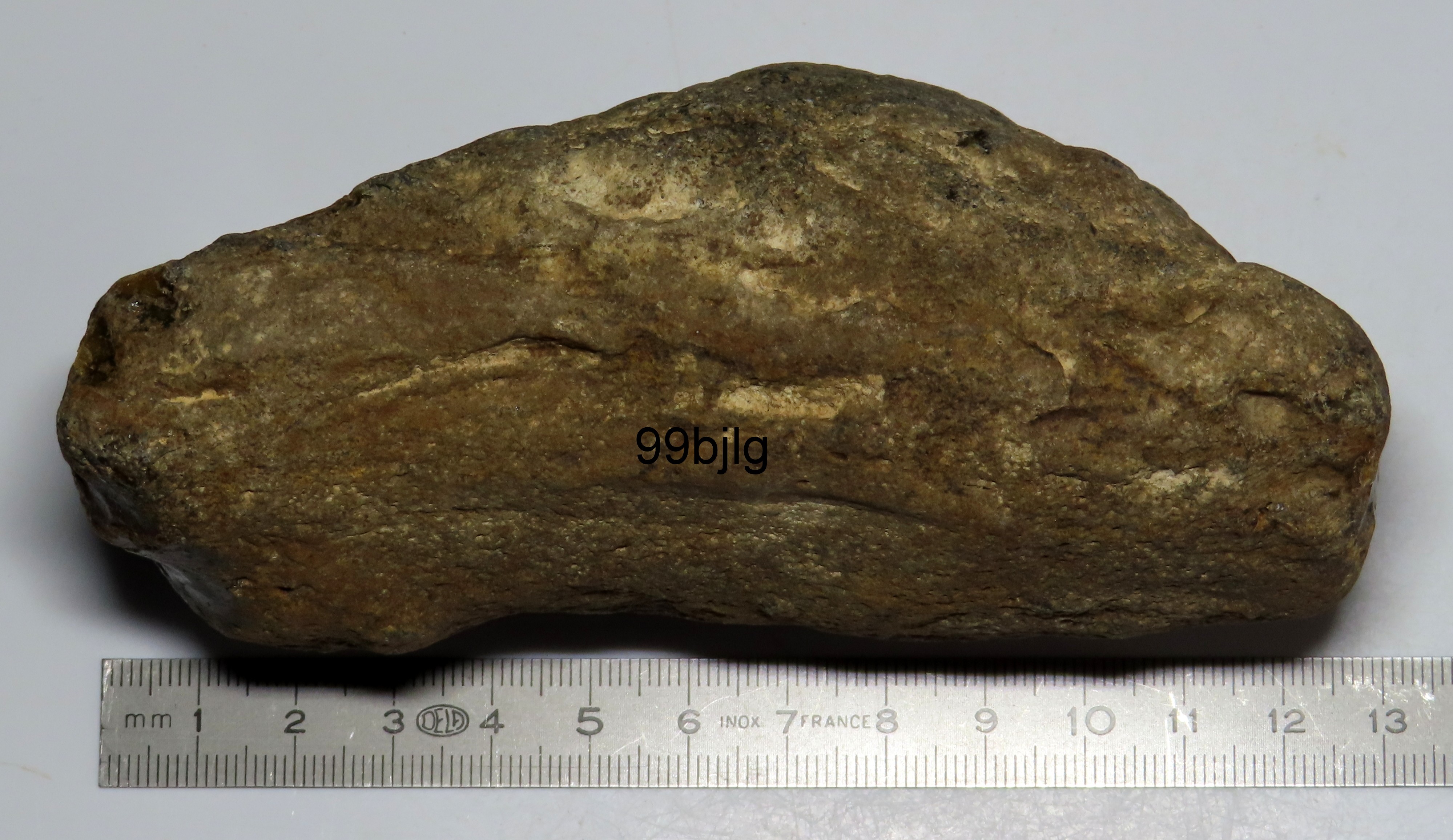 Sur la vue d'un bout,la présence de la trace circulaire foncée me fais penser à du bois.Ou tout simplement un rognon de silex.