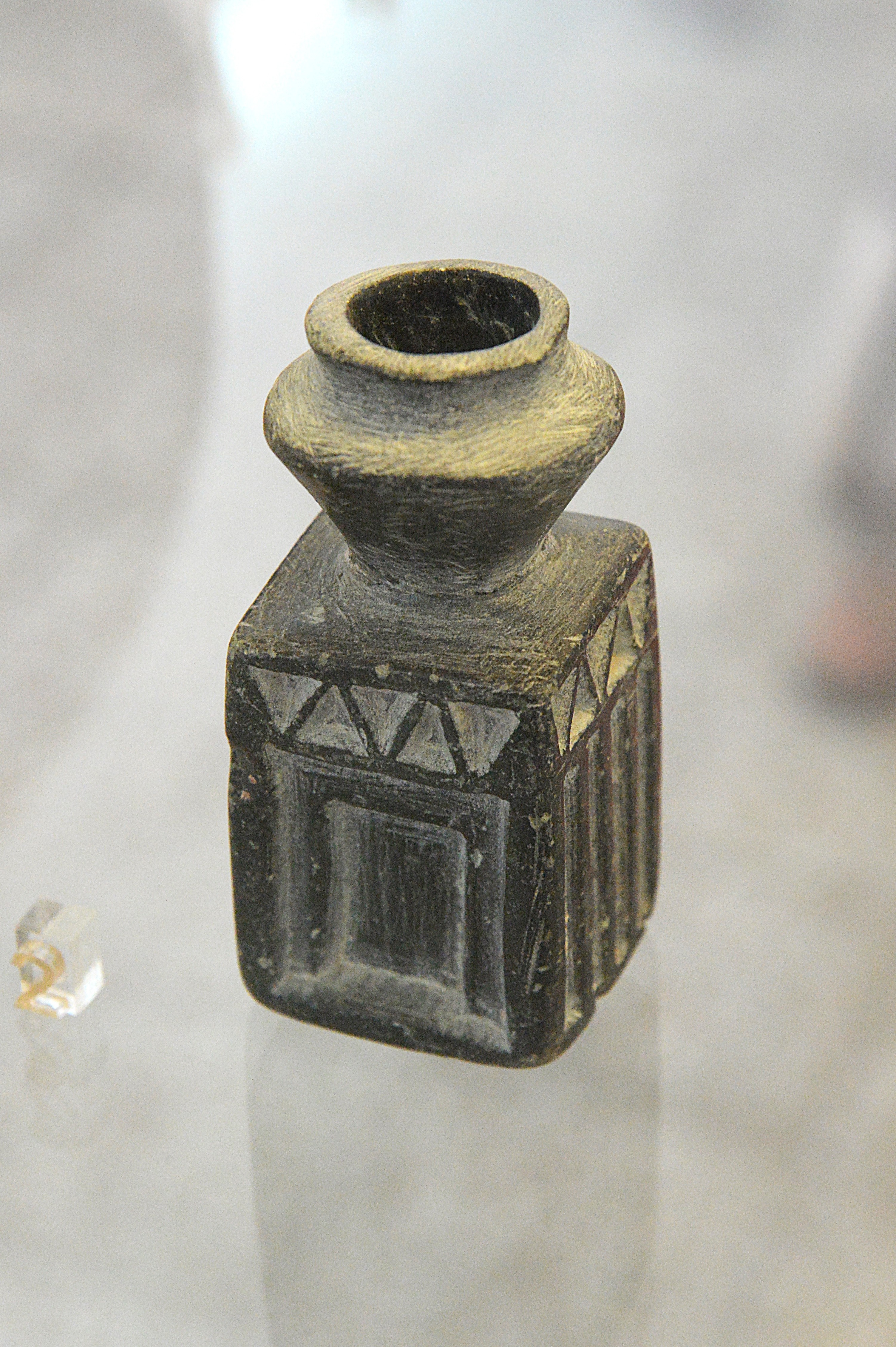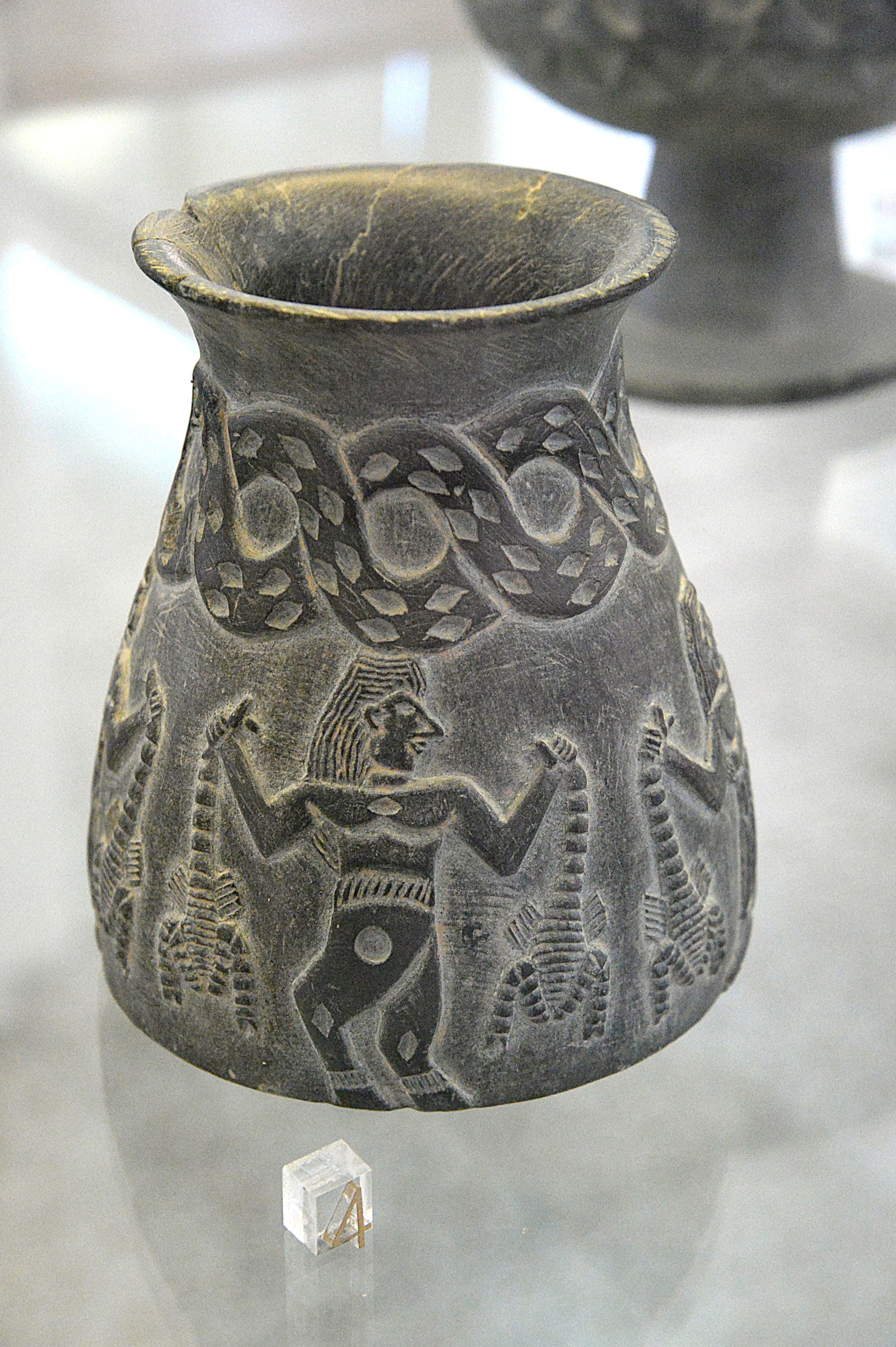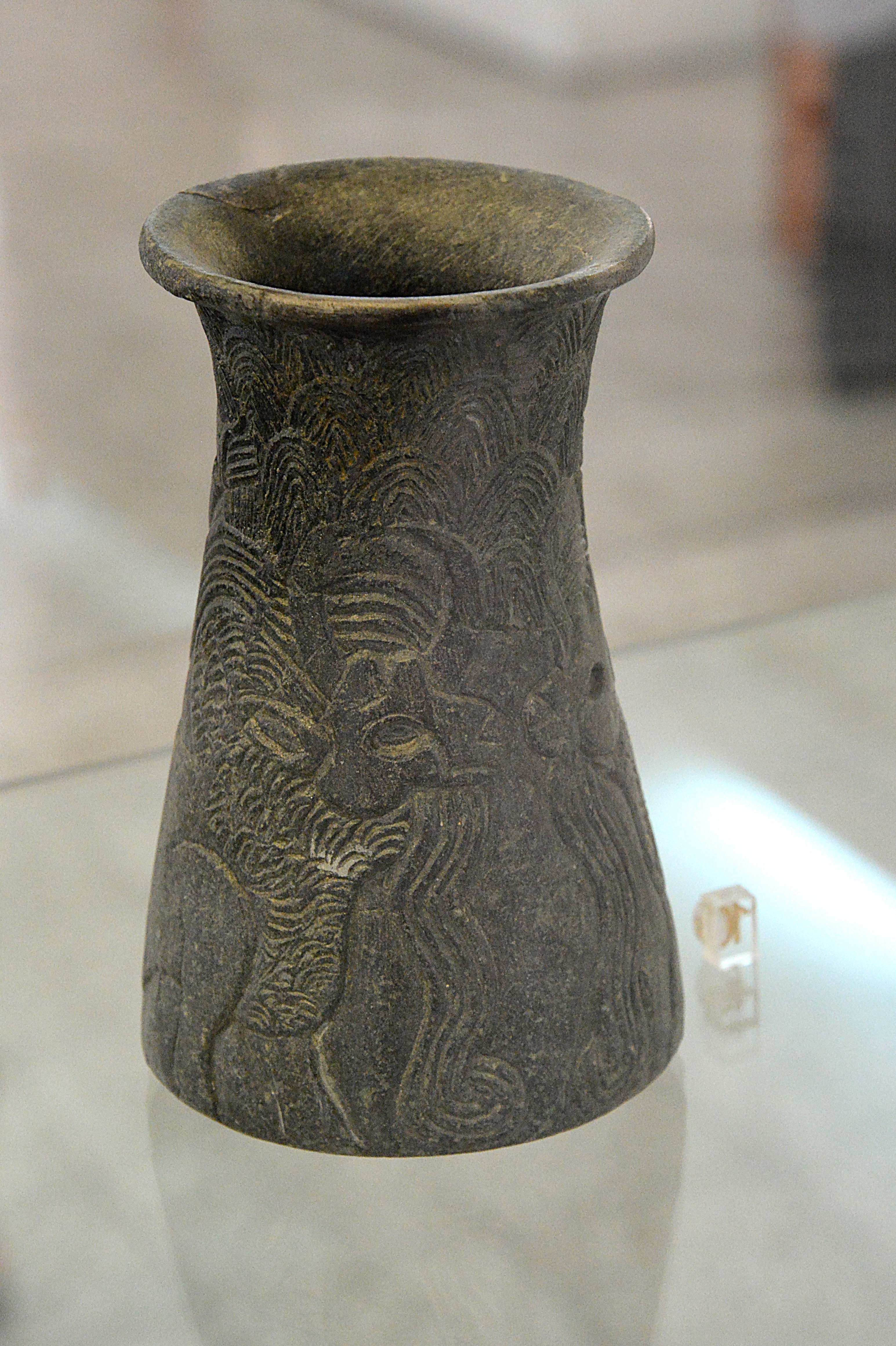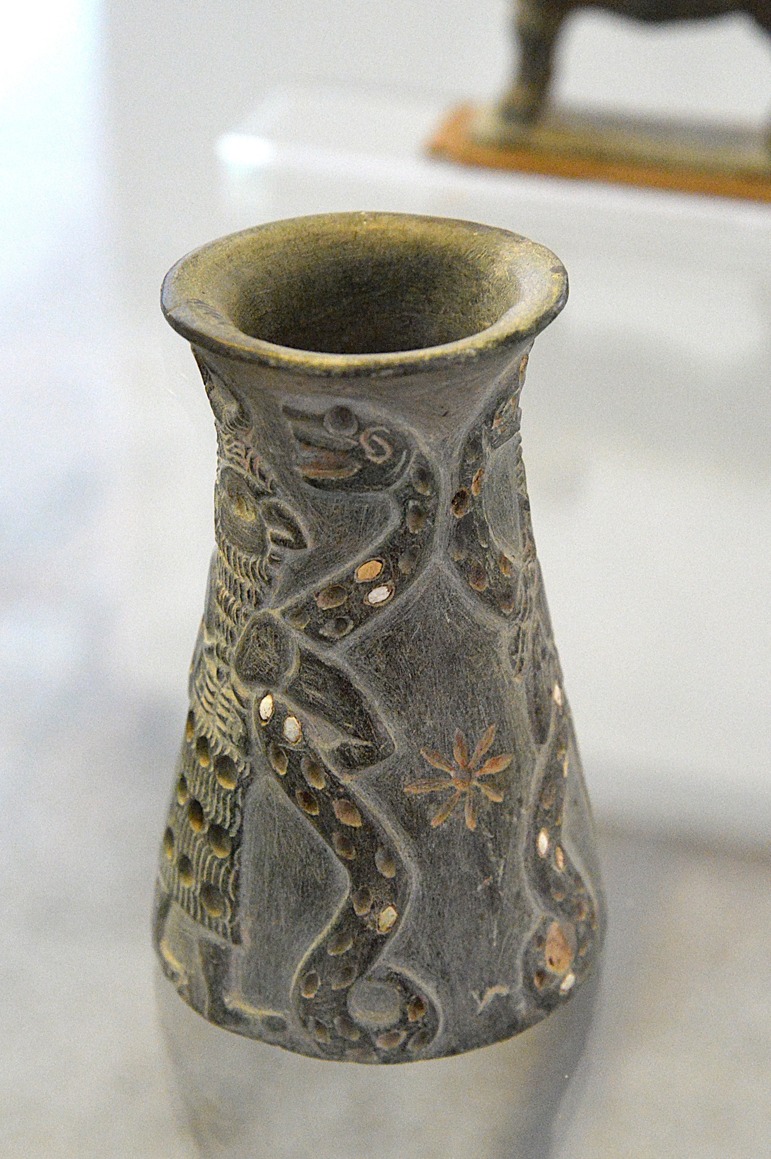 Il est temps que je vous présente les objets et récipients en pierre que j’ai photographié dans ce musée, des pièces en stéatite et en chlorite sculptée avec une élégance particulière, dont certaines conservent des incrustations qui sont soit en pierre de couleur, soit en nacre. Sur ces pièces, sont représentés des humains, des divinités, des animaux, des palmiers, des serpents et des scorpions, la plupart avec des yeux incrustés.