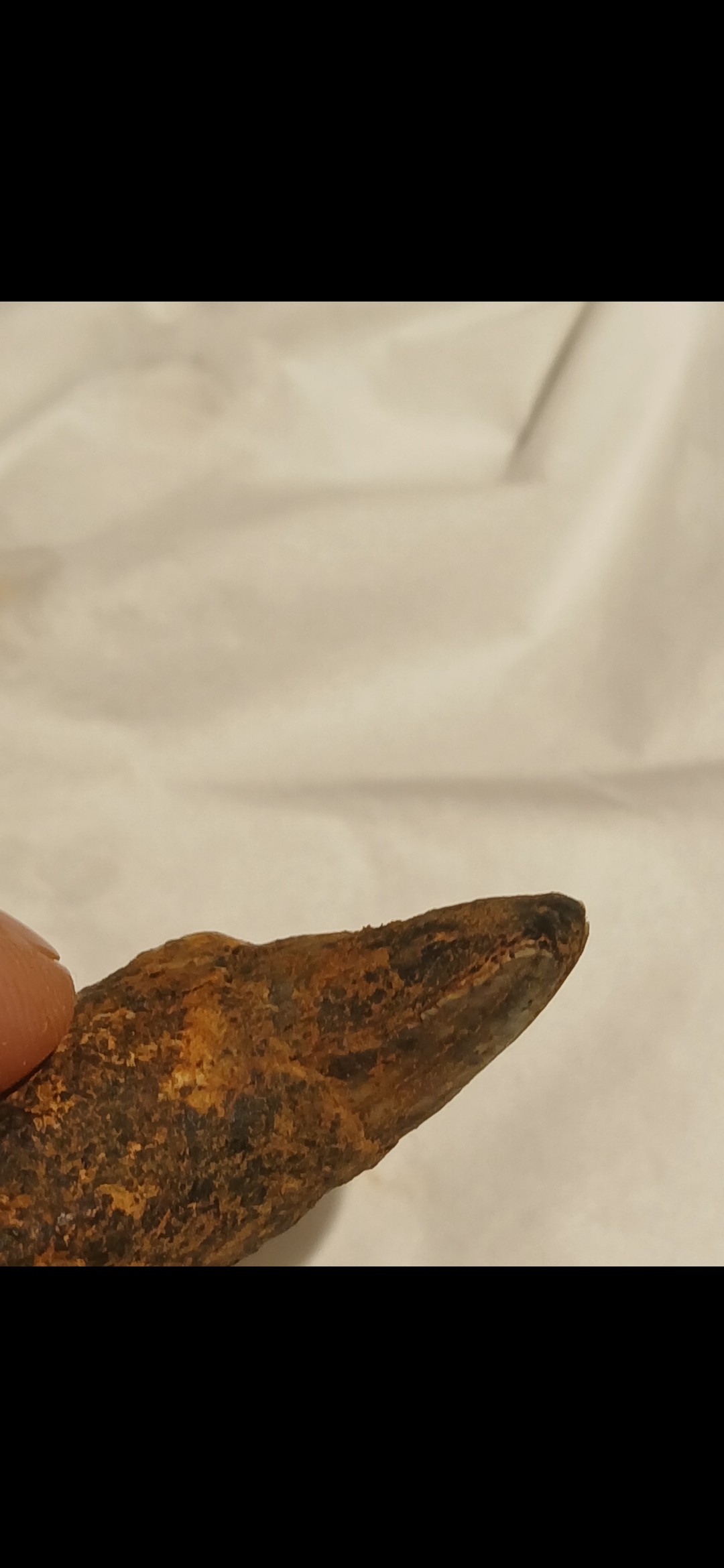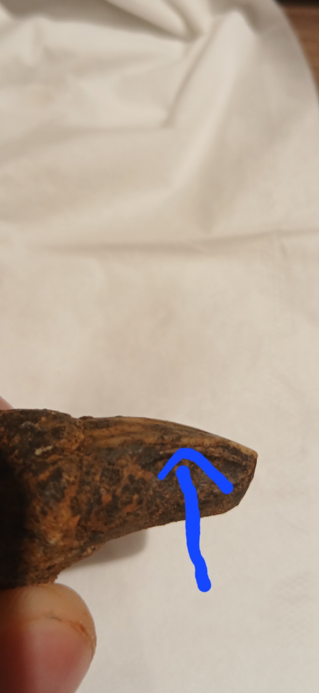 les cannelures et petites bosses sur l'émail de la dent auraient tendance à indiquer qu'il s'agit d'un herbivore, de plus la dent ne montre pas de signe claire de carnivorité, une photo de la dent nettoyée aurait été un plus