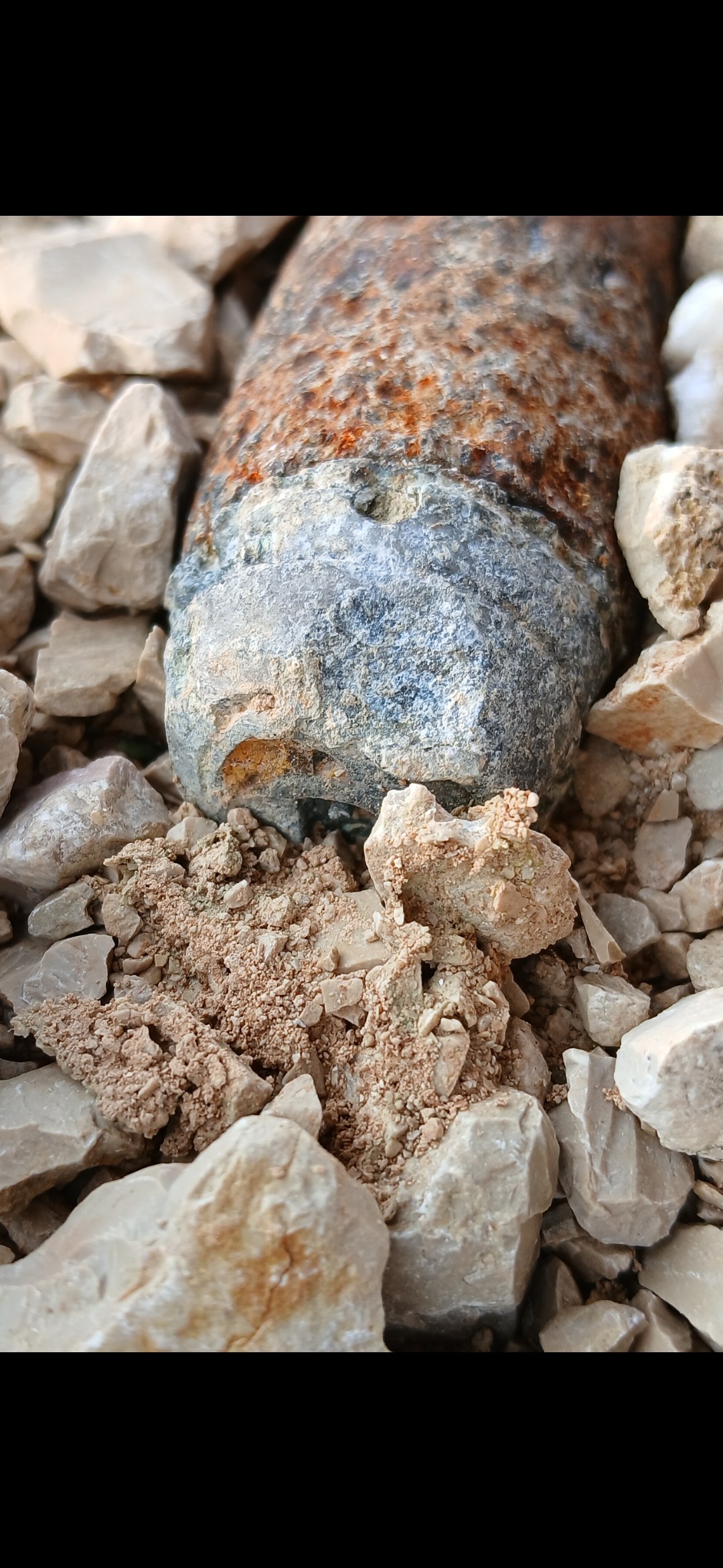 Il y a 6 mois de cela, j'ai fait un petit détour pour visiter une carrière en exploitation à la recherche d'invertébrés du secondaire. En me promenant et scrutant les déblais je suis tombé sur ce "bel" objet métallique, la forme très curieuse m'a fait faire prendre quelques photos. Ne pensant que ca n'arrive que dans les films je croyais que ce n'était qu'un reste de machine ou d'engin de carrière, de forme suggestive bref... Pas un obus. Avec le recul j'ai bien fait de ne pas y toucher. Puis les mois ce sont écoulés et il y a quelques jours j ai posté cette chose sur un forum de militariat. La réponse fut brève et nette : obus d'artillerie de la 2 ème guerre, danger de mort. Bon du coup d'un coté j'ai bien fait de ne pas y toucher, d'un autre, maintenant je croise les doigts pour que ca ne pète pas, étant donné que la carrière a bougée depuis, cette bombe doit être ensevelie sous des tonnes de gravats. Il n'est donc plus possible d'appeler les démineurs sans savoir ou est l'objet.