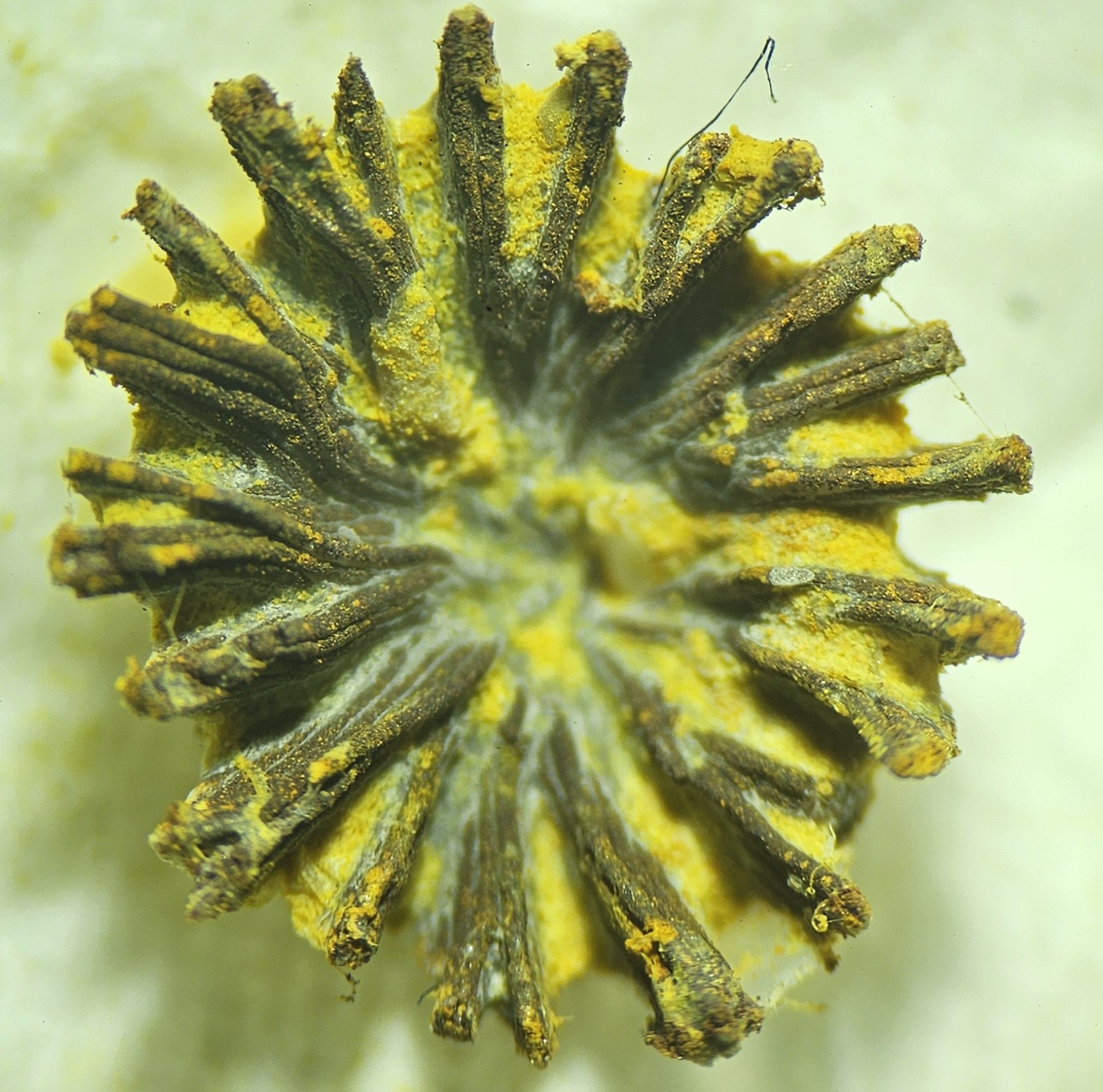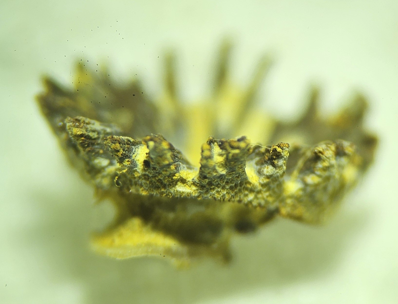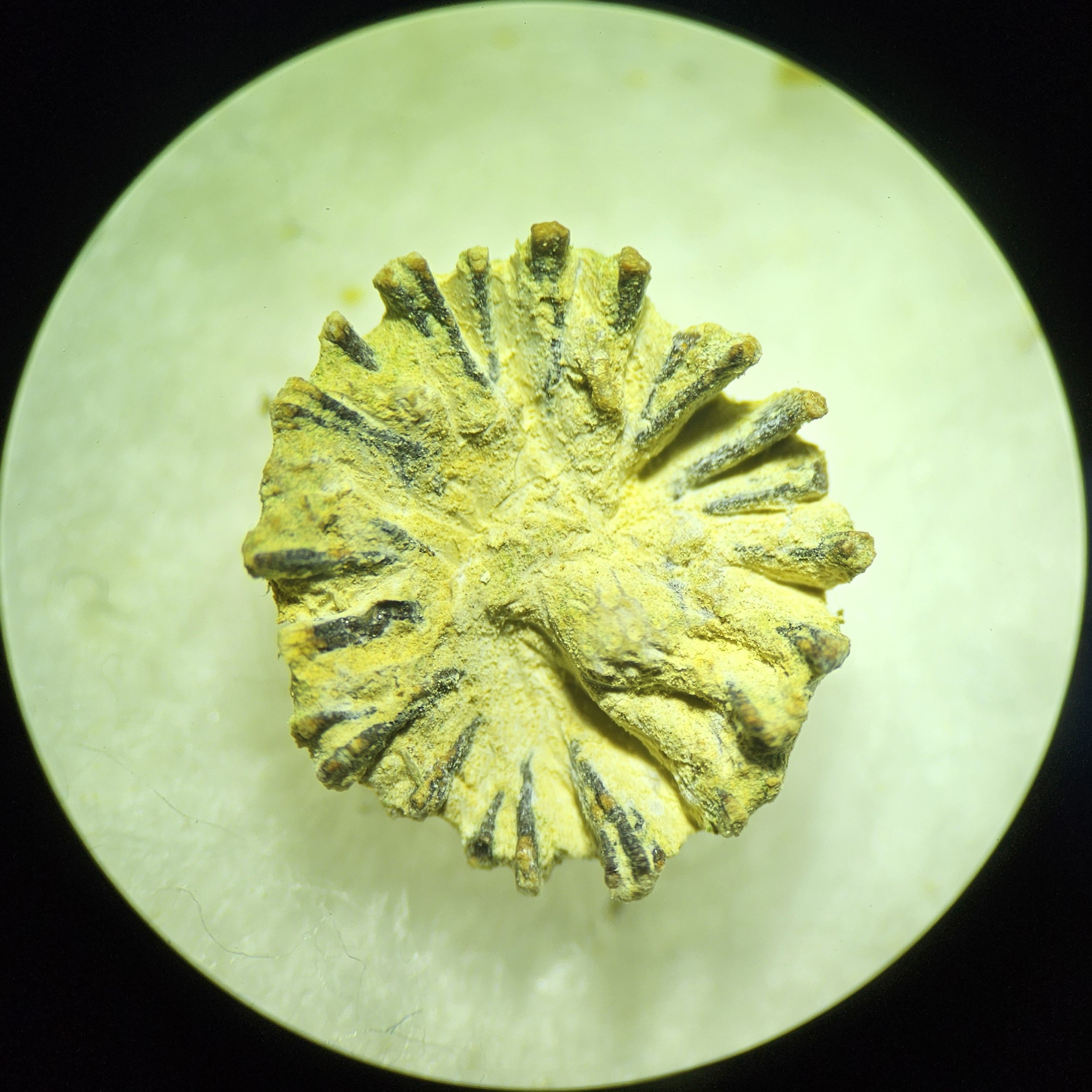 Ceci exposé, j'ai du mal à me figurer à quoi peut correspondre cette petite couronne radiée (environ 8 mm de diamètre). J'ai essayé de la préparer au mieux mais les rayons sont très cassants.