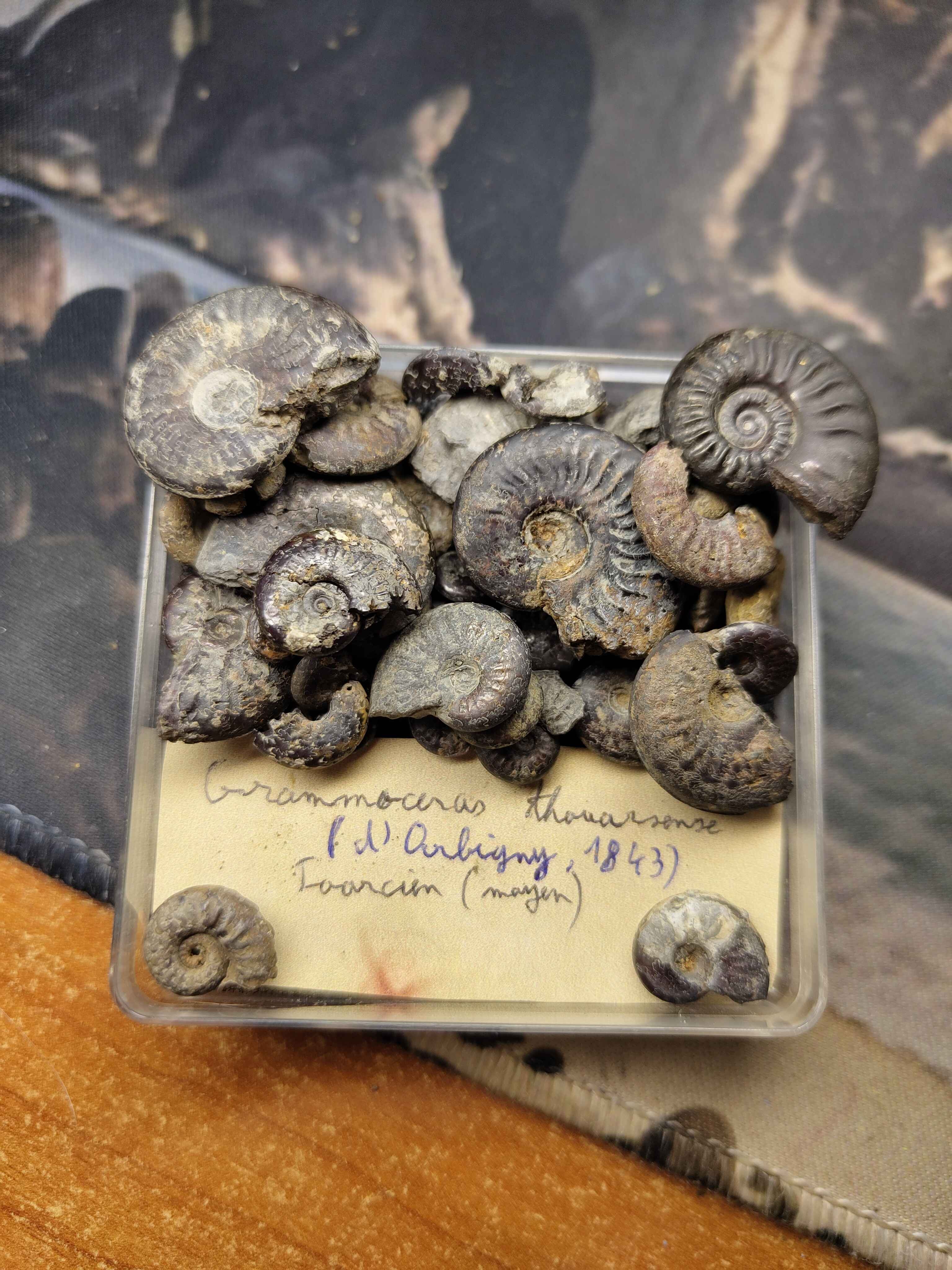 Celles que vous avez regroupées comme Grammoceras n'en sont pas. Il y a là un mélange Toarcien moyen/Toarcien supérieur. En haut à droite, Pseudogrammoceras reynesi, et en bas à droite aussi, bien qu'il soit la plupart du temps impossible d'identifier un immature au niveau de l'espèce. On voit également une Pseudolioceras compactile, incomplète contre le bord droit de la boite. Des Osperlioceras et une autre probable Pseudolioceras (mais pas compactile)  vers le milieu à droite.