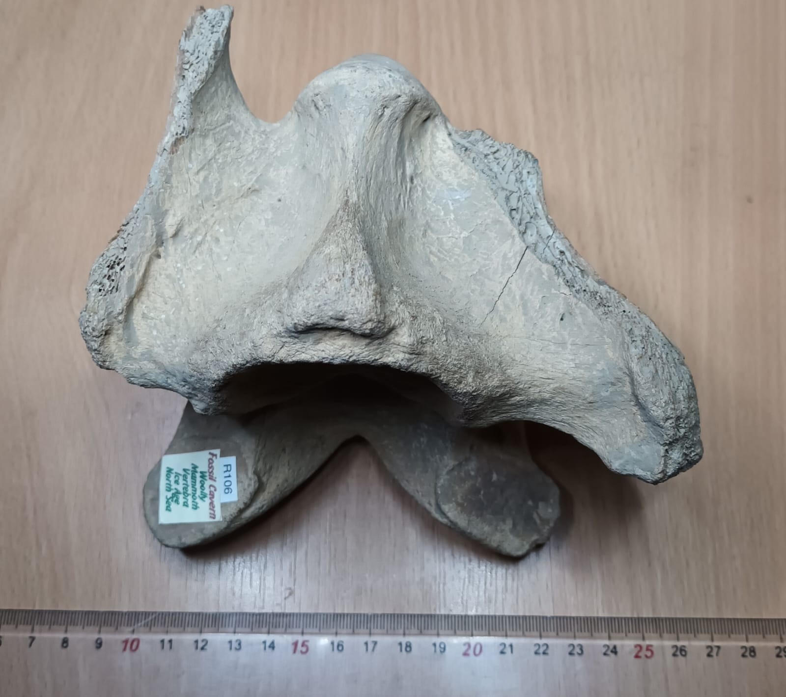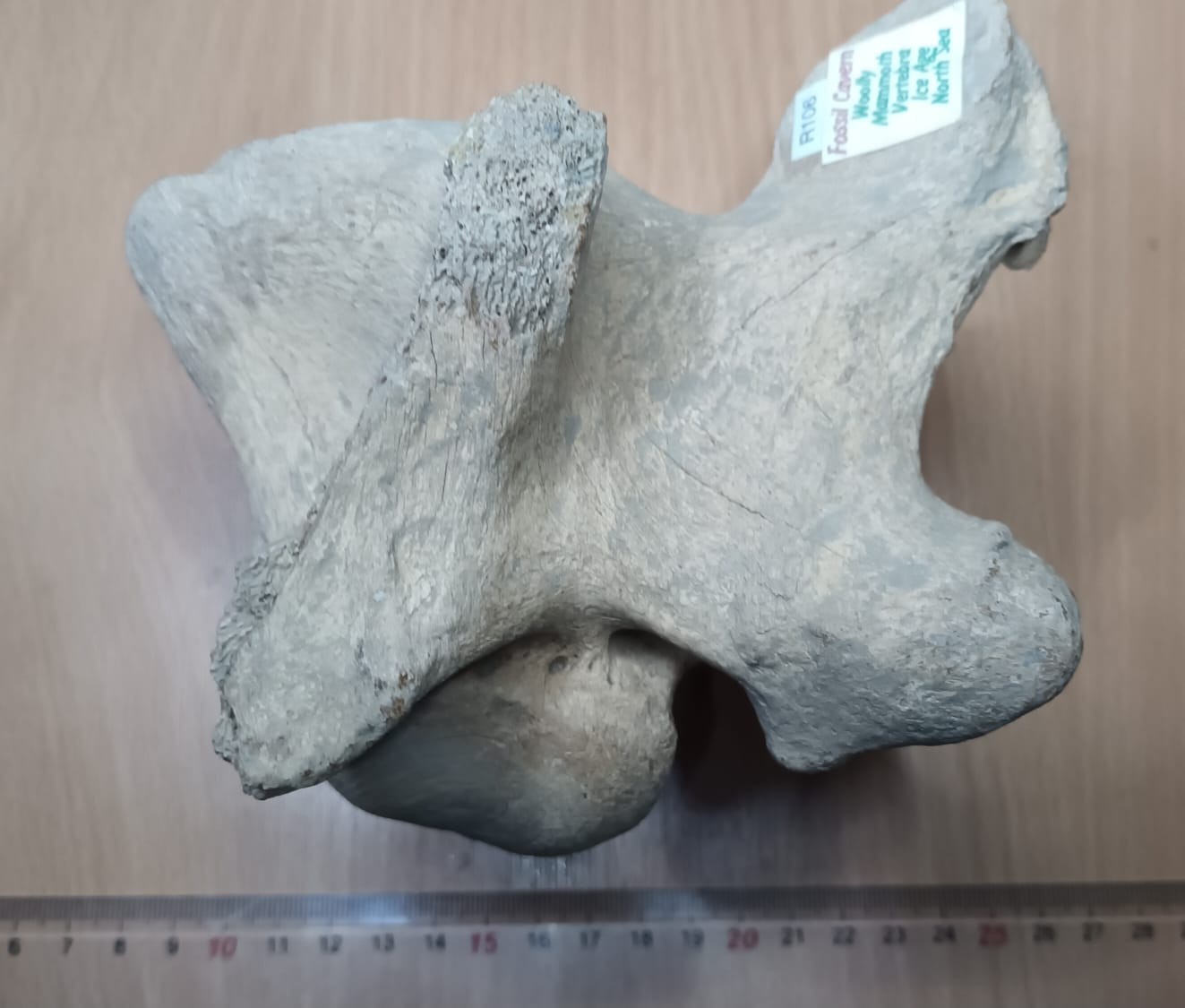Personnellement j'y vois une vertèbre de Rhinocéros, voir de Bison en tout rien à voir avec du Mammouth les vertèbres sont plates et n'ont pas d'apophyses latérales marquées comme celles-ci