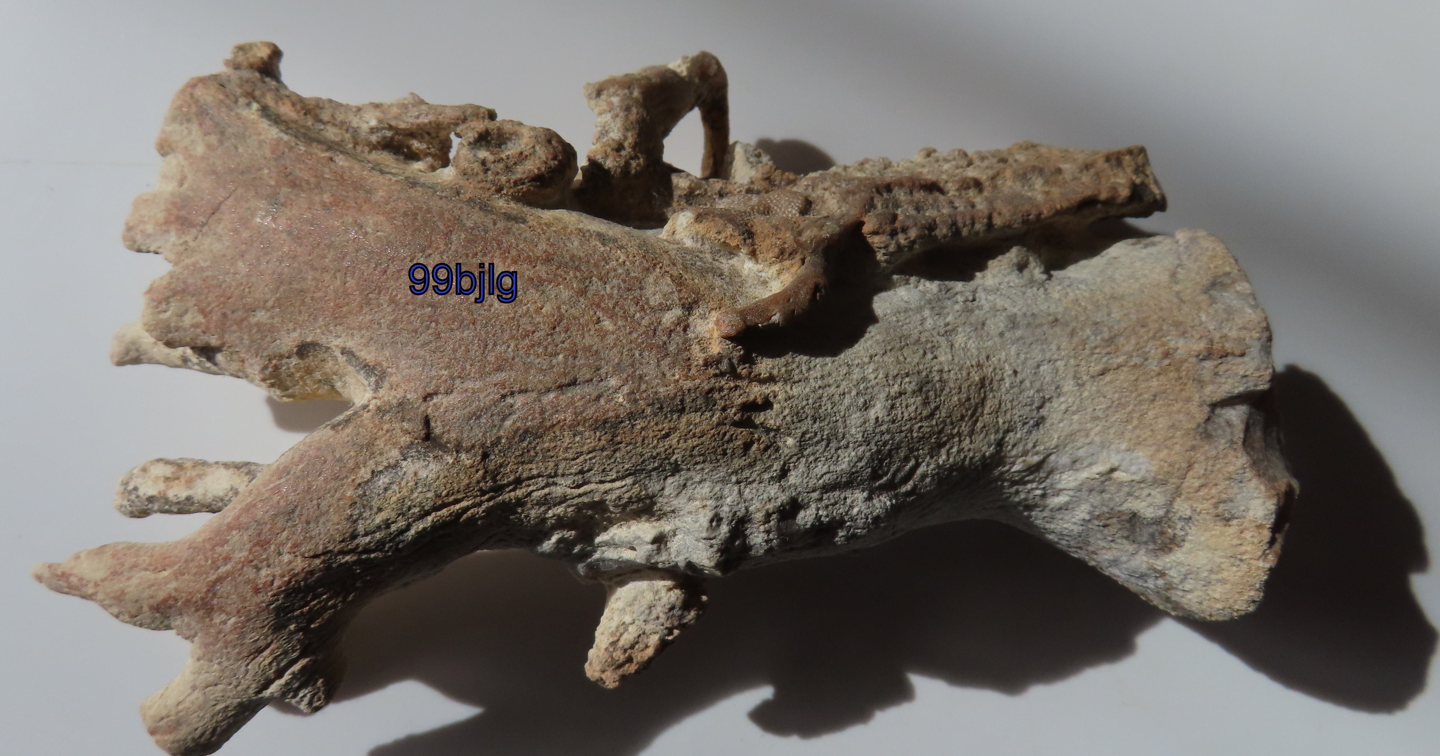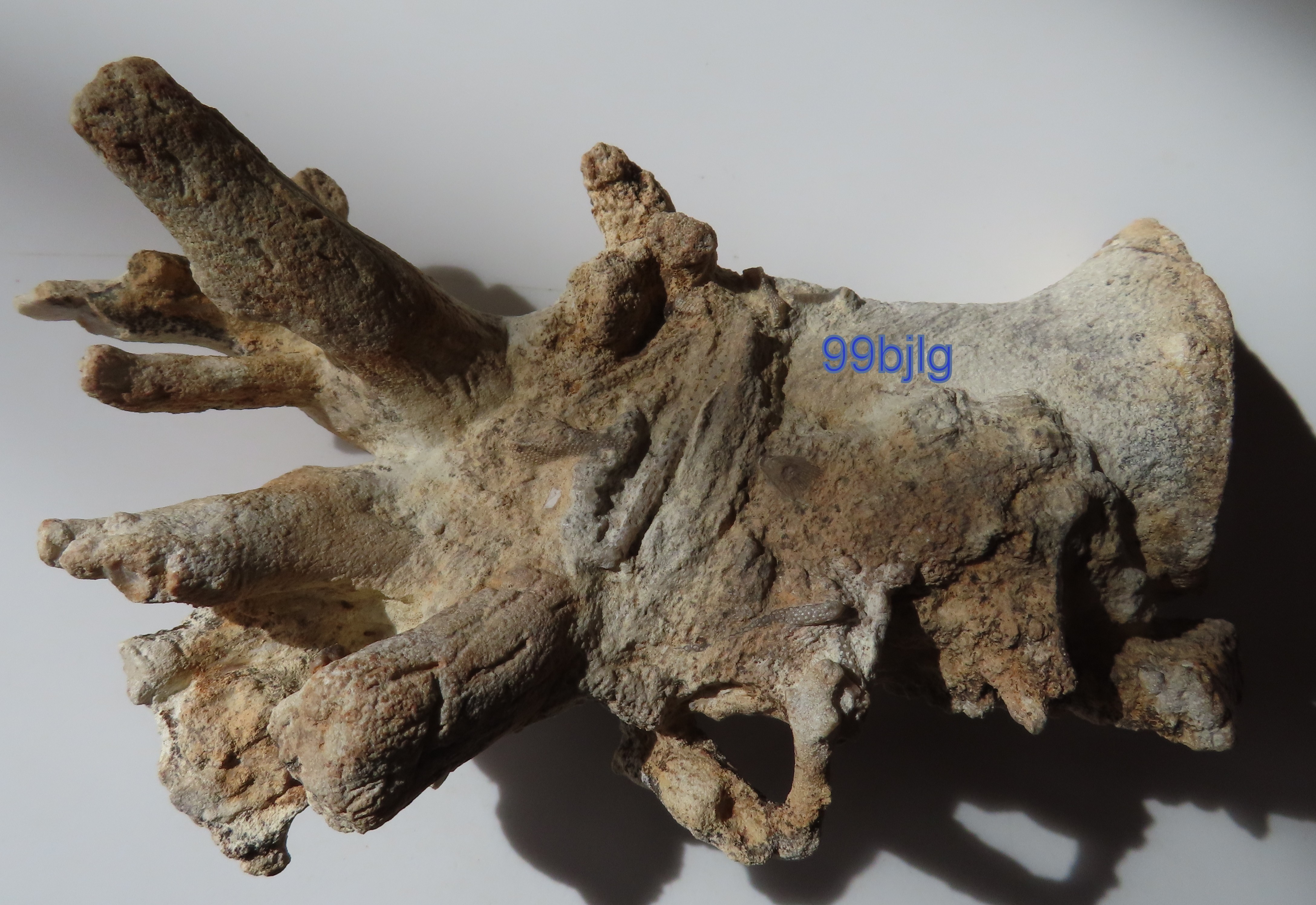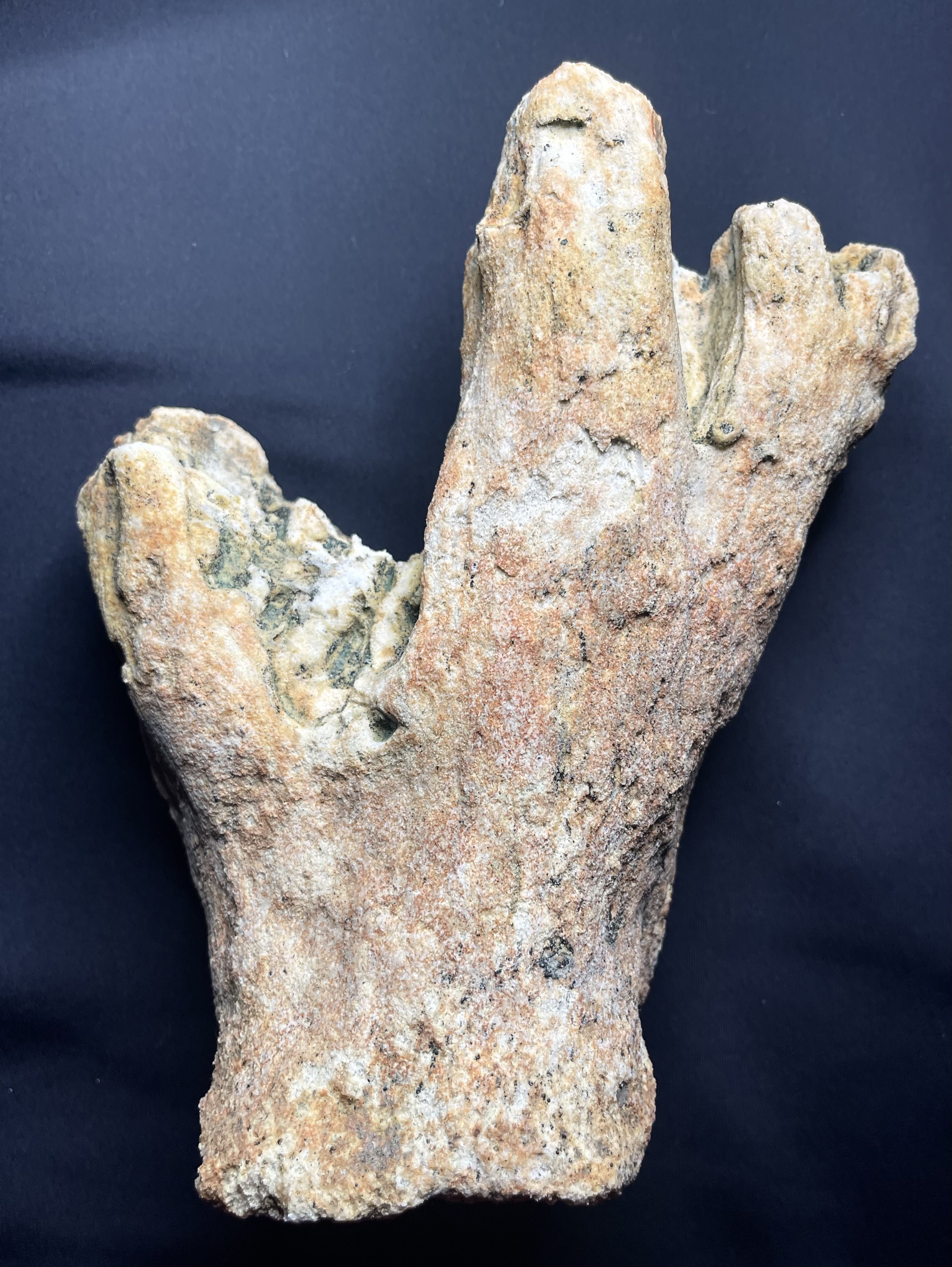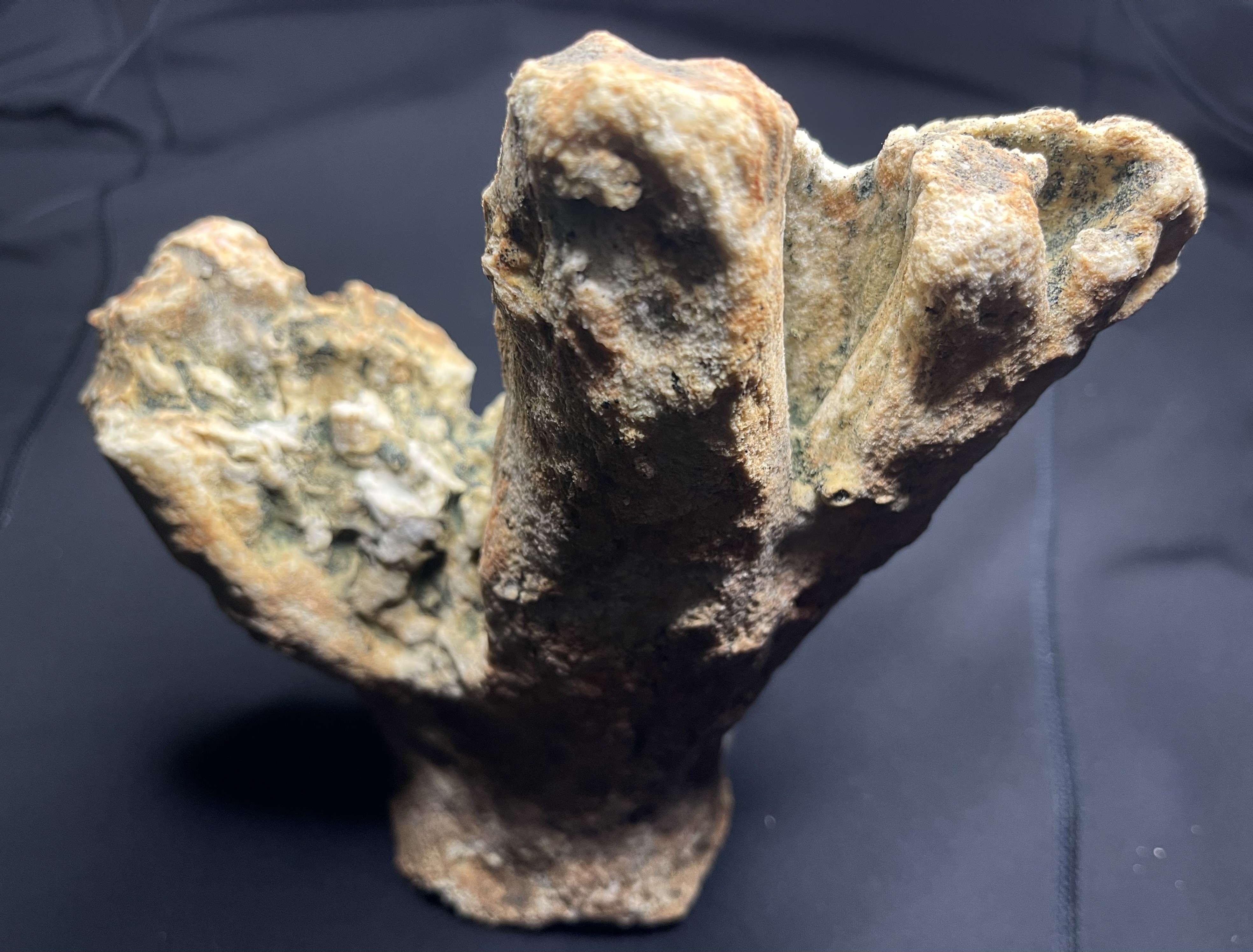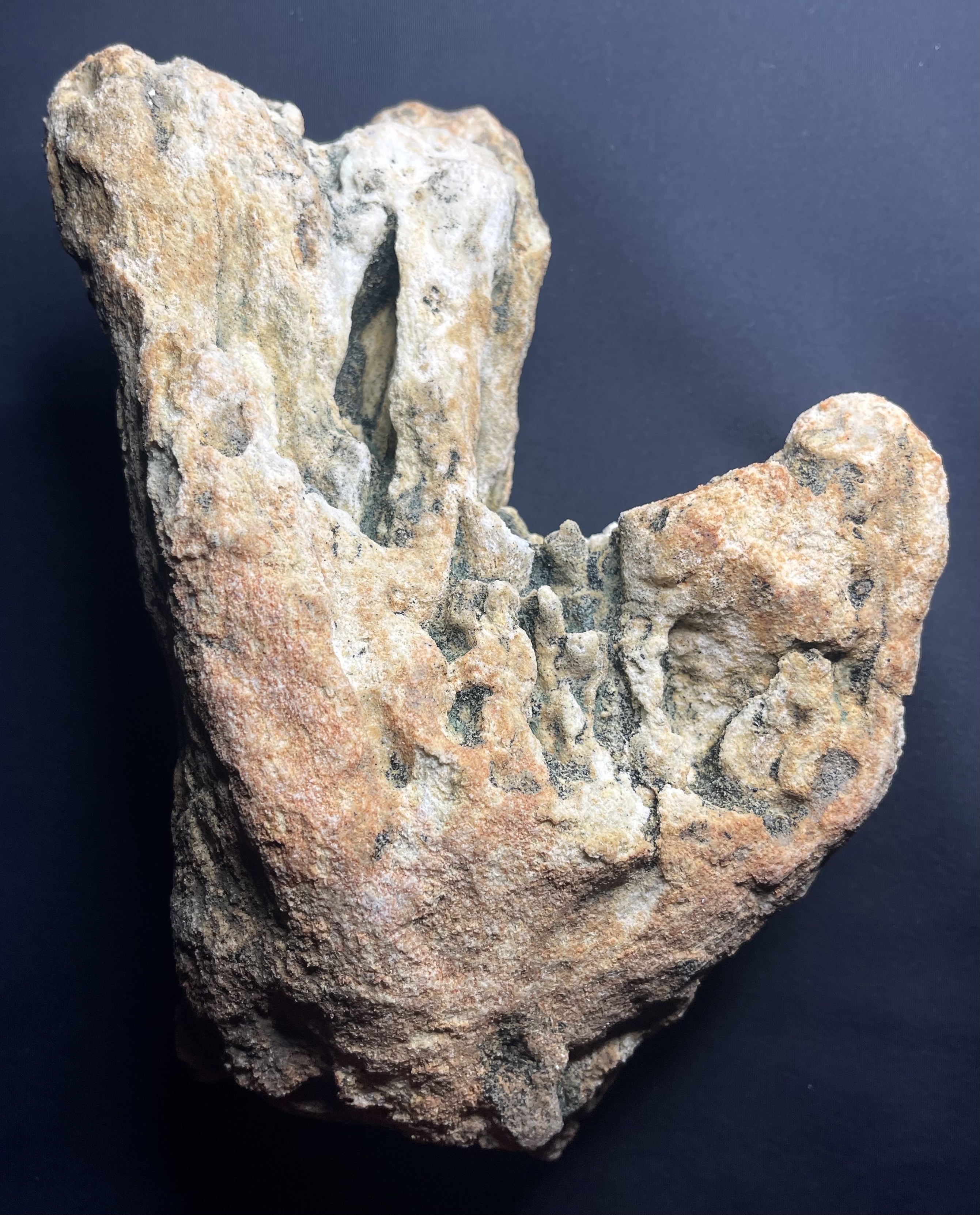 Je pense qu'il s'agit d'un spongiaire assez usé, on observe des traces verdâtres à l'intérieur du spécimen, indiquant un âge du Cénomanien à Villers sur Mer, mais il a pu être transporté sur de grande distance, c'est régulièrement que l'on trouve des fossiles provenant d'autres localités d'un autre site, ou encore plus simple une action humaine