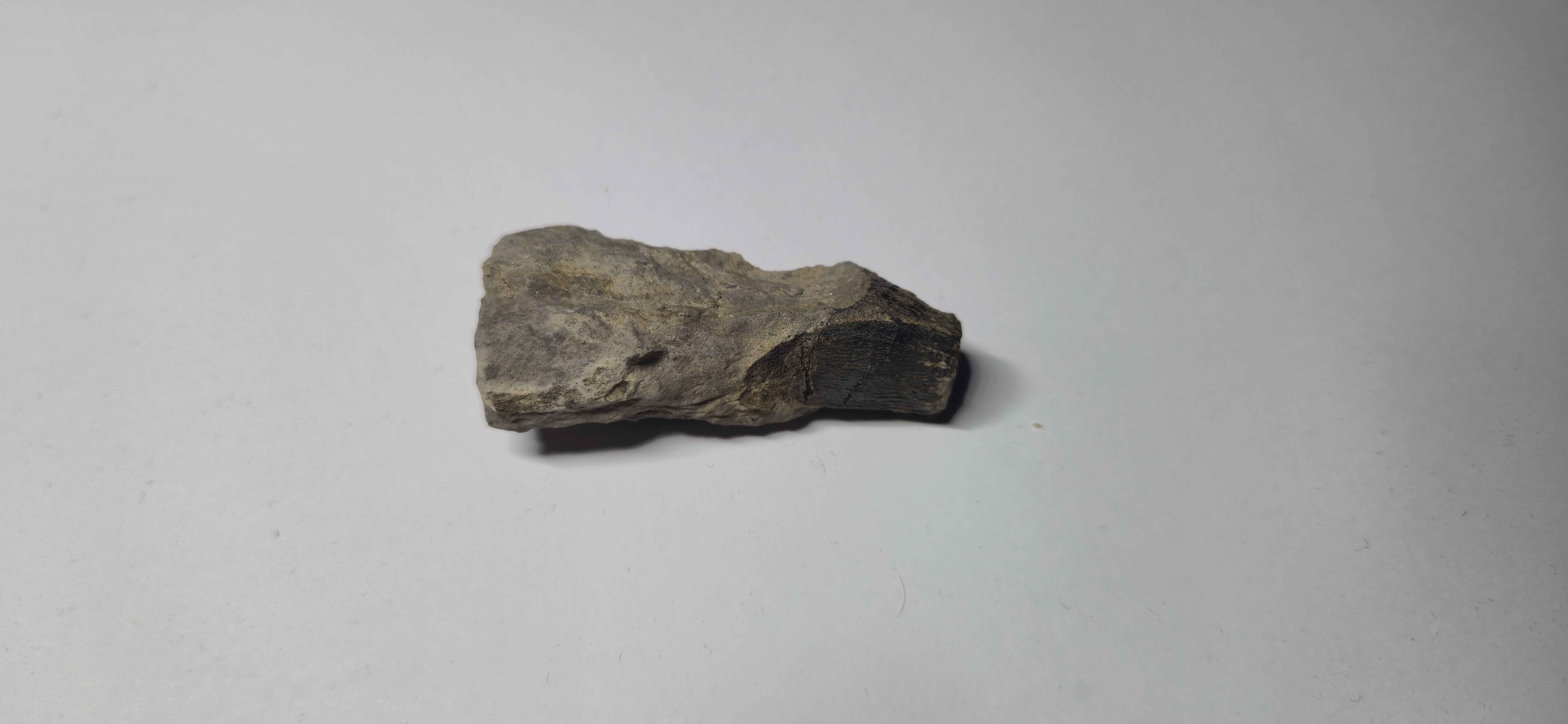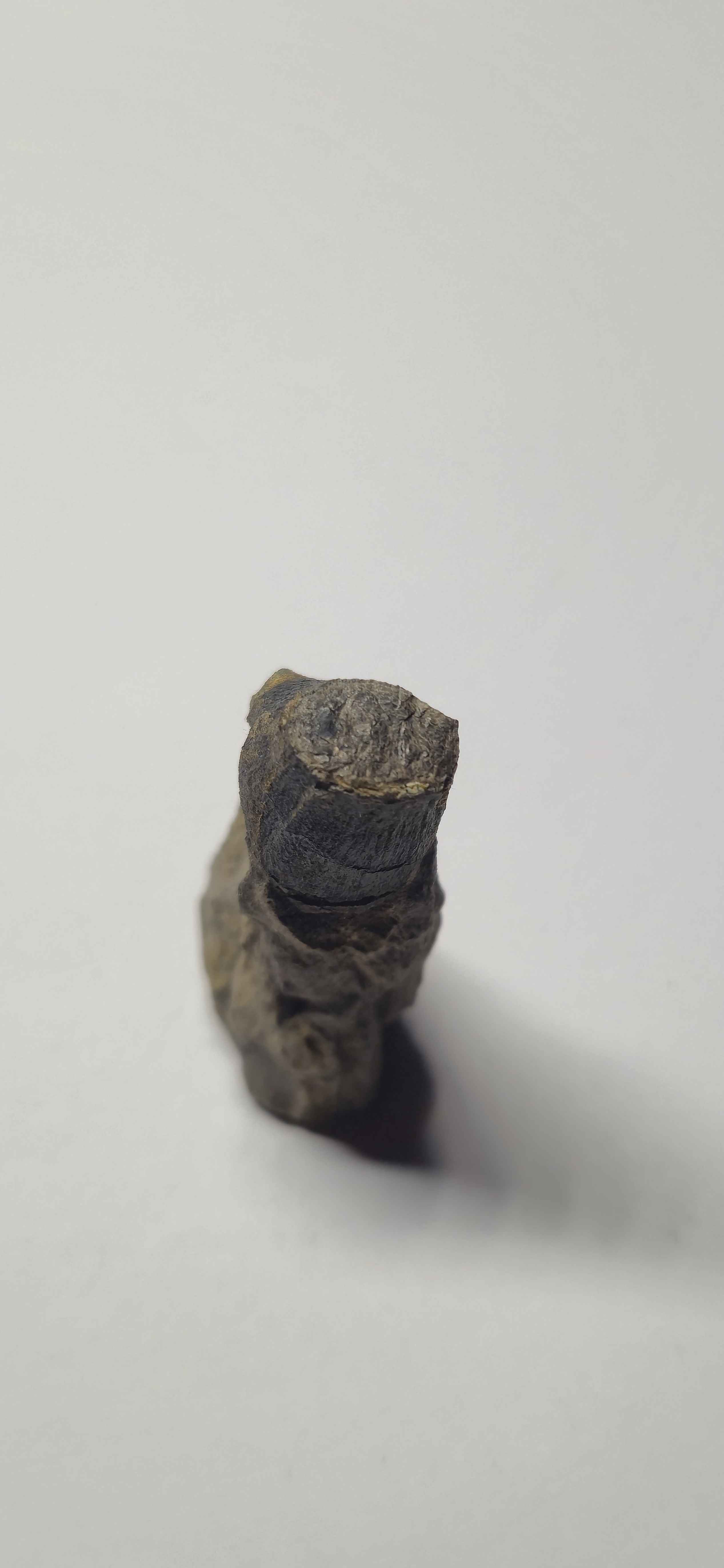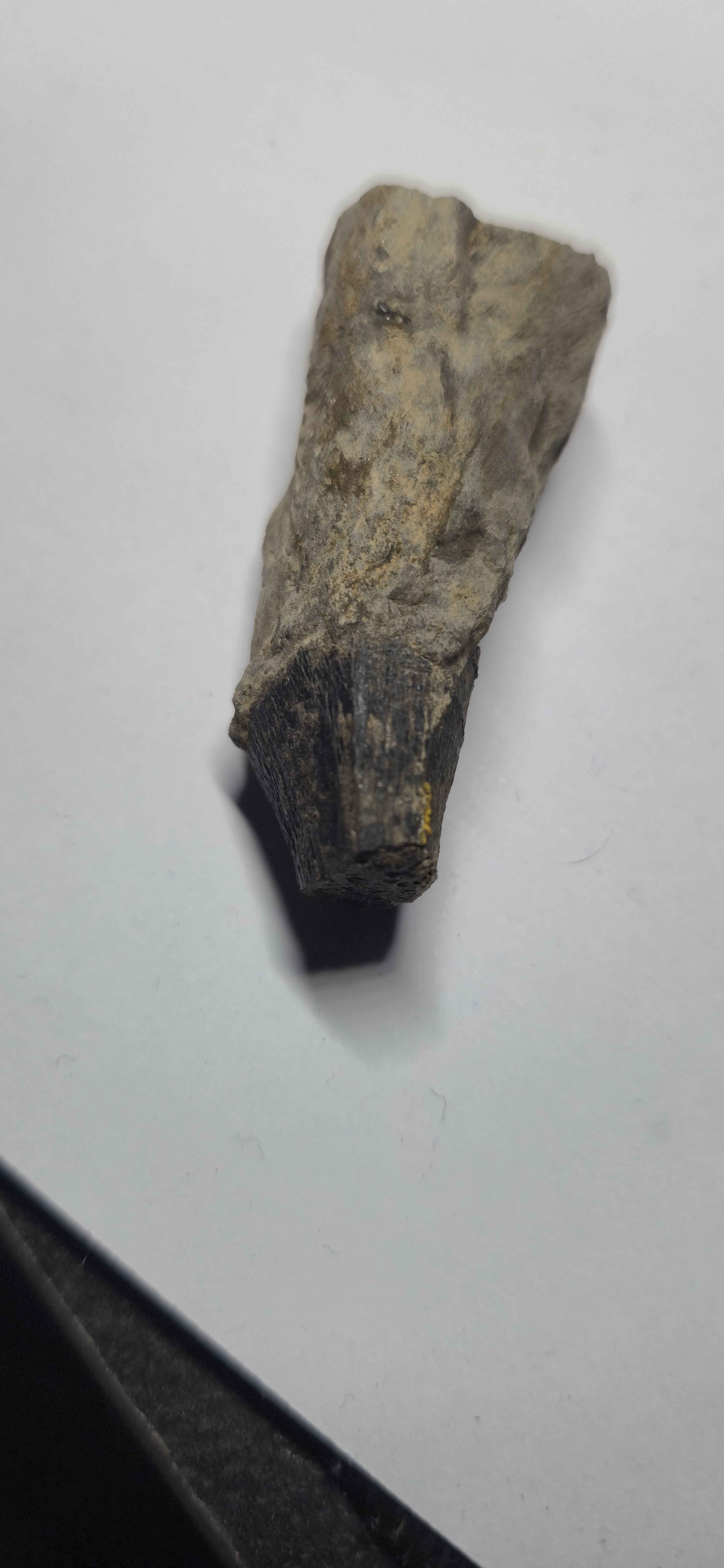 Cependant, le mystère demeure quant à sa nature : on hésite toujours entre une dent et du bois. Il provient probablement du Toarcien moyen et/ou supérieur. Je l’ai trouvé sur un bloc d’éboulis de marne grise contenant quelques traces d’ammonites, mais rien de très remarquable. En revanche, sur un coin du bloc, j’ai remarqué quelque chose qui ressortait fortement en noir. J’ai donc décidé de l’extraire et de le ramener.