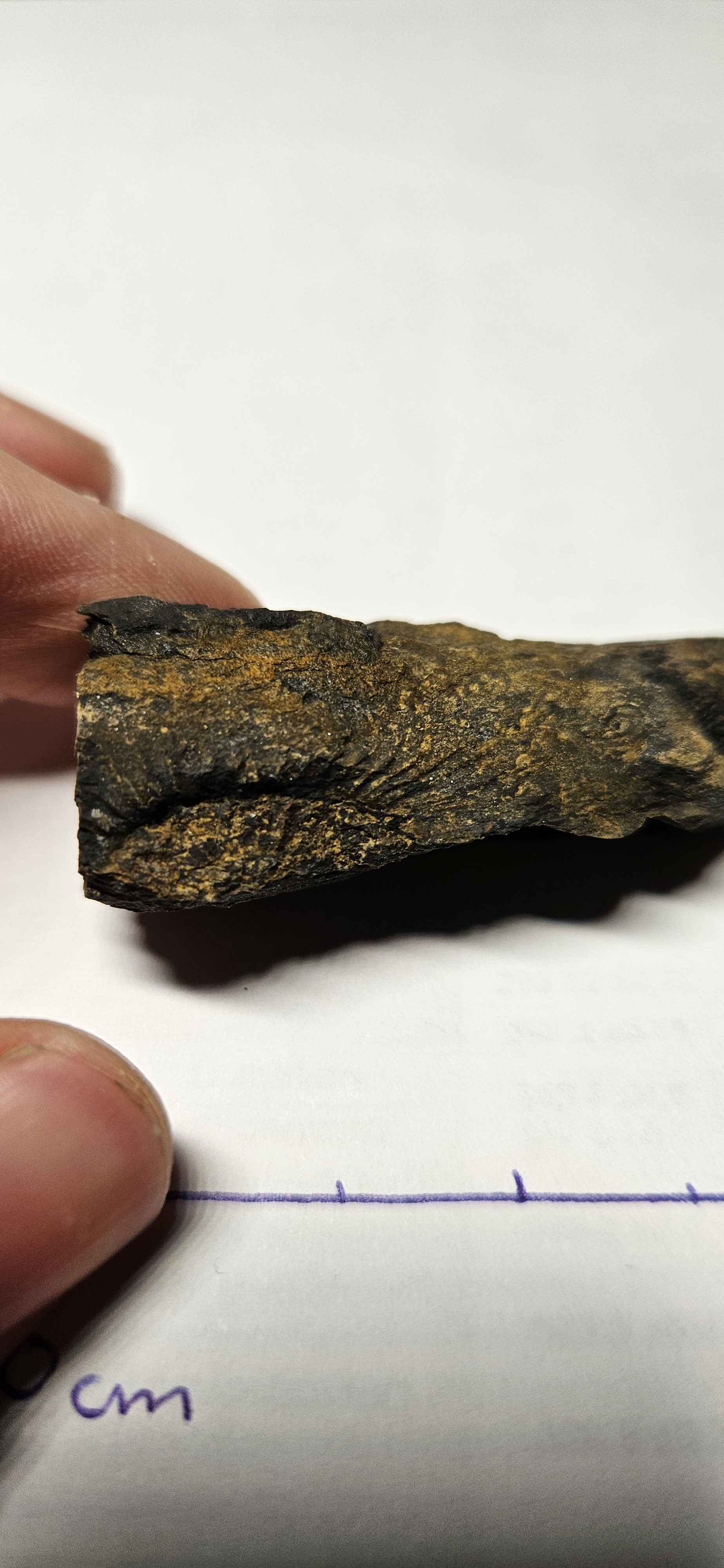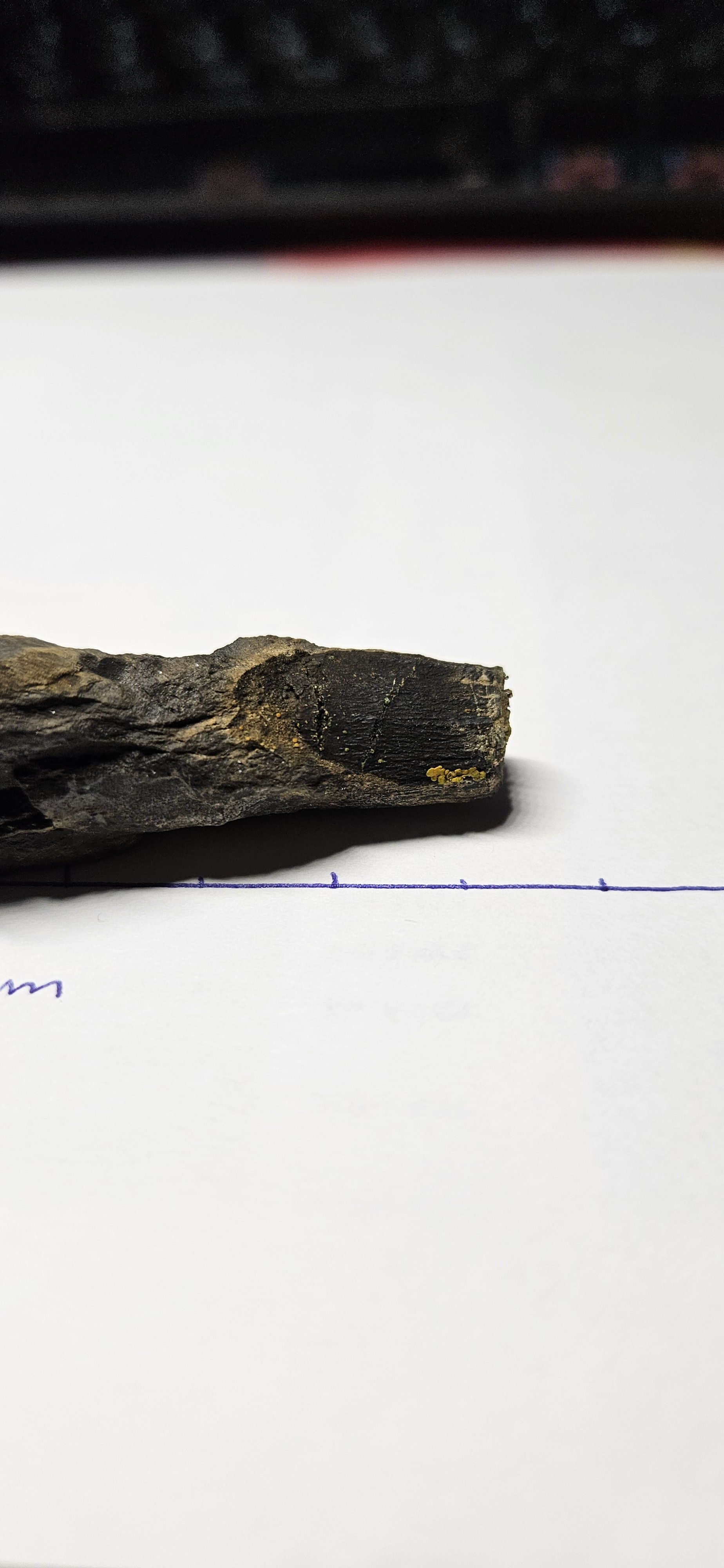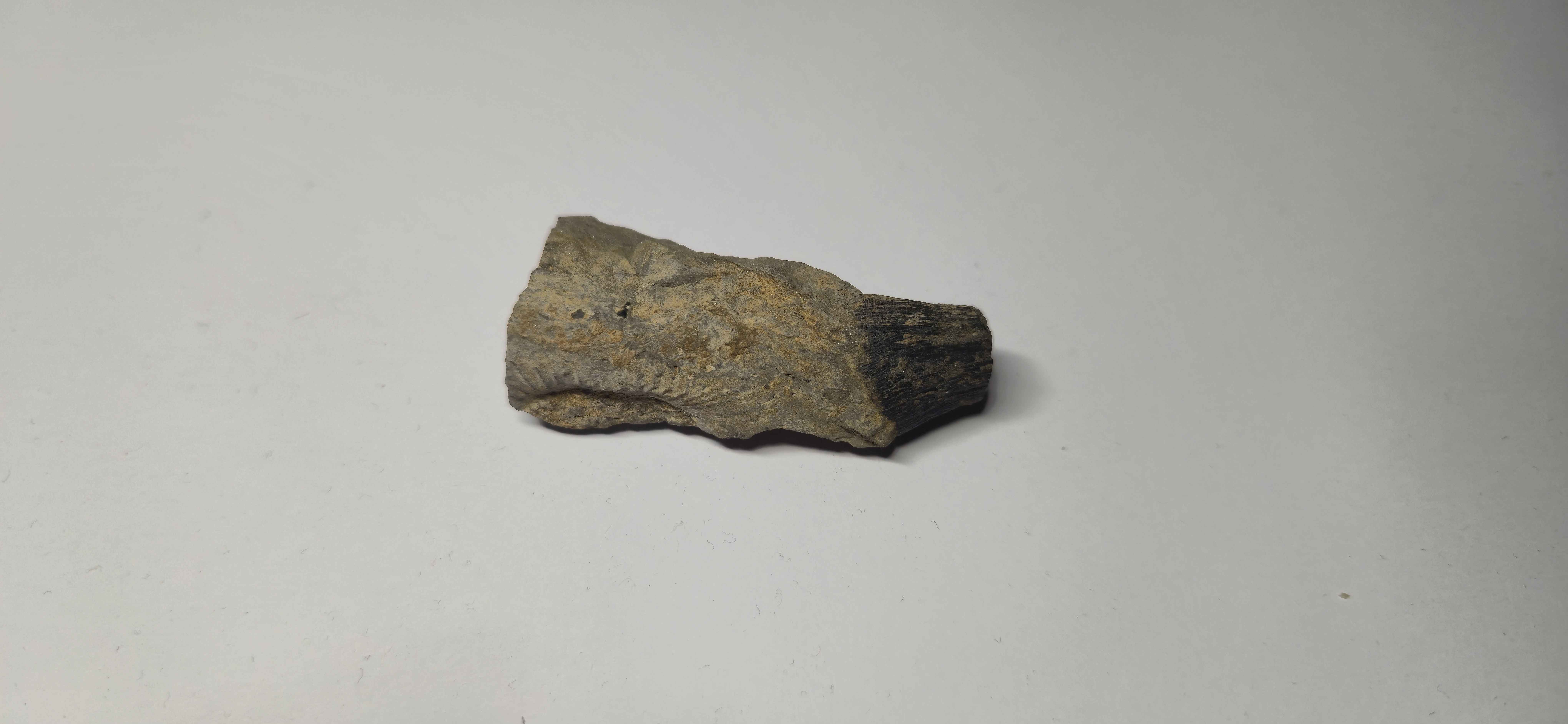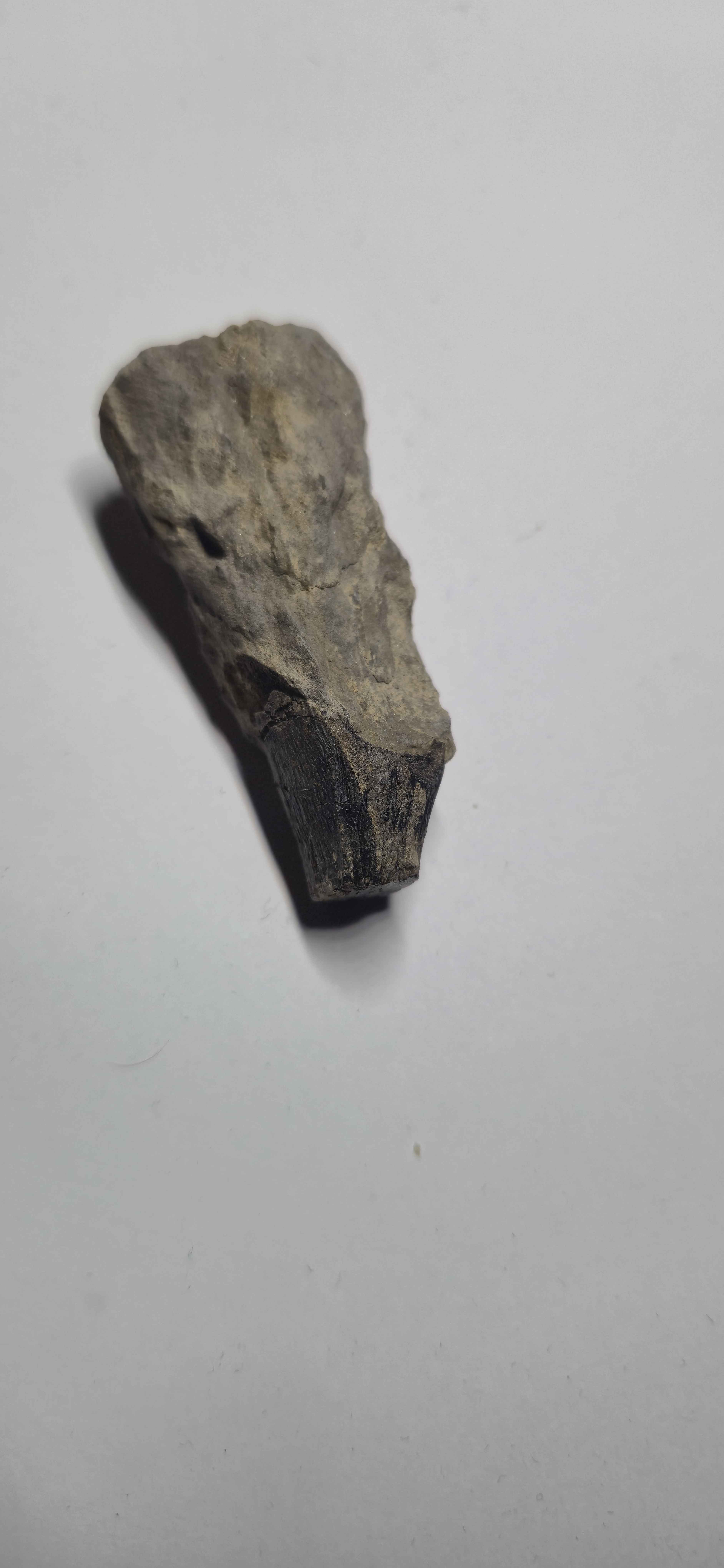 Cependant, le mystère demeure quant à sa nature : on hésite toujours entre une dent et du bois. Il provient probablement du Toarcien moyen et/ou supérieur. Je l’ai trouvé sur un bloc d’éboulis de marne grise contenant quelques traces d’ammonites, mais rien de très remarquable. En revanche, sur un coin du bloc, j’ai remarqué quelque chose qui ressortait fortement en noir. J’ai donc décidé de l’extraire et de le ramener.