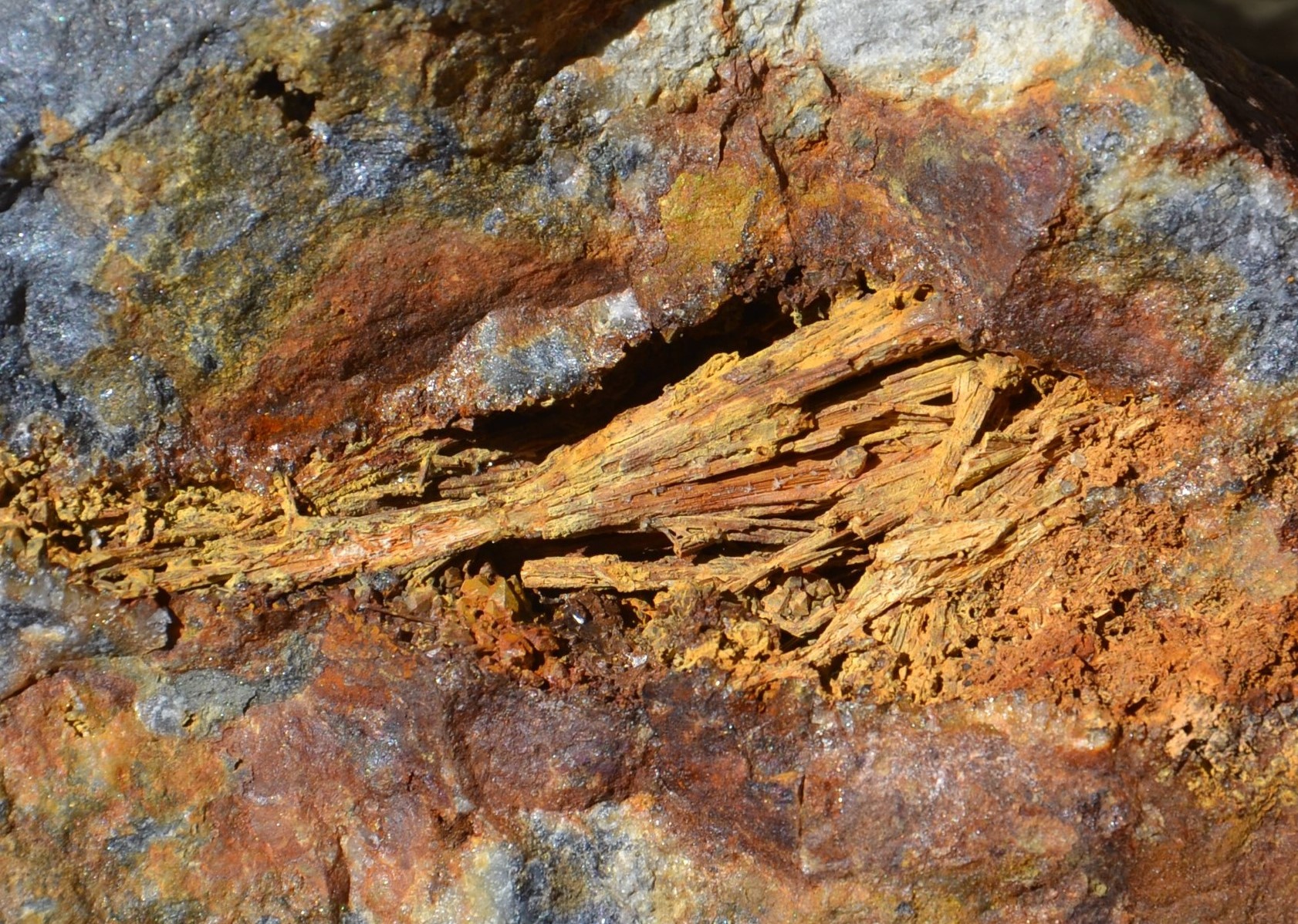 Stibine en cristaux radiés dans le calcaire dévonien et la calcite (blanche à rose), ancienne carrière (et fours à chaux) du Bois-Roux, Saint-Aubin-d'Aubigné (35).