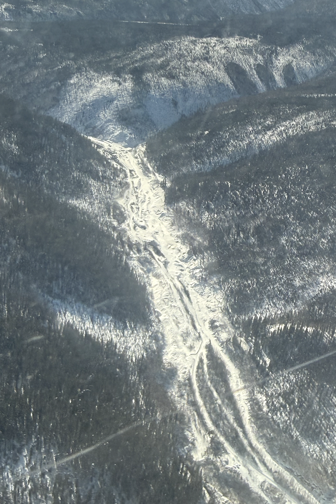 Les draguages modernes vus d'avion aux alentours de Dawson. Mes Photos ne leur rendent pas justice au niveau de leur ampleur… Ils ont sans doute repris les draguages anciens.