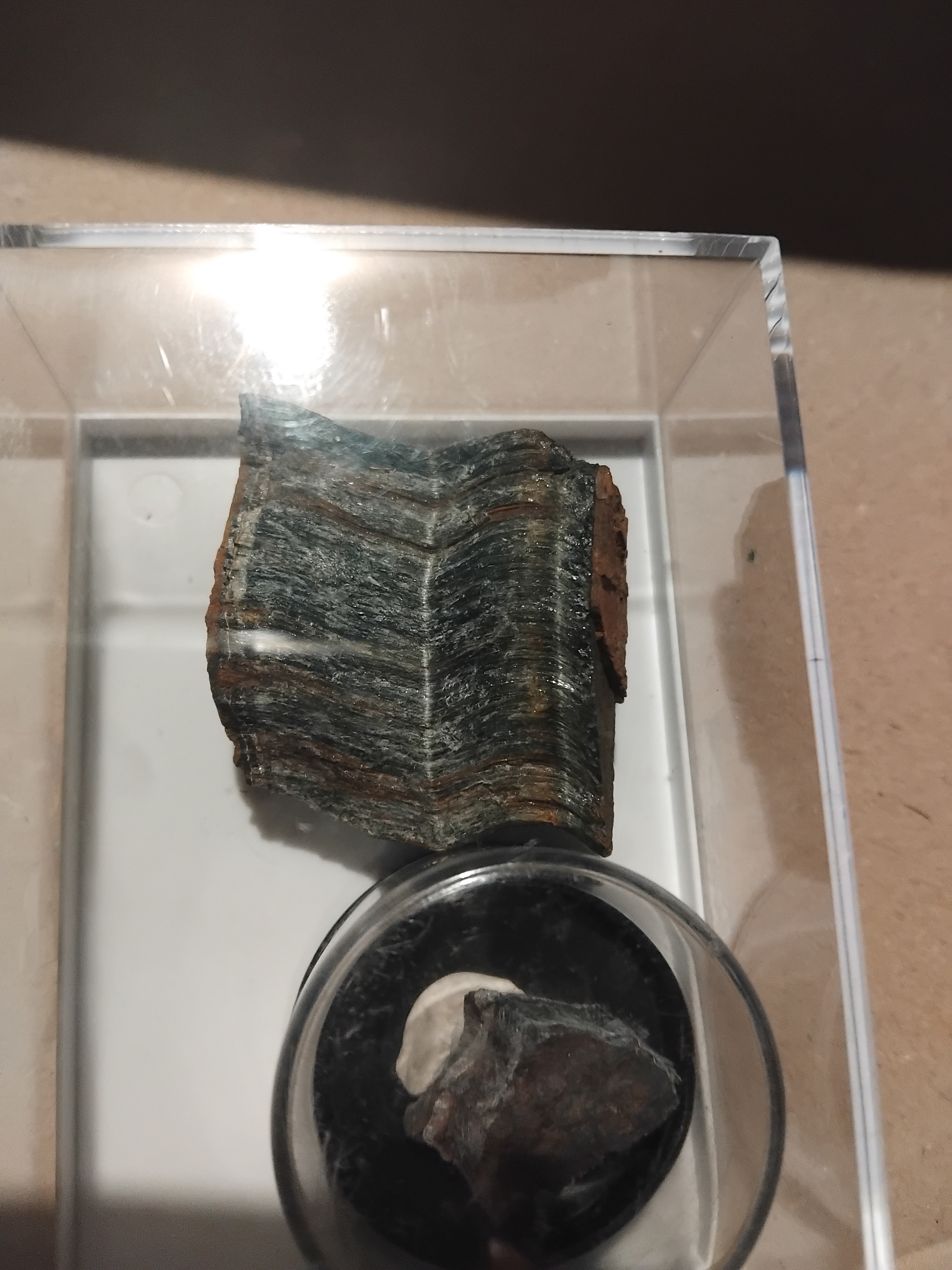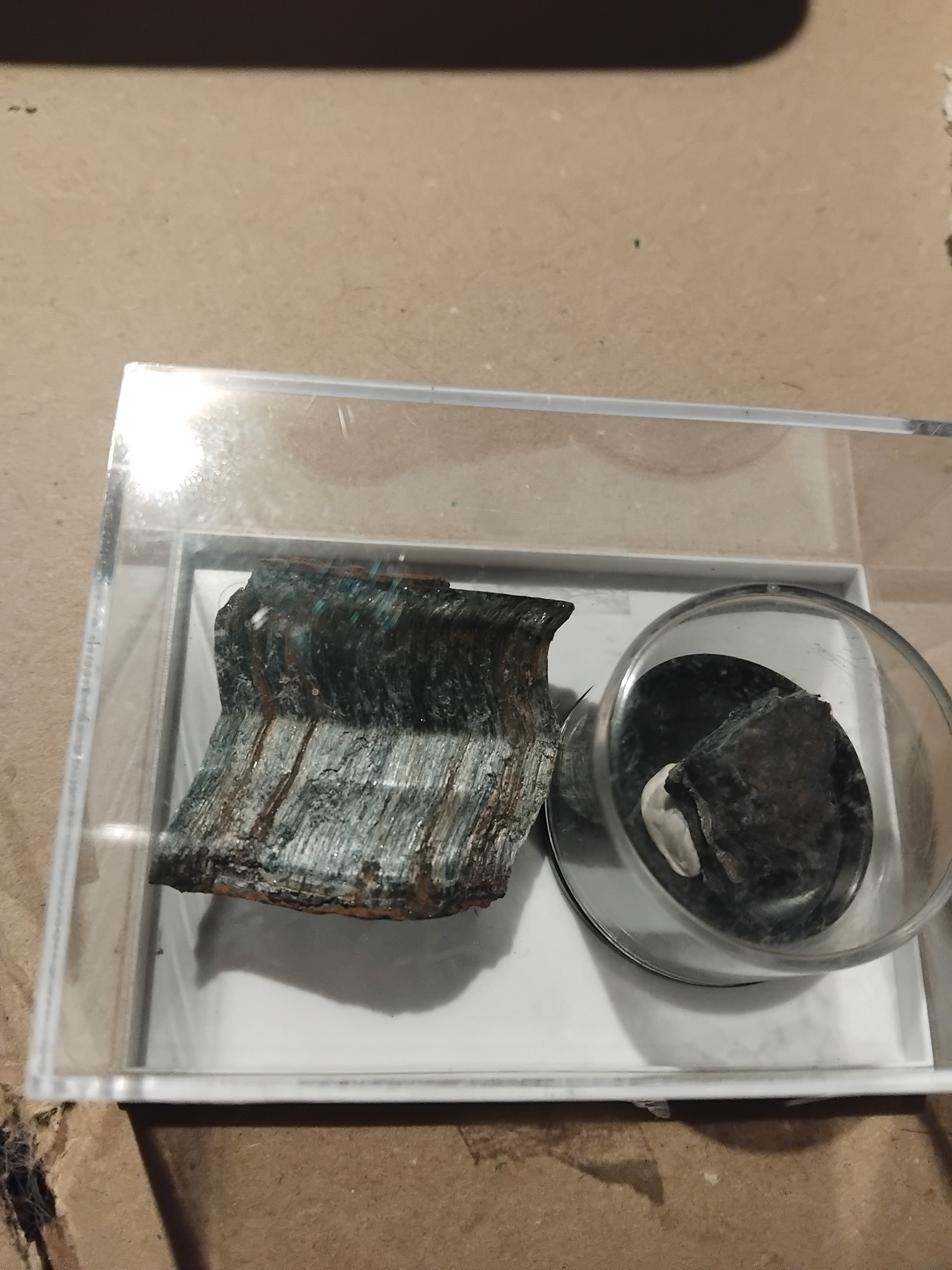 Malheureusement je la manipulais à plusieurs reprises à main nue et sans masque (par la gangue à chaque extrémité, je crois) et elle était dans une boite de rangement en plastique sur un lit de coton, avec d'autres minéraux. Une boite qu'il m'arrivait d'ouvrir pour les regarder.