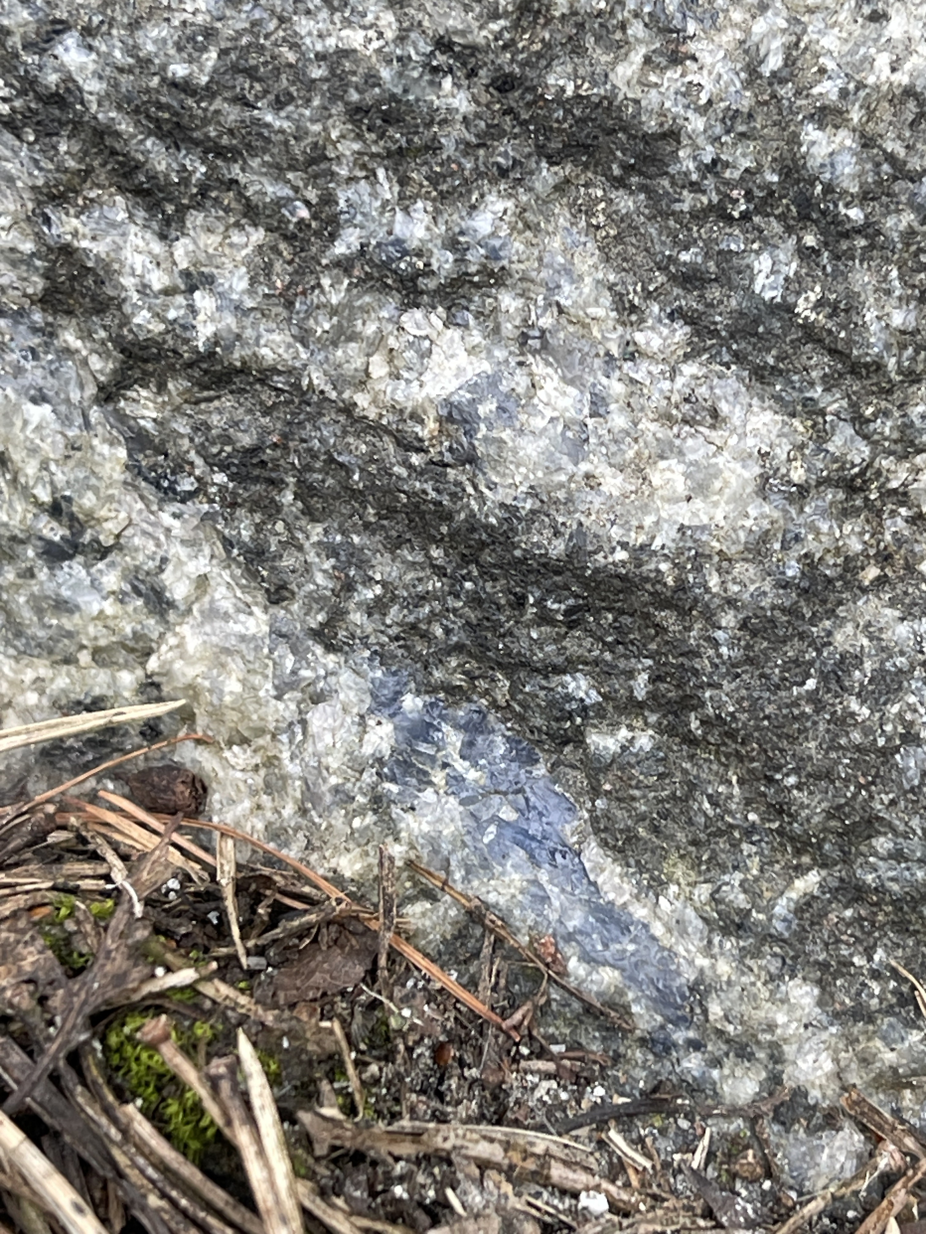 Voici ce qui m'a étonné : la couleur bleuté. Je pense que c'est du quartz, le blanc c'est du feldspath.il y a des biotites aussi sur la photo.