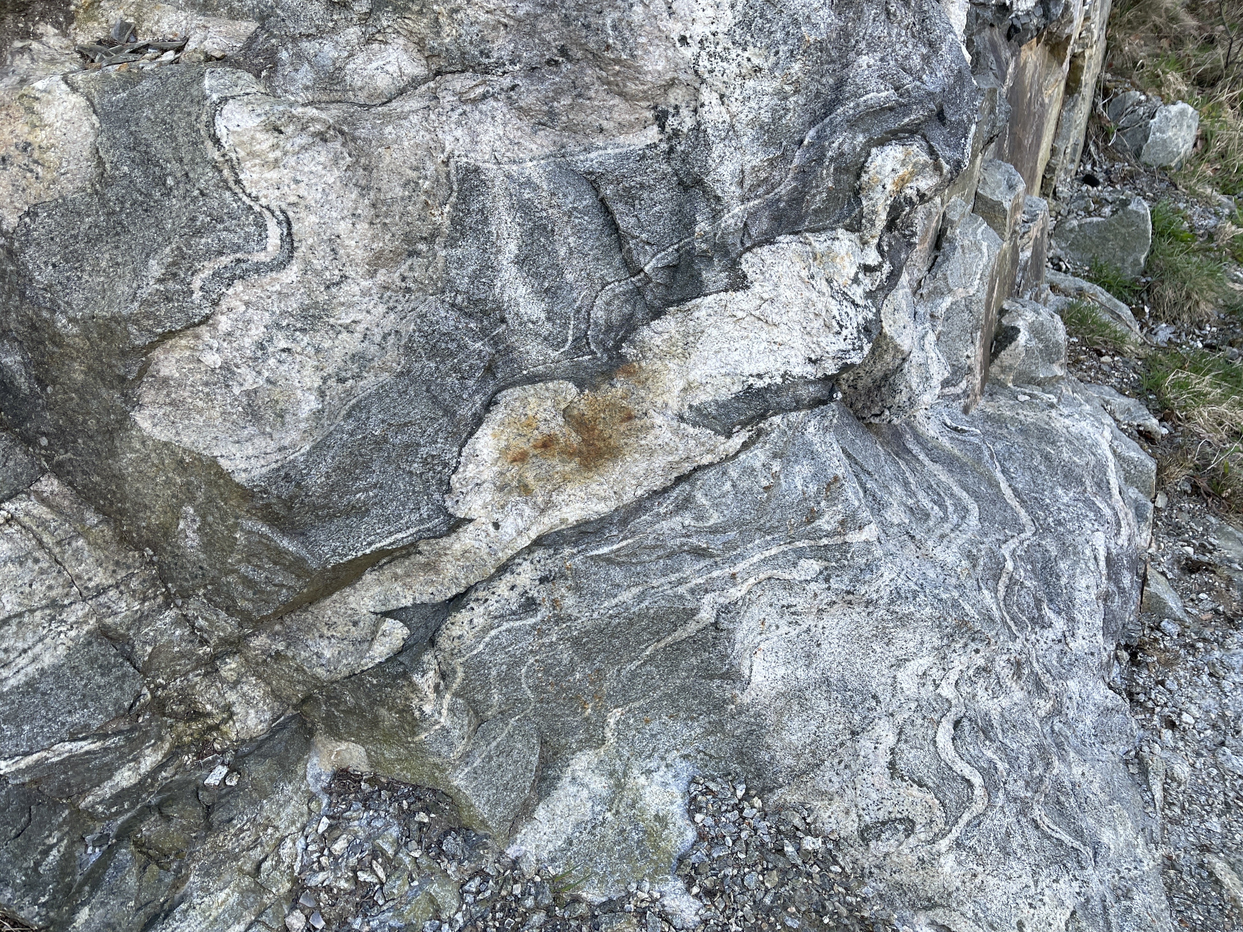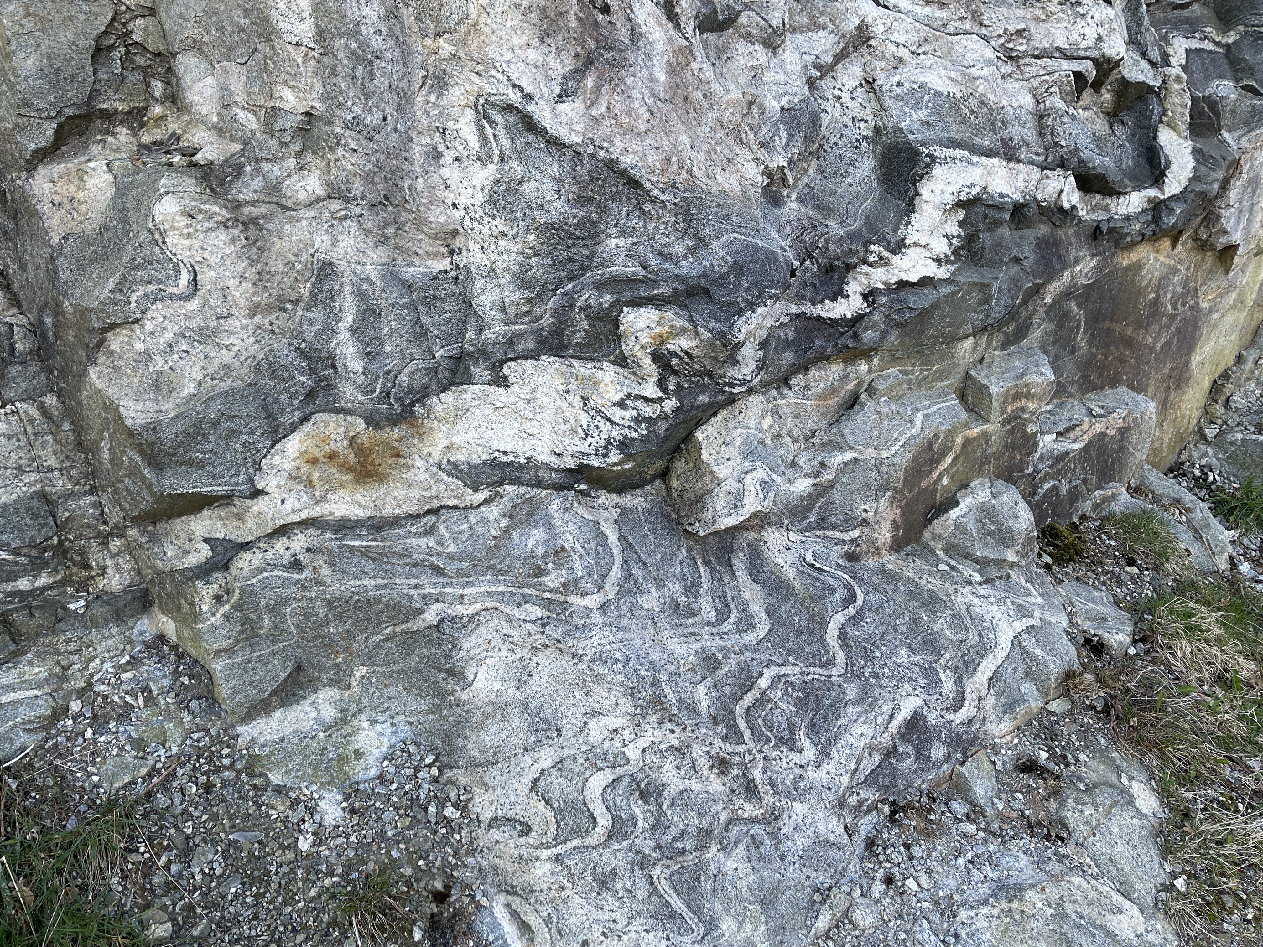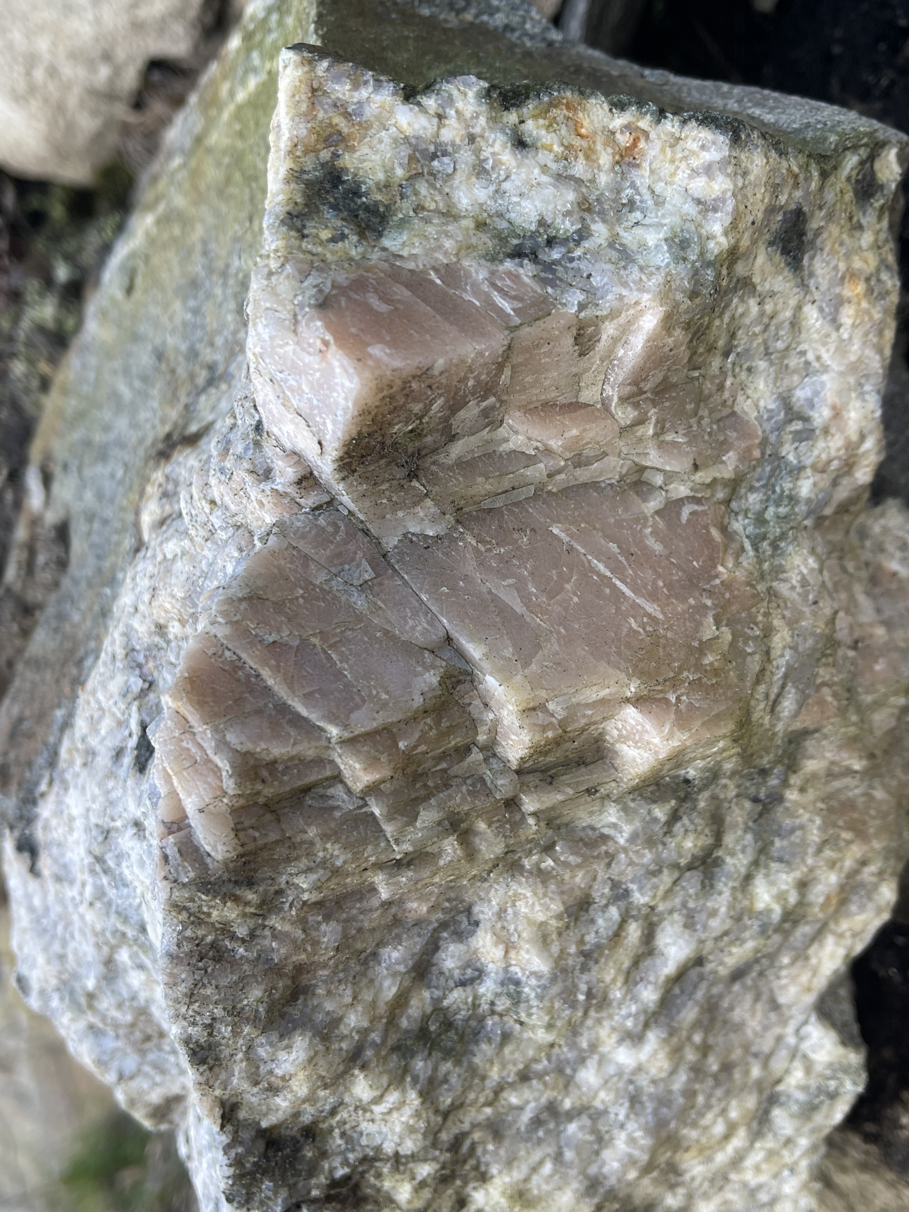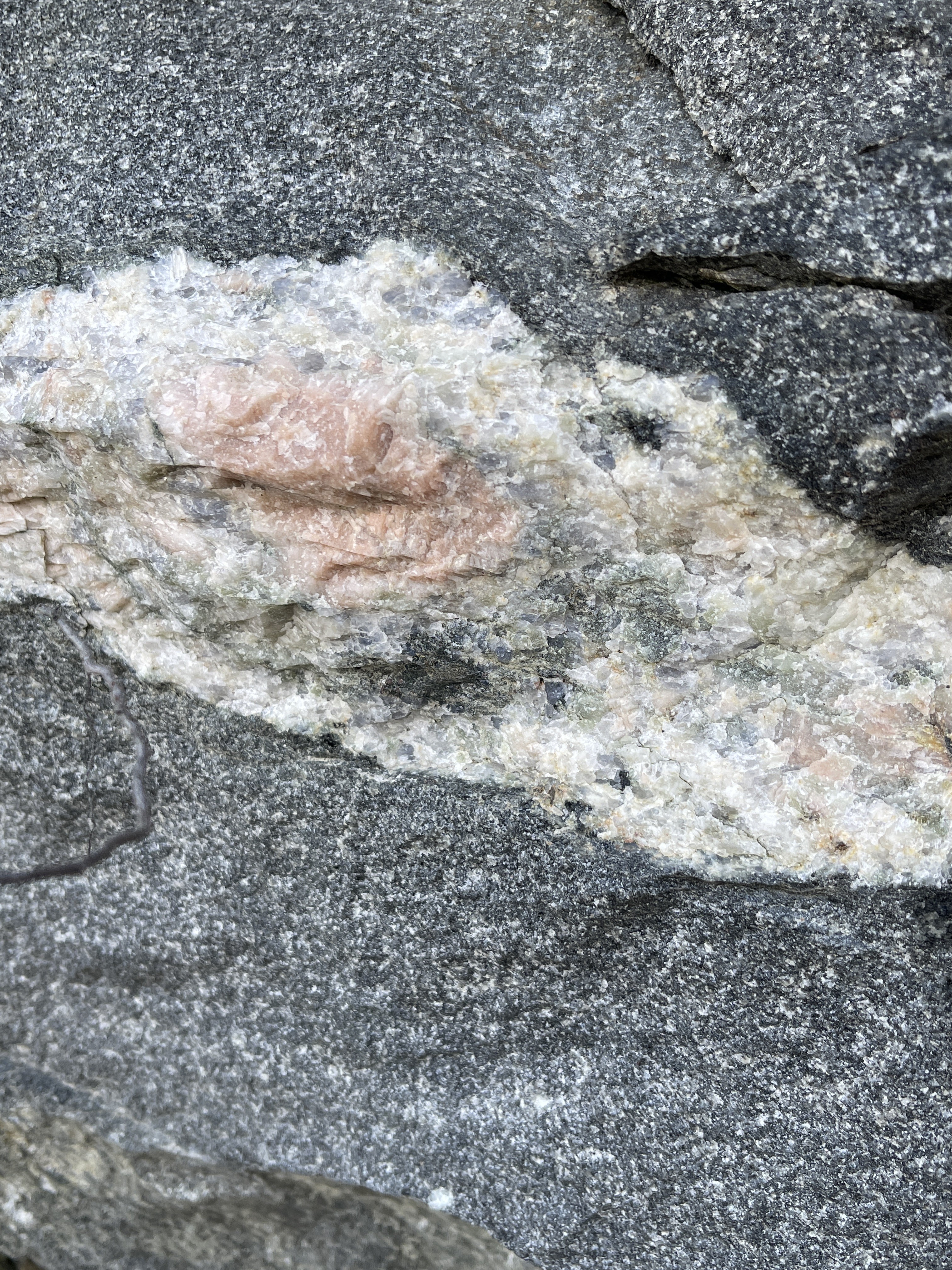 ce sont des "filons" de pegmatite, je mets entre guillemets part prudence. Cette photo montre un grand cristal de feldspath avec ces cristaux bleutés que je pense être du quartz.