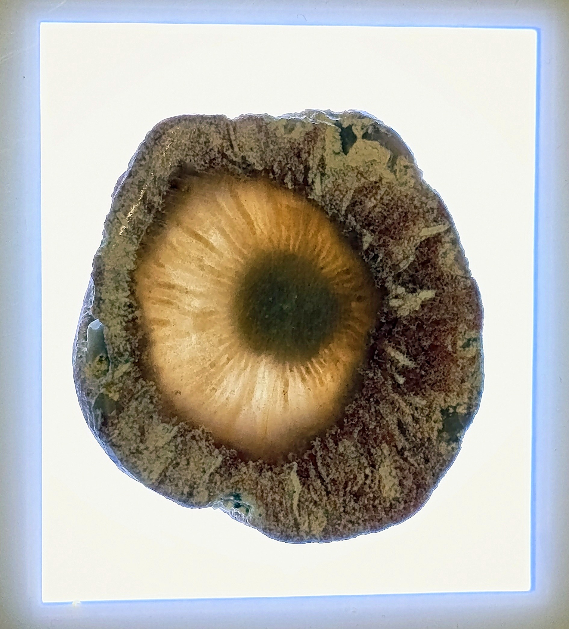 il m'a donné cette tranche de spongiaire trouvée à Antifer qu'il a coupé et poli. L'intérieur rempli de calcédoine est du plus bel effet ....