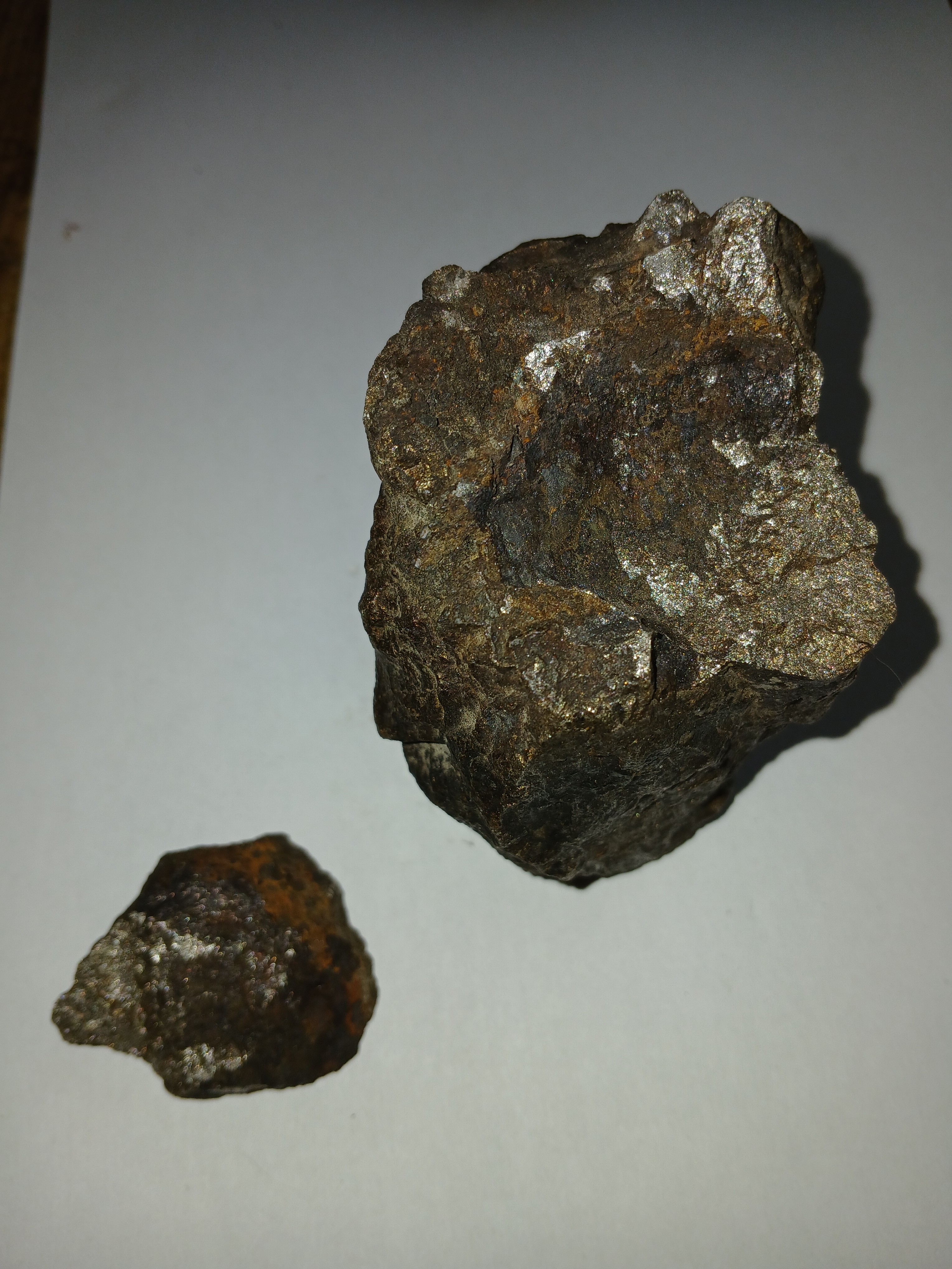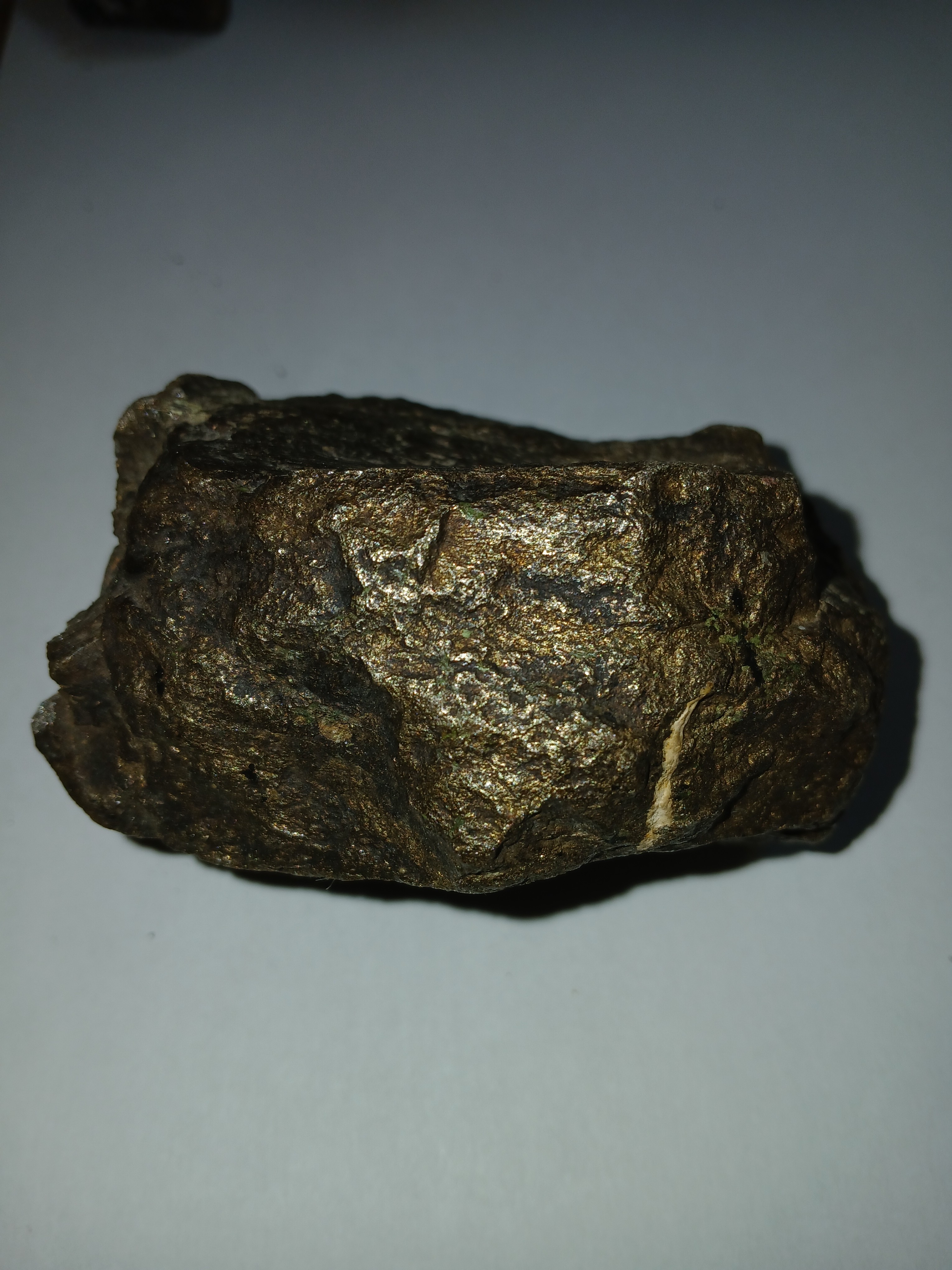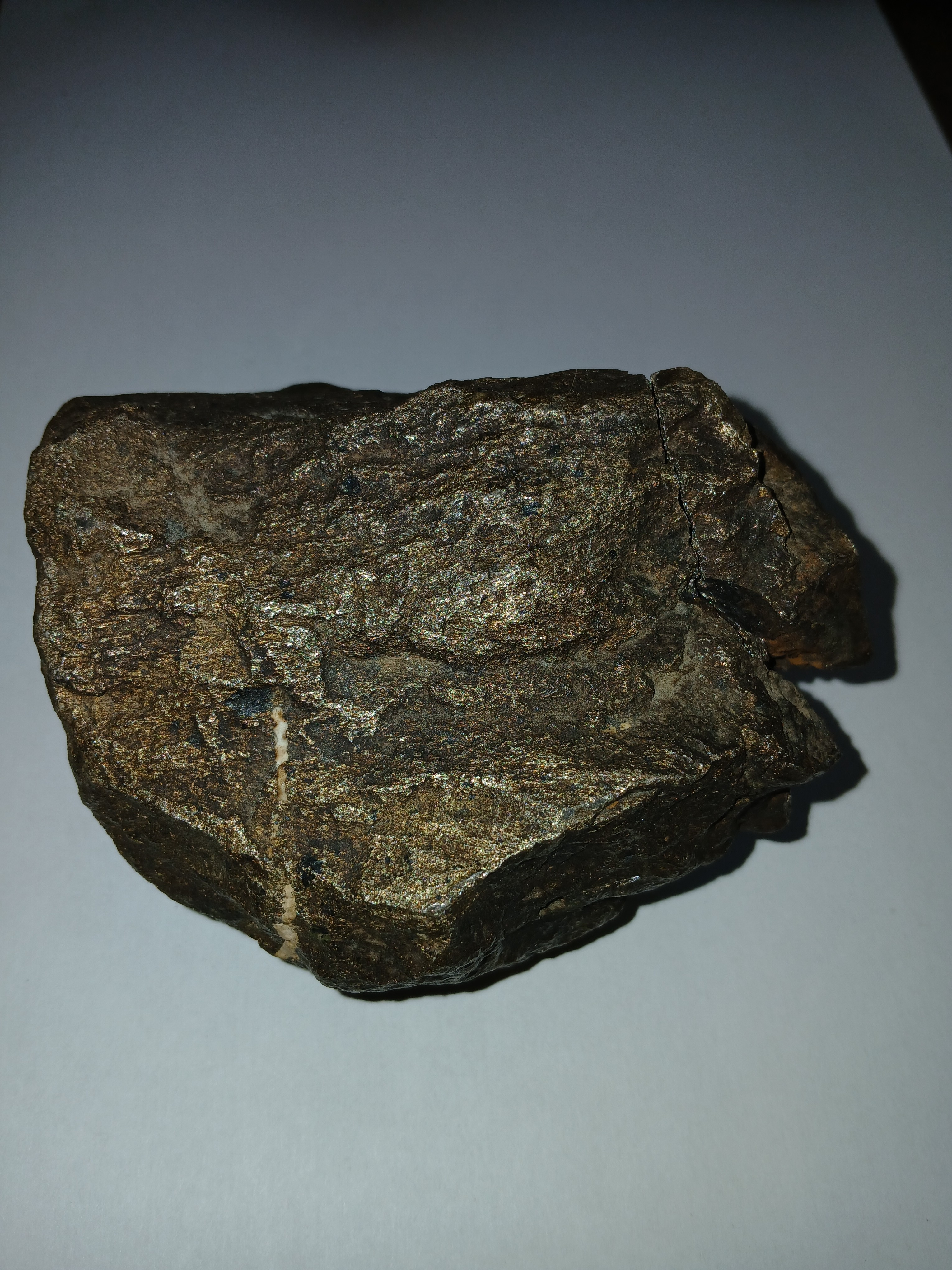 Je reviens vous exposer ce minéral , trouve en vallée du Rhône il y a plus de dix ans , 1495 gr pour 200 cm 3 , ne " répond" pas a l aimant .   Une cassure fraiche laisse en voir un peu plus