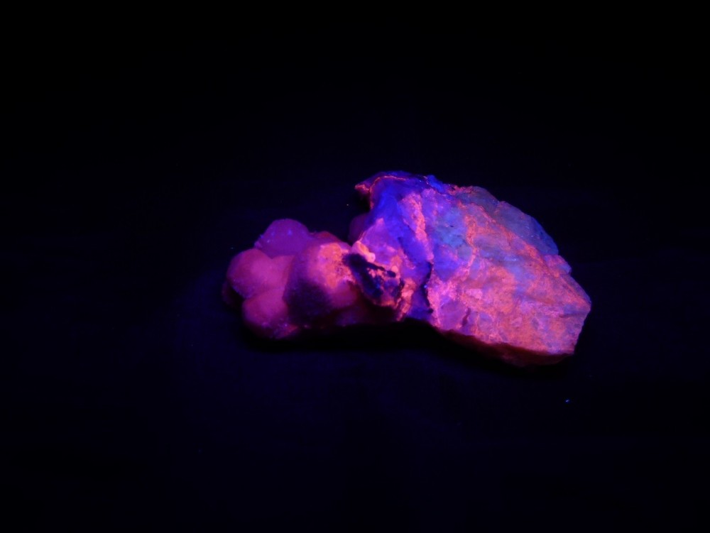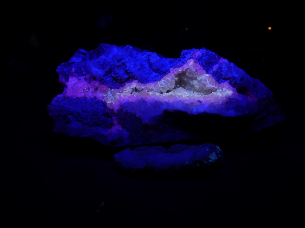 Je pense que la fluorescence rose est due à la présence de manganèse au sein de la maille du carbonate de calcium ; on pourrait donc parler de manganocalcite.