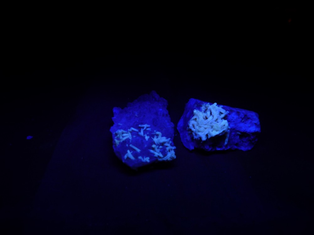 à titre de comparaison; un cristal de Scheelite de Chine (6cm) et une Powellite d'Inde (8,5cm) sous UV court. En réalité la Scheelite est plus blanche et la Powellite plus jaune.
