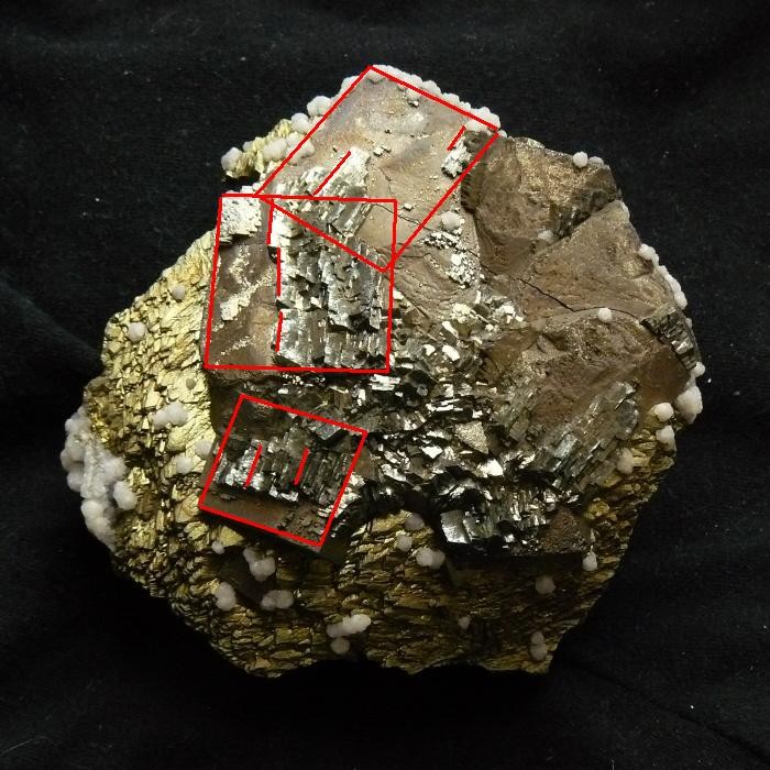 j'ai fait un shema qui montre plus clairement la disposition des arséno sur les pyrites,le shéma se répète 3 fois sur le cube,avec une rotation des arsénopyrites,c'est assez bizarre,on voit aussi que les arséno sont maclées en queue d'hirondelle ou quelque chose comme ça...