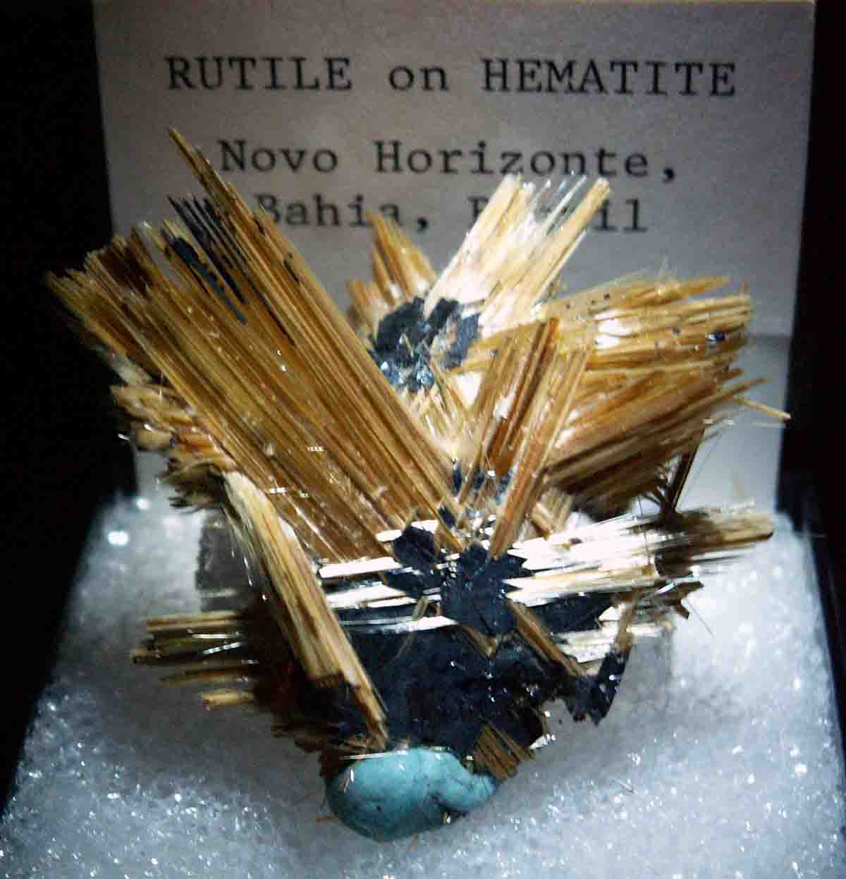 Le plus typique ce sont les épitaxies de rutile sur hématite, parfois le contraire "très rare : Eiffel (voir Mineral-Color), Madagascar je crois (voir LRM comte-rendu de SMAM 2007)" - Voir la photo sublimisime dans LRM °79 en haute page 30 on comprends très bien avec cette image ; si une personne peut demandr à RDAG ou à LD Bayle de mettre la photo ici pour illustrer....