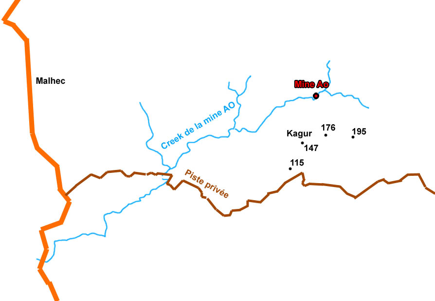 Pour commencer, voici l'accès à la mine... Attention, à pied c'est très long. Le plus rapide est de remonter la piste en 4X4 jusqu'au pied de la crête de Kagur, mais c'est une pise privée avec 2 propriétaires dont Monsieur Kogulé qui nous avait amené jusque là en 4x4. L'autorisation est indispensable.