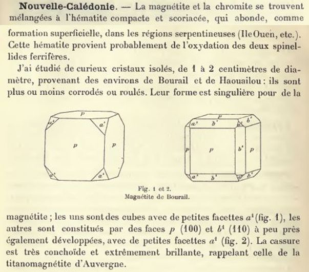 Pour finir, la magnétite est également connue dans les serpentinites de base des massifs, mais les cristaux présentent le faciès plus typique de l'octaèdre et sont en roche.