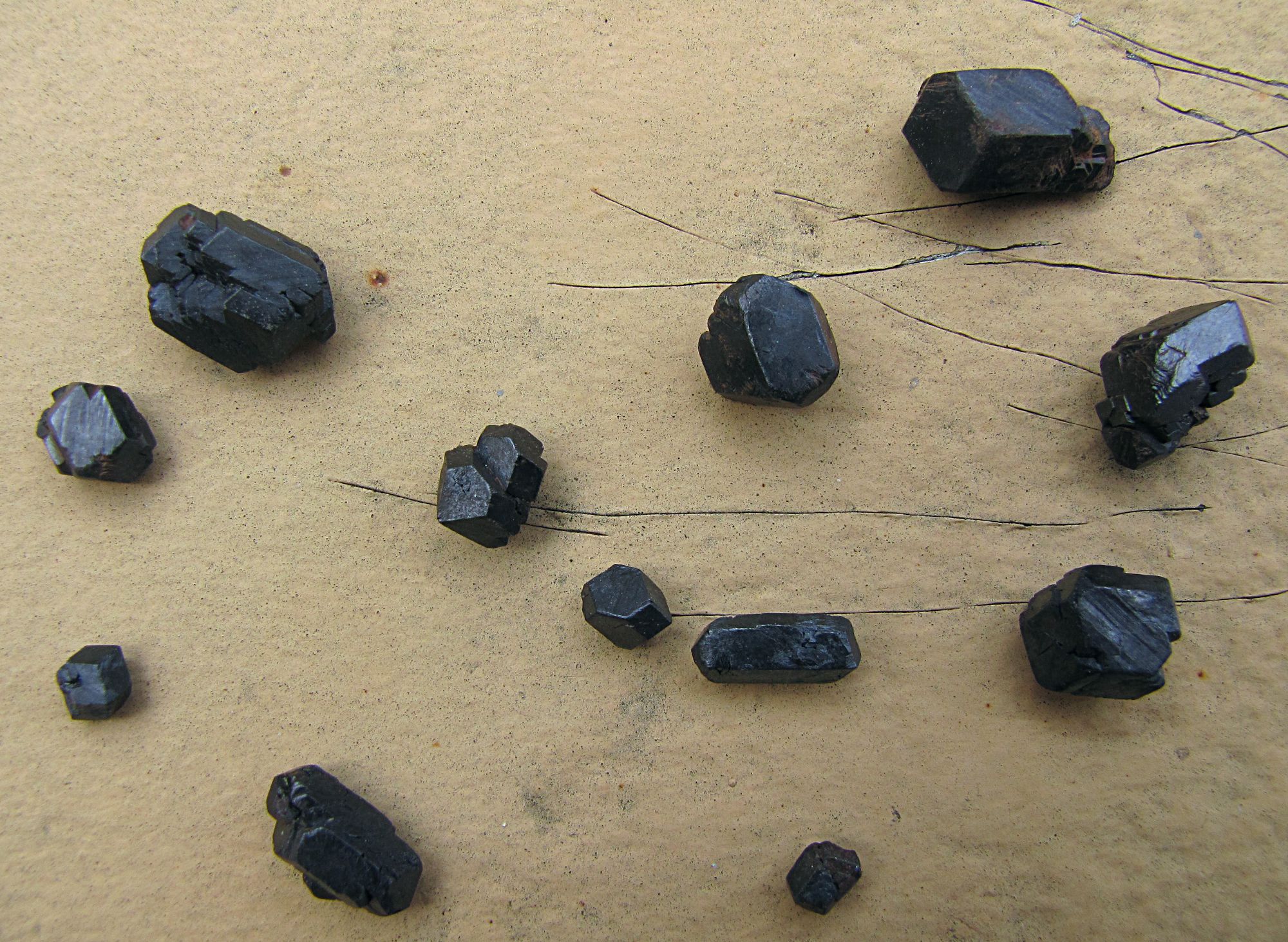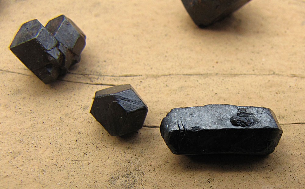 Tes nouvelles photos m'évoquent par contre complètement autre chose. J'avais déjà un doute sur la première photo en voyant les accolements et la forme générale des cristaux. Ça me semblait un peu écrasé suivant une direction, mais comme ça peut arriver avec des magnétites ça ne m'a pas choqué. Mais maintenant que tu en montres à nouveaux, tes bâtonnets m'orientent fortement vers de l'augite. Quasiment tous les échantillons que tu présentes s'écartent au moins légèrement de la symétrie cubique. J'imagine que tu as très bien fait ton identification (pas de clivage, magnétisme, trace, dureté et densité...) et que tes cristaux sont effectivement de la magnétite mais ta forme extérieure est typique, pour ne pas dire ultratypique de l'augite. Si c'était le cas, tu es tombé sur un truc de malade : magnétite après augite. Je ne vois même pas comment un chose pareille pourrait se former.