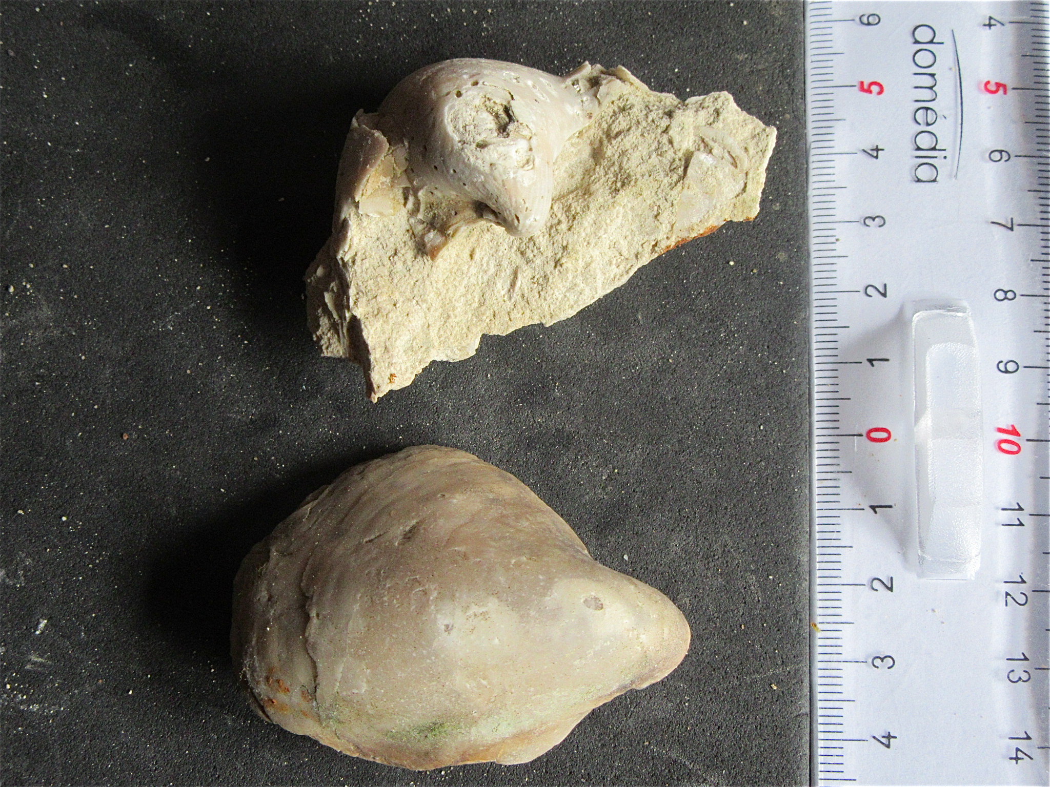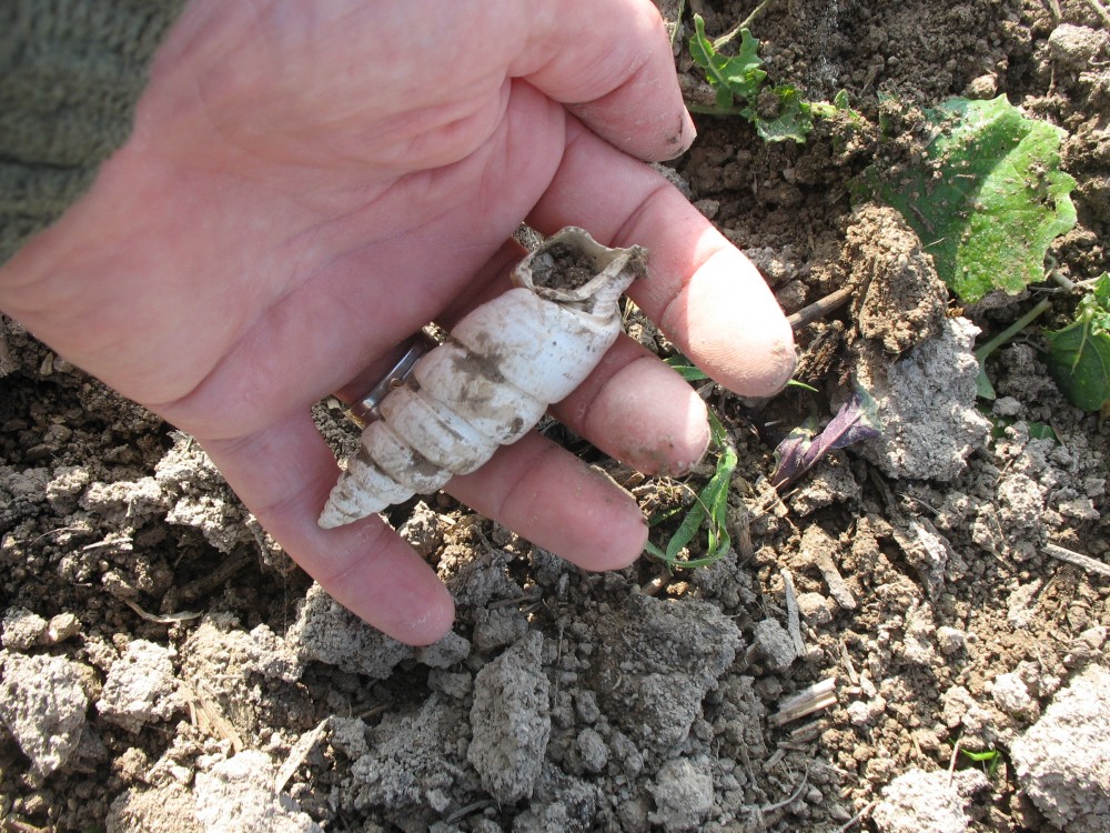 Le Bezanconia spirata était dans un passage de roue de tracteur ! Incroyable ! C'est le plus beau que j'aie jamais trouvé. Quasiment intact. Tous les autres avant lui étaient cassés et on ne voyait jamais l'ouverture. Là, l'ouverture est très légèrement mutilée, mais bon, je ne vais pas faire la fine bouche.