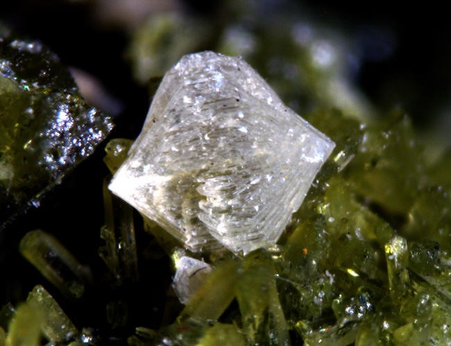 C'est un cristal flottant de (5 x 3 cm) les nodules blancs sont des morceaux de gangues recouverts de byssolite, les petits cristaux blanc ne sont des quartz, mais de petites adulaires ou albites et il y a effectivement quelques micros épidotes.