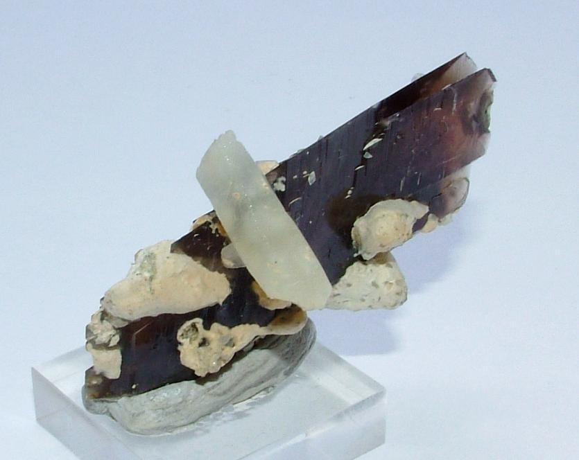 Voici un peu dans le même style une Axinite de la Balme 5cm (Déjà montrée) transpercée par un petit quartz tout déformé et corrodé.