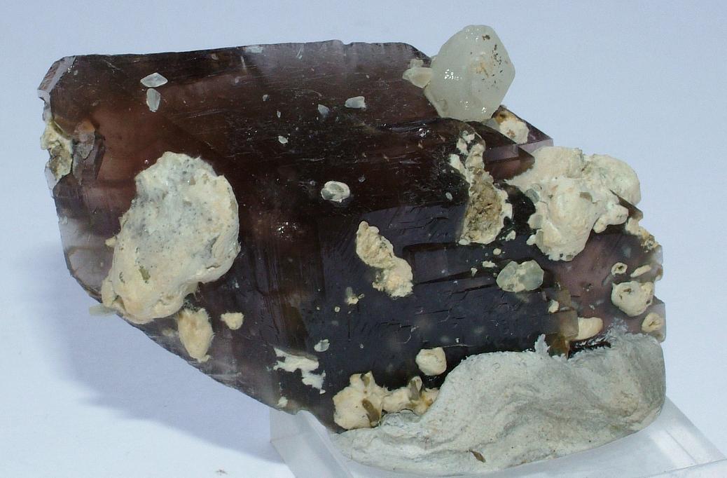 À rien, ou à quelque chose qui aurait poussé entre, et en même temps, que d'autres cristaux… des cx de calcite, par exemple… après, restent les inclusions qui lui confèrent cette teinte trompeuse… mais je crois deviner, juste un peu en-dessous, sur la gauche, un petit cristal (pyramide sommitale) de quartz de la même teinte ?