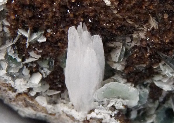 3eme un agrégat de pointes associées à l'amiante (coloration verdâtre), l'albite, la chlorite, la calcite et quartz