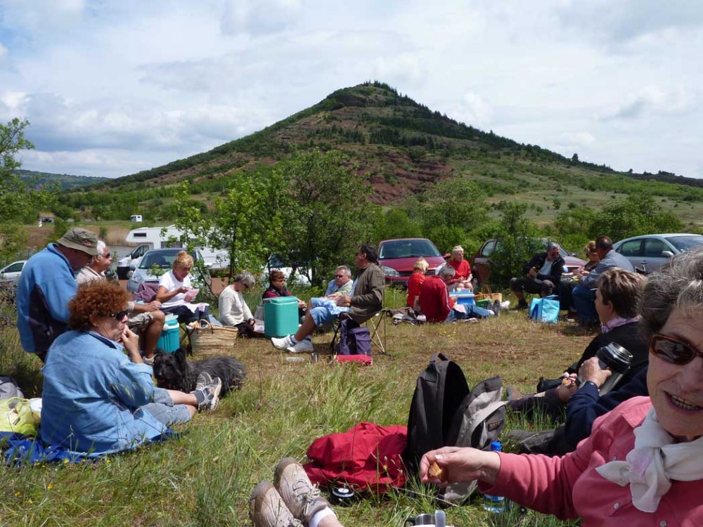 Bien sûr il y eut un moment pour casser la croûte, devant la Sure, colline de ruffe coiffée (belle inversion de relief) d'un reste de coulée de basalte quaternaire, avec orgues et tout le toutim (eau, pastis, olives...)