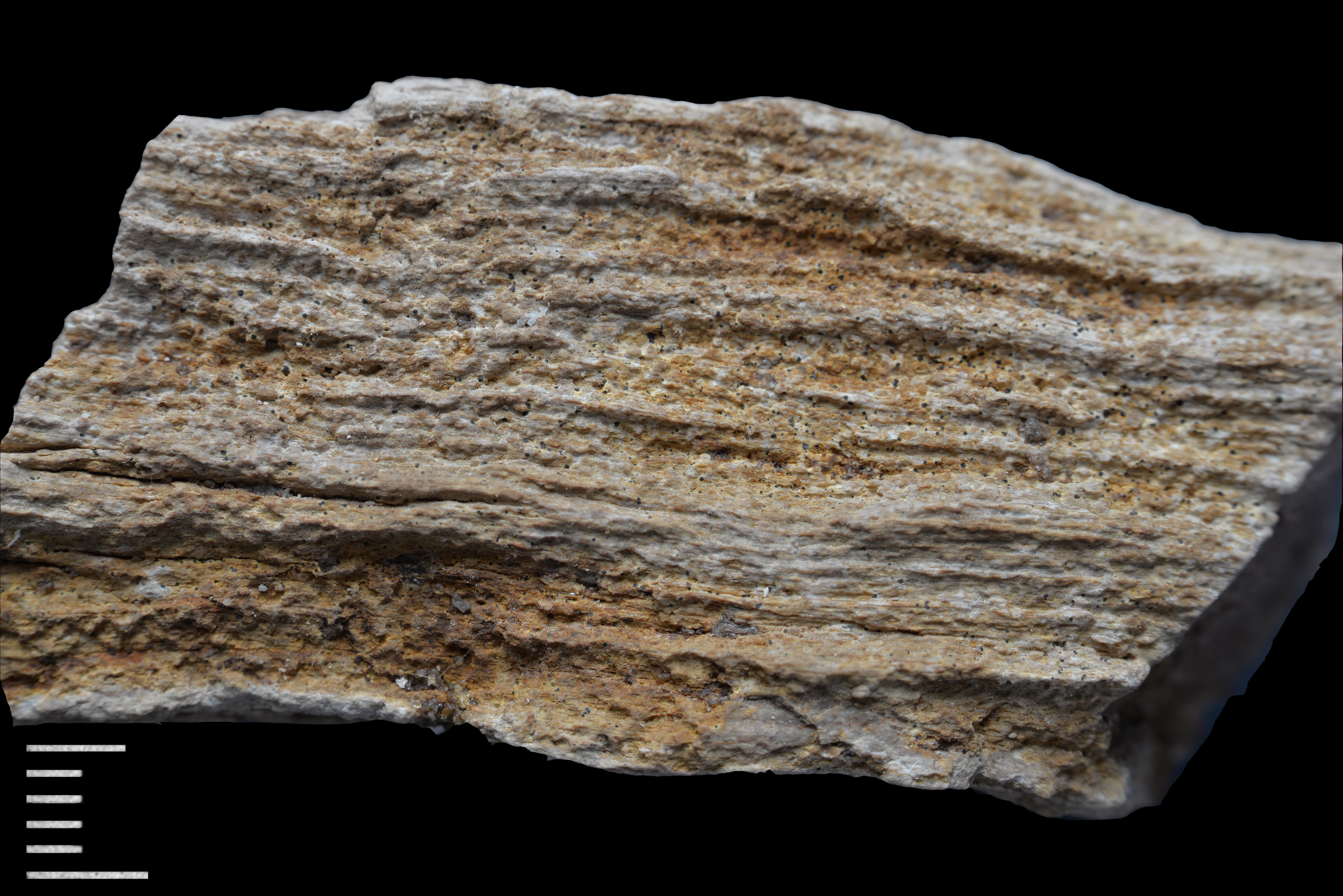 Gymnosperme probable du Callovien de Villers avec une structure intéressante (On voit une fine striation longitudinale, correspondant aux trachéides, cellules qui conduisent la sève, ainsi qu'une striation perpendiculaire correspondant aux rayons ligneux, c'est-à-dire des cellules qui assurent la conduction radiale.