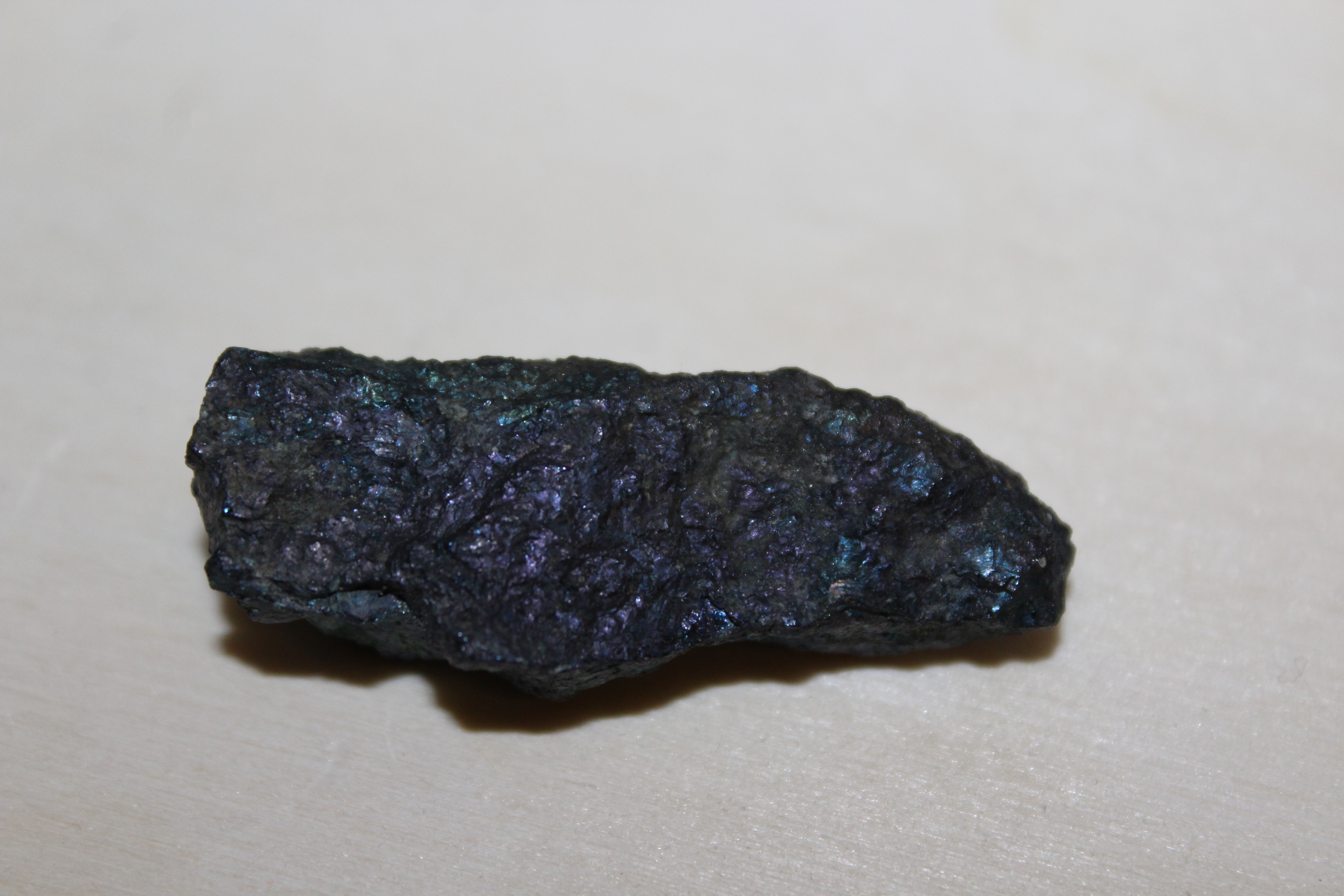 la bornite altérée présente une teinte verte mais un morceau massif sans altération est sombre, mauve foncé avec des reflets bleutés, la cassure laisse facilement une trace noire sur le doigt, un peu gras