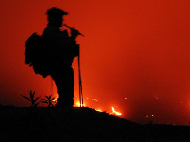 Ombre chinoise d'un Volcanologue (Juan Carlos Molina-Santana) jouant de la flute devant une coulée de lave du Pacaya (Guatemala)